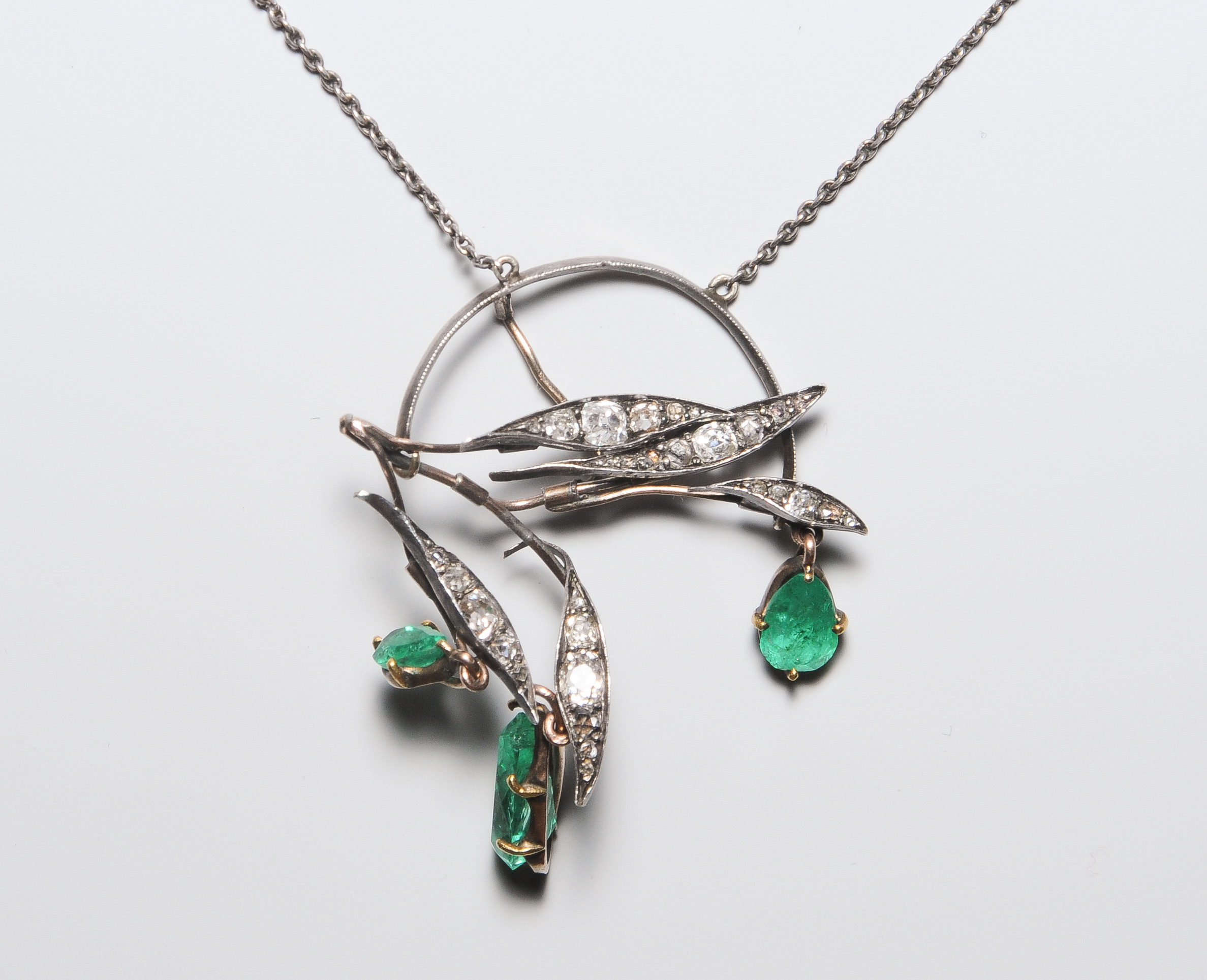 19.Jh. Silber. Floral mit 3 hängenden Smaragd-Tropfen, ca. 10x5/7x4 mm (1 Spitze def.). Blätter mit 29 Altschliff-Diamanten ca. 0.40 ct. L 46, 4,9 g.