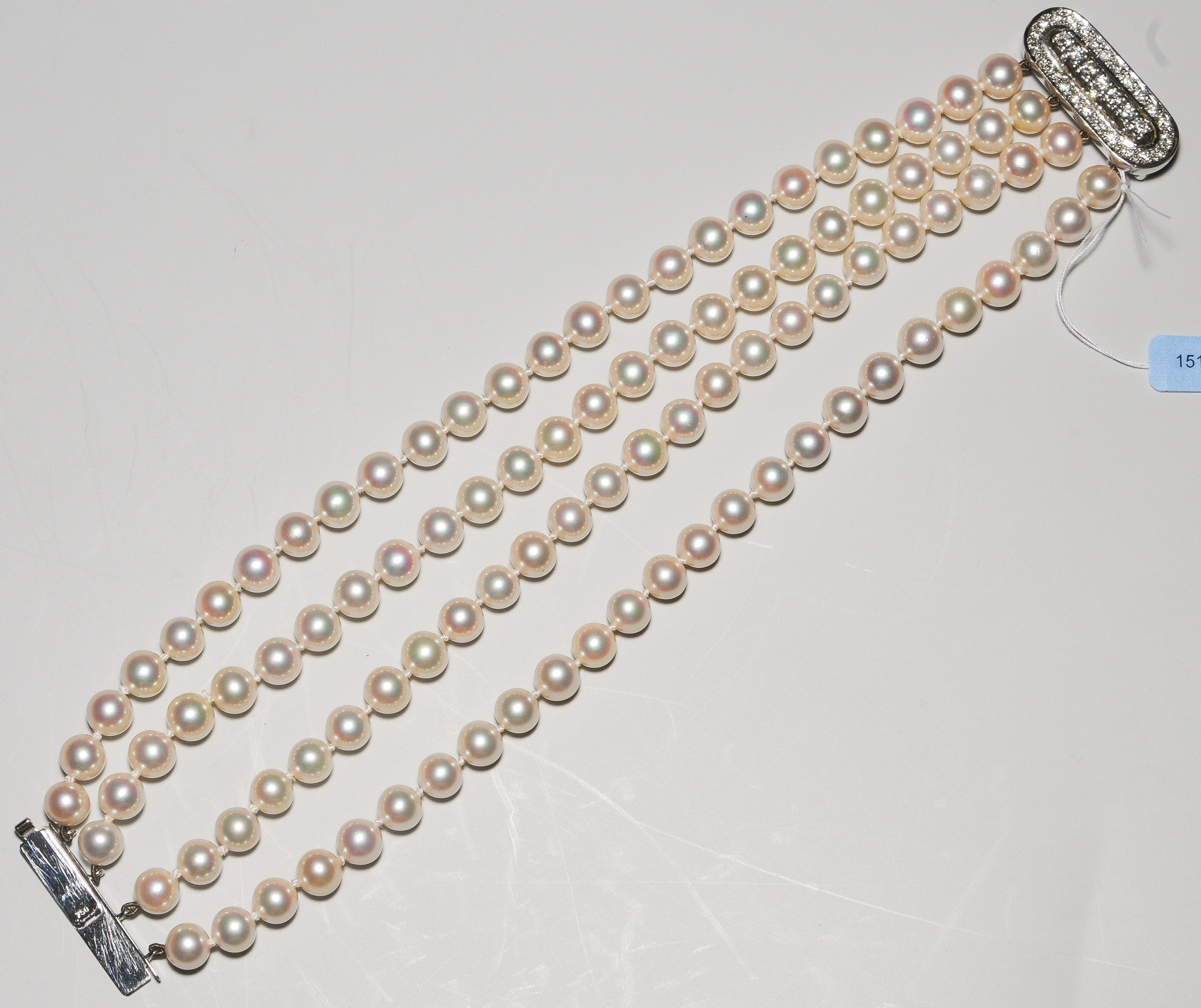 750 Weissgold. Vierreihig aus feinen Akoyaperlen je 6,5 mm Ø. Ovaler Brillant-Verschluss, ca. 0.30 ct. L 19 cm, B 2,5 cm.
