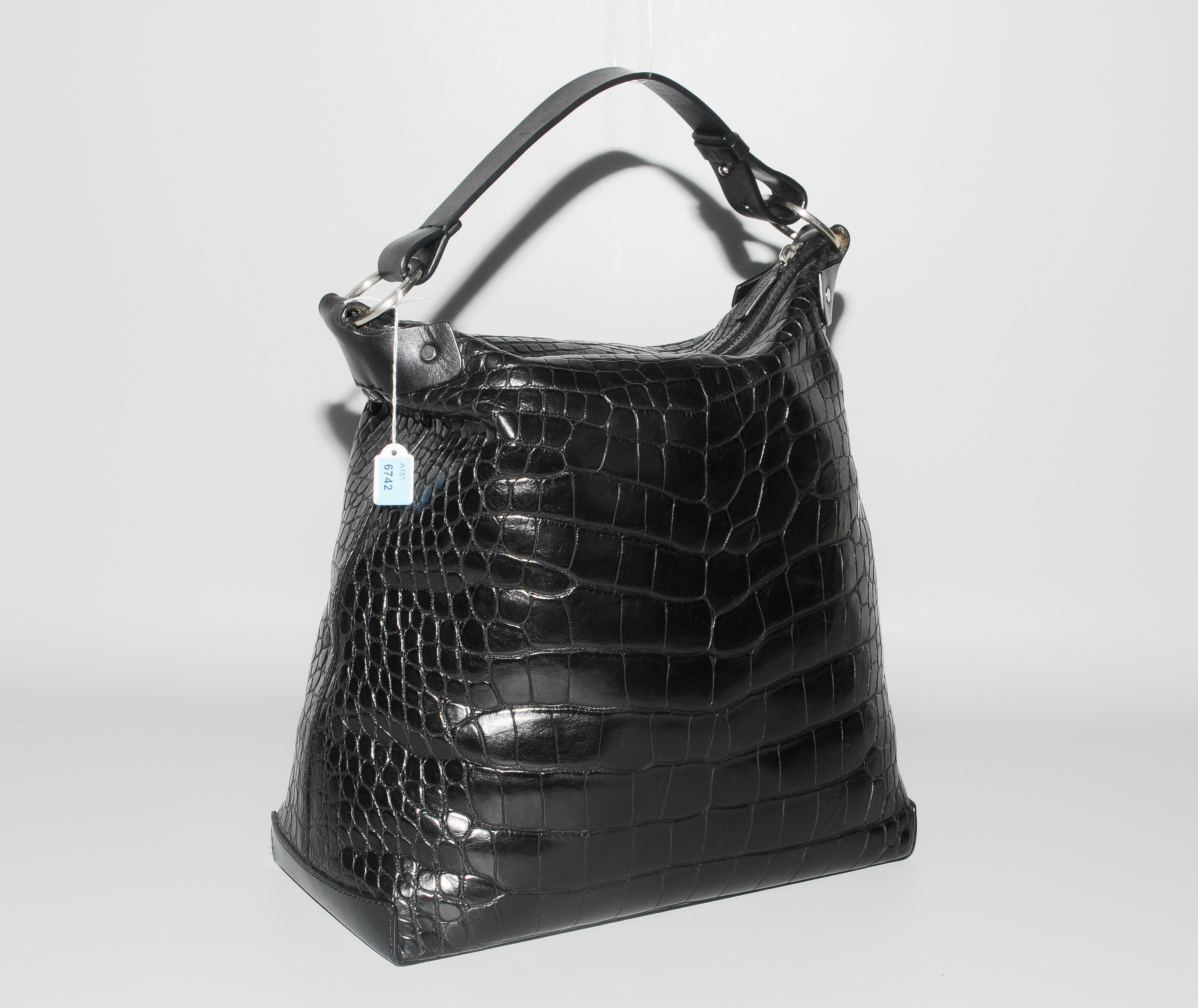 Aus schwarzem Alligatorleder. Henkel. Silberfarbene Metallapplikationen. Reissverschluss. 31x30x15 cm. Sehr guter Zustand.