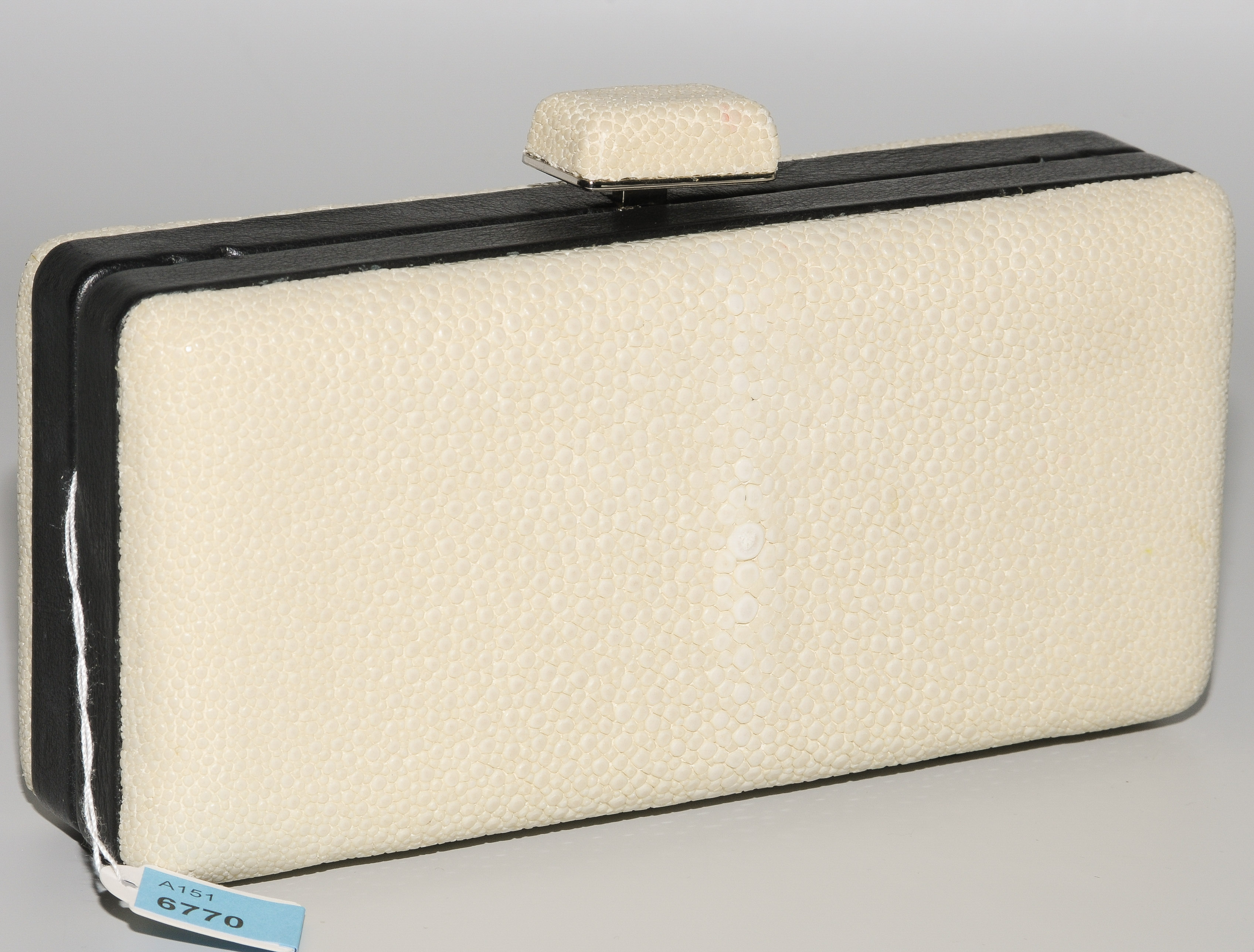 Aus cremefarbener Rochenhaut. Griff und Kettenriemen aus silberfarbenem Metall. 18x9x5 cm. Guter Zustand.