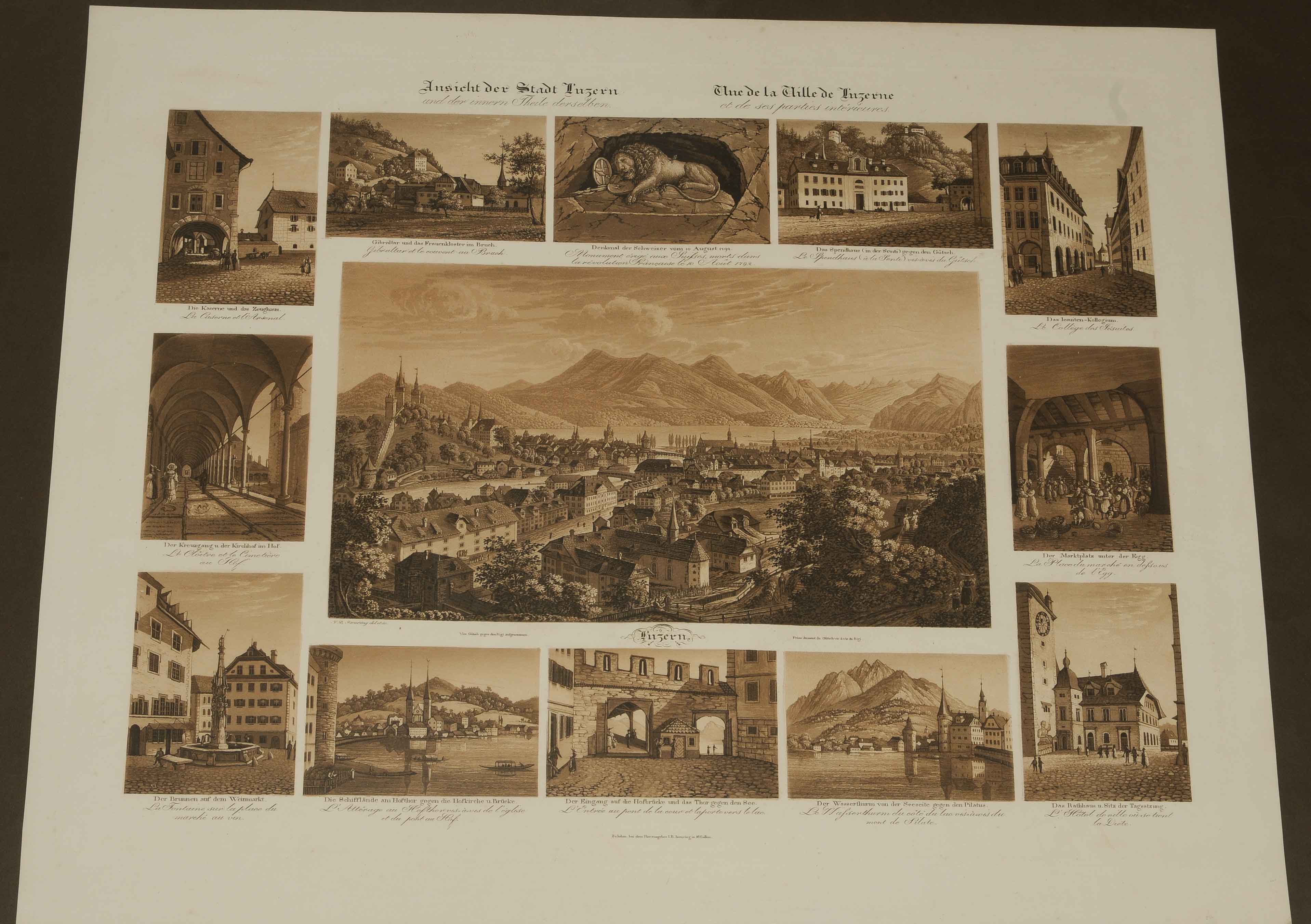 "Ansicht der Stadt Luzern und der innern Theile derselben". Zentrale Gesamtansicht, umgeben von 12 Detailansichten. Sepia-Aquatinta von J.B. Isenring, 1832. 36x48,8 cm.