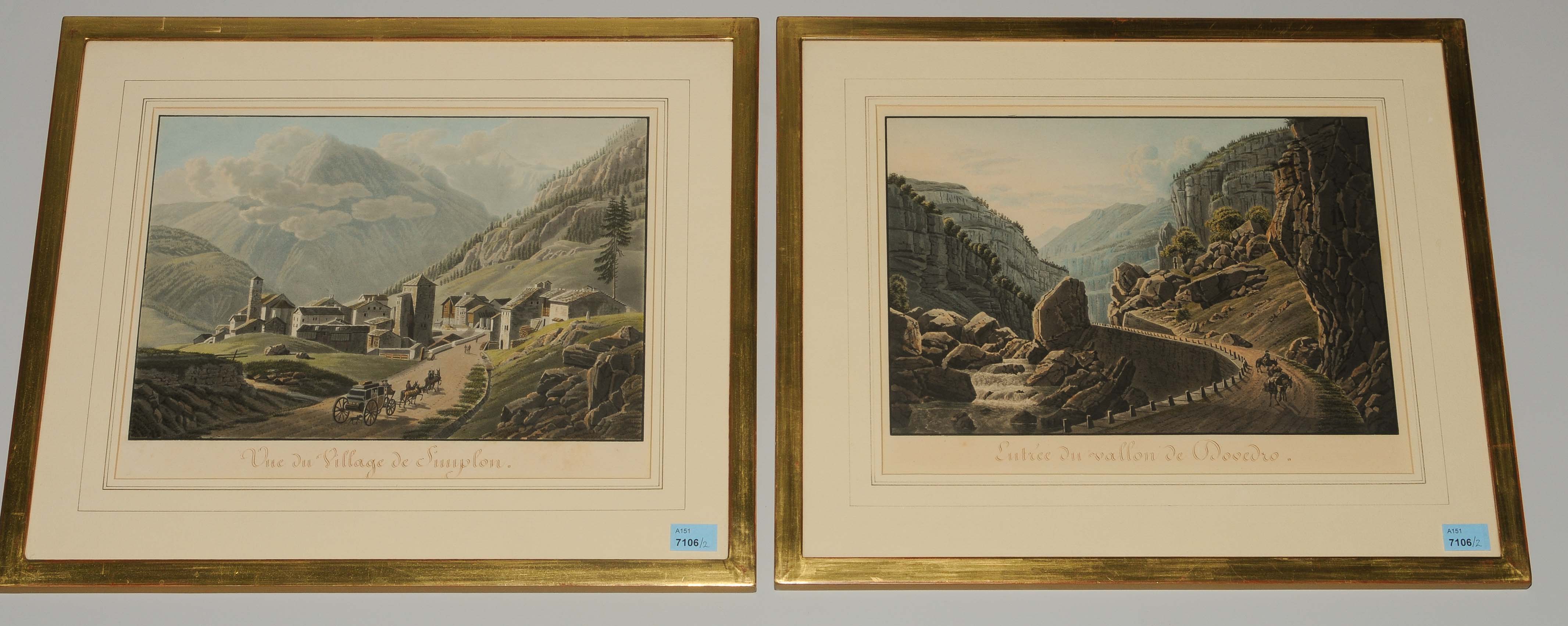 "Vue du Village de Simplon" / "Entrée du vallon de Dovedro". 2 kol. Aquatintas von G. Lory fils, 1811. Je ca. 19,5x28. Gerahmt.