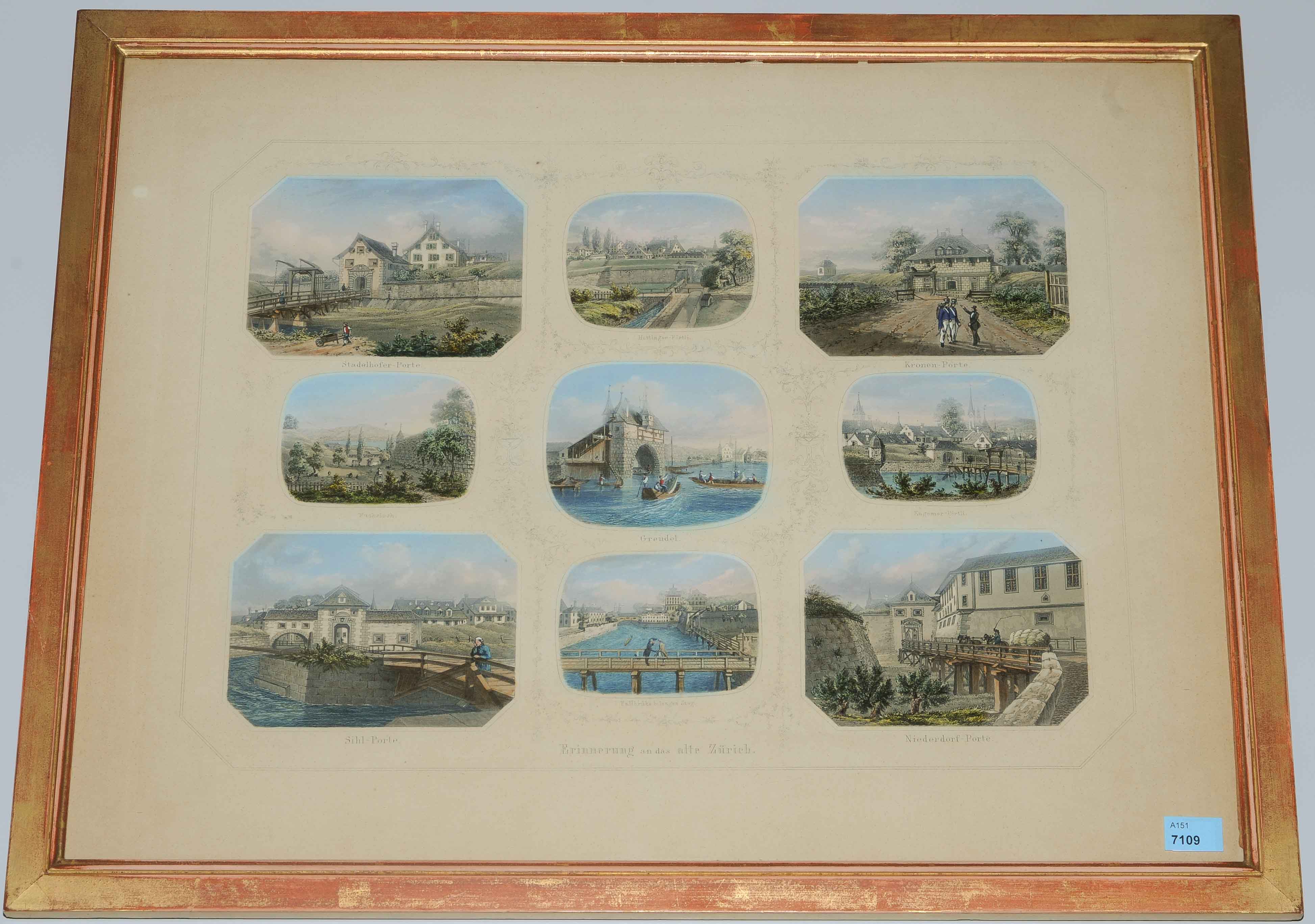 "Erinnerung an das alte Zürich". 9 Ansichten von Porten der Stadt Zürich auf einer Platte. Kol. Kupferstich, um 1860. 30,5x41,5 cm. Gerahmt.