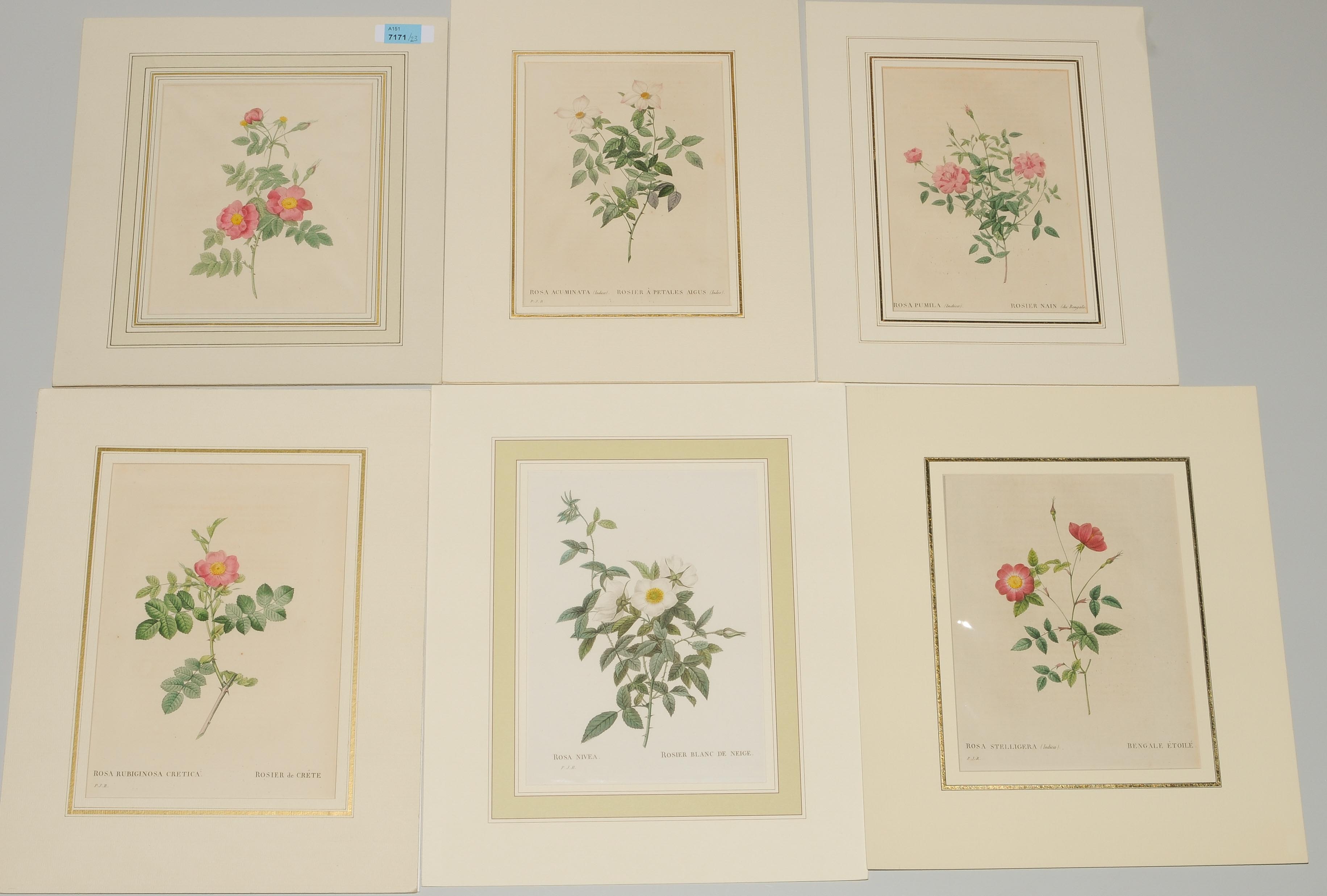 23 kolor. Farbkupferstiche nach P. J. Redouté. Aus: Redouté, Pierre Joseph. Les Roses. Paris: P. Dufart, 1828ff. 8° (kleine Ausgabe). - Alle Bll. (volle Buchseiten) unter Pp, sauber und gut erhalten.