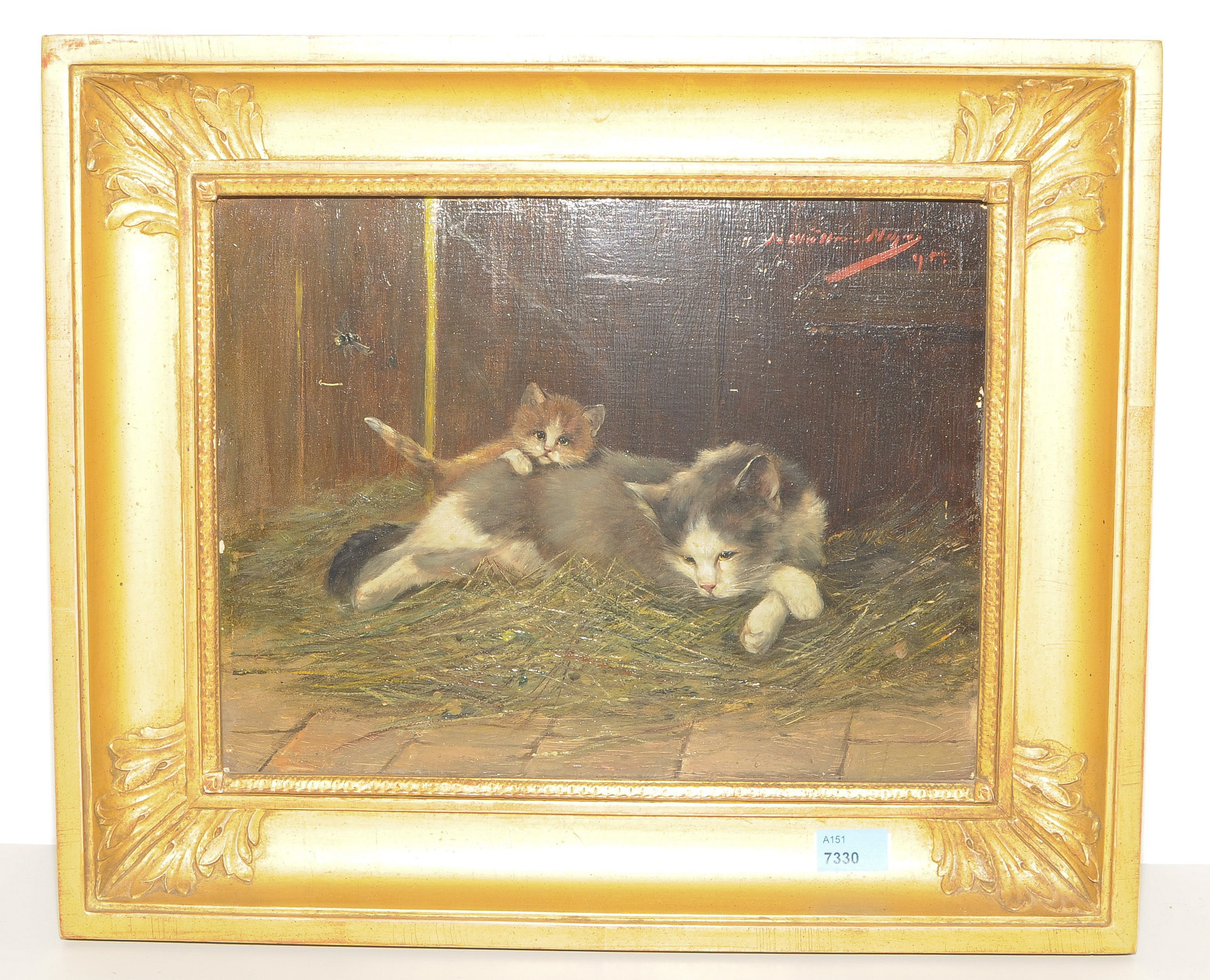 Katzen im Heu. 1895. Öl auf Holz. Oben rechts signiert und datiert. 20,5x27 cm.