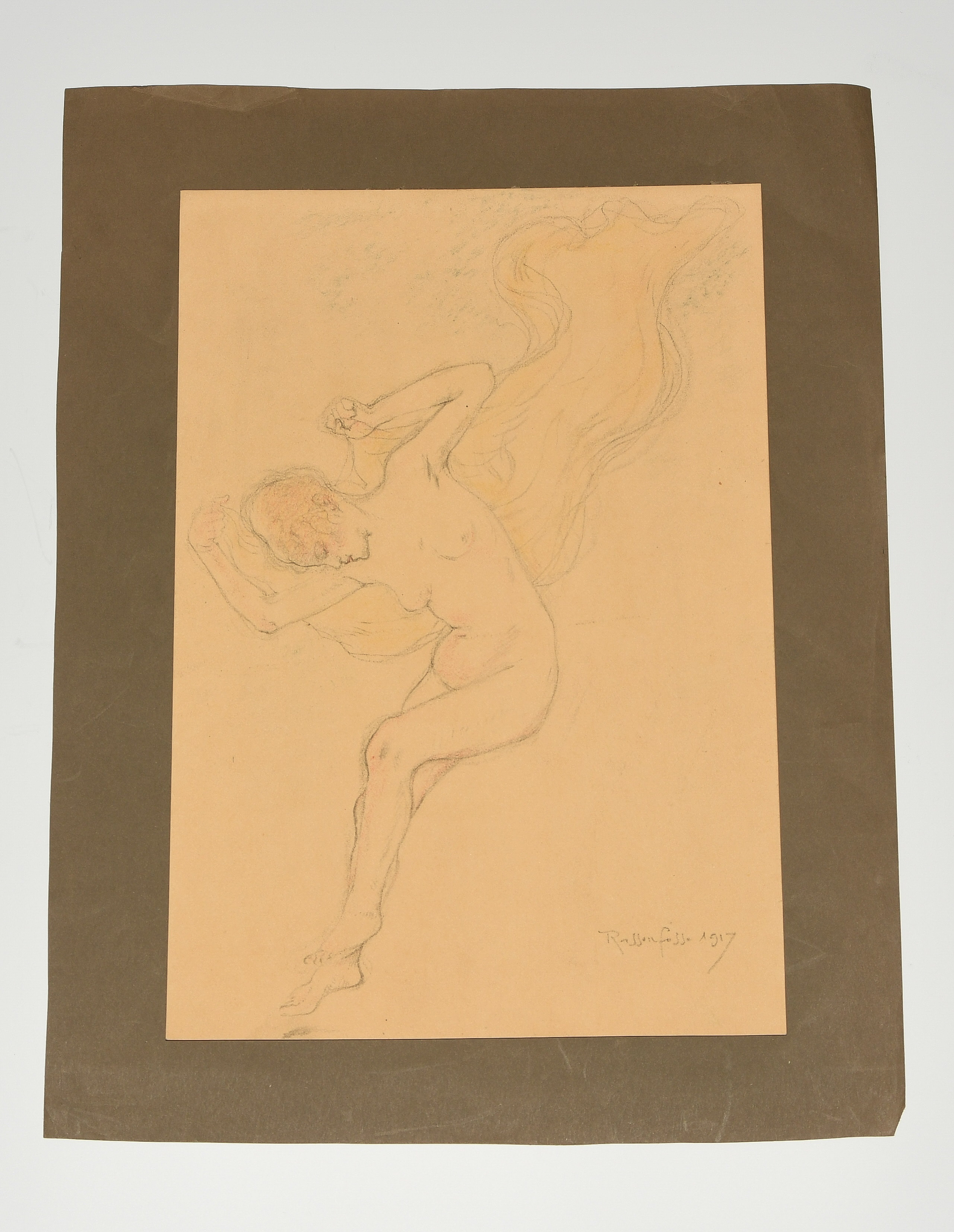 Tanzender, weiblicher Akt mit Tuch. 1917. Bleistift und Buntstift auf Papier. Unten rechts signiert und datiert. Blattgrösse 29,8x20,3 cm.