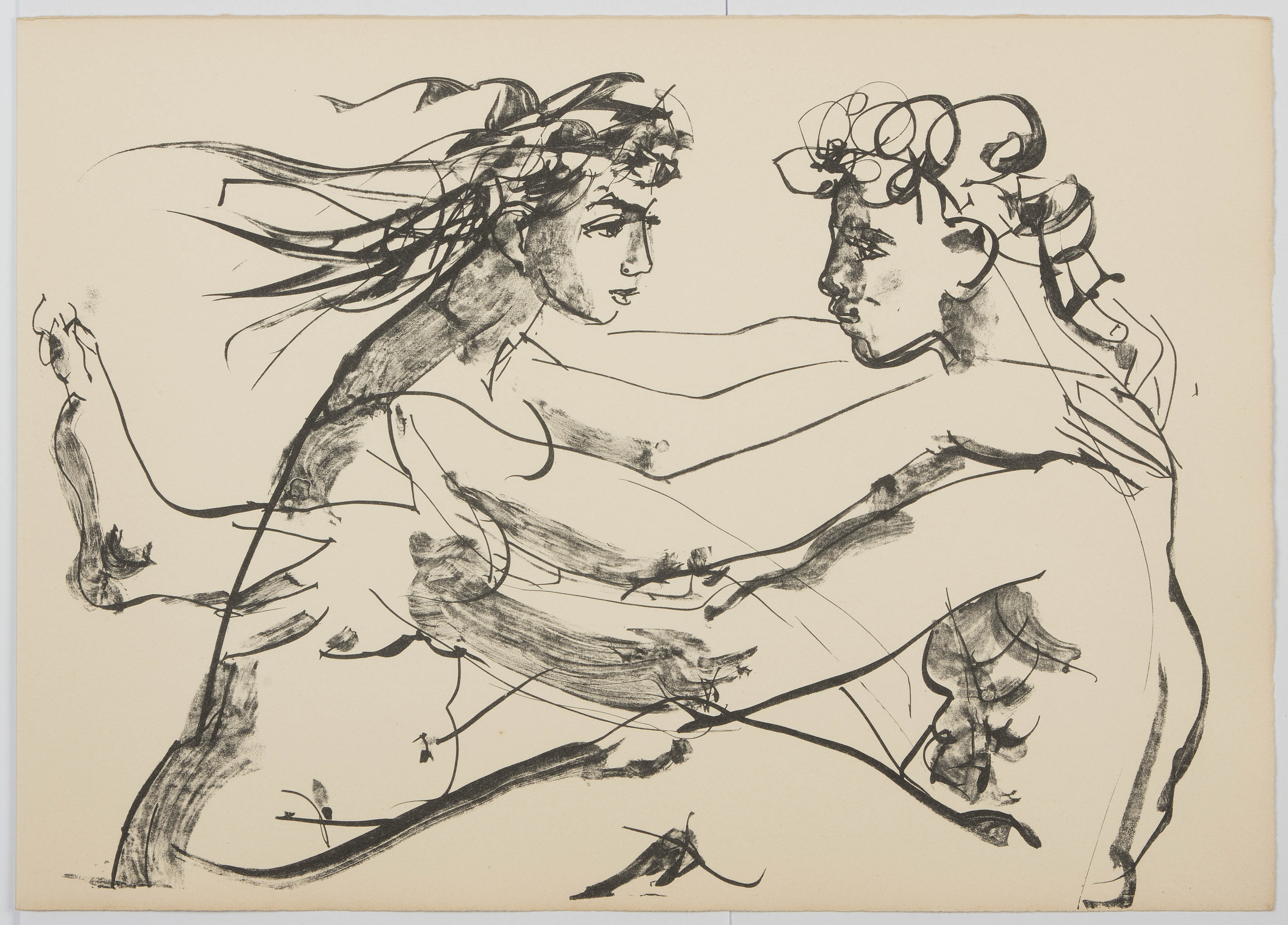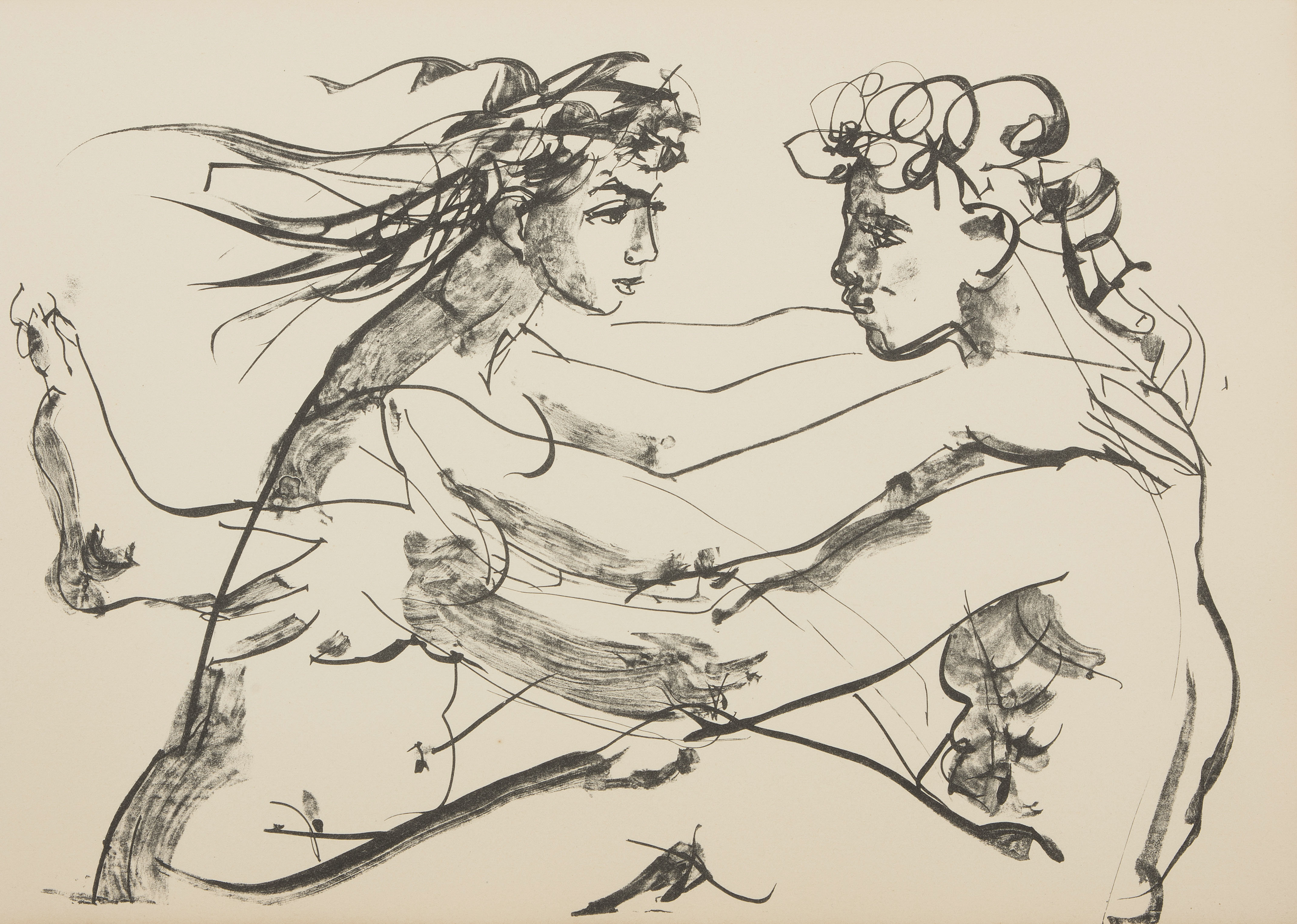 "Liebesgedicht". Lausanne André et Pierre Gonin, 1962. Qu.- Gr. 4°, 12 nn. S. Illustriert mit 3 ganzseitigen Orig.- Lithogr. von Hans Erni. Der von Erni handgeschriebene Text wurde im lithographischen Verfahren faksimiliert. Lose Bll. in Umschlag. Eins von 190 Ex. (GA 200). Von Erni und Gonin im Impressum signiert.