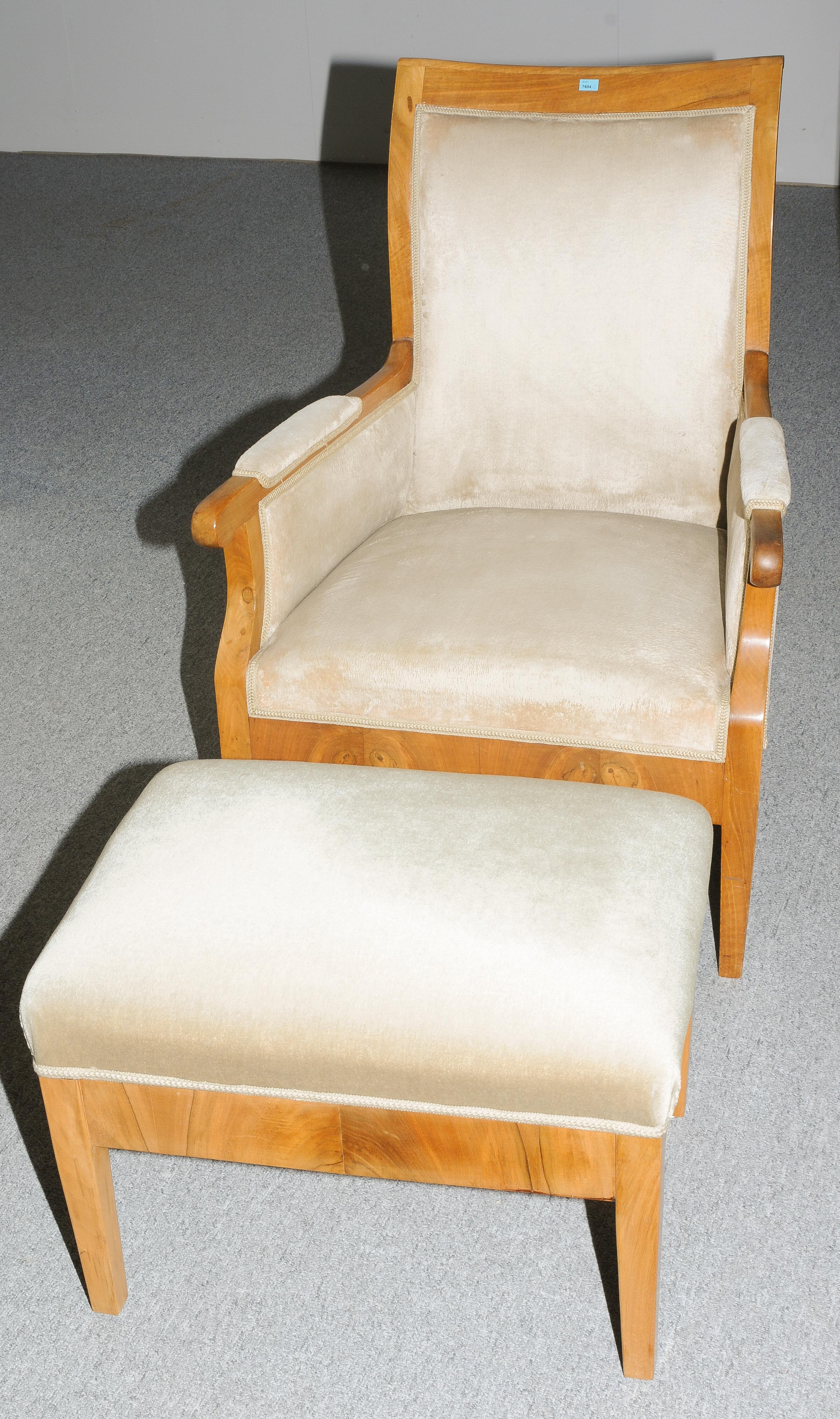 Biedermeier-Stil 20. Jh. Nussbaum. Trapezförmiges Gestell mit geschweiften Armlehnen, auf konischen Beinen. Bezug: Beige. Dazu passend ein Hocker: 56x41x40 cm. Gebrauchsspuren. 66x76x92 cm.