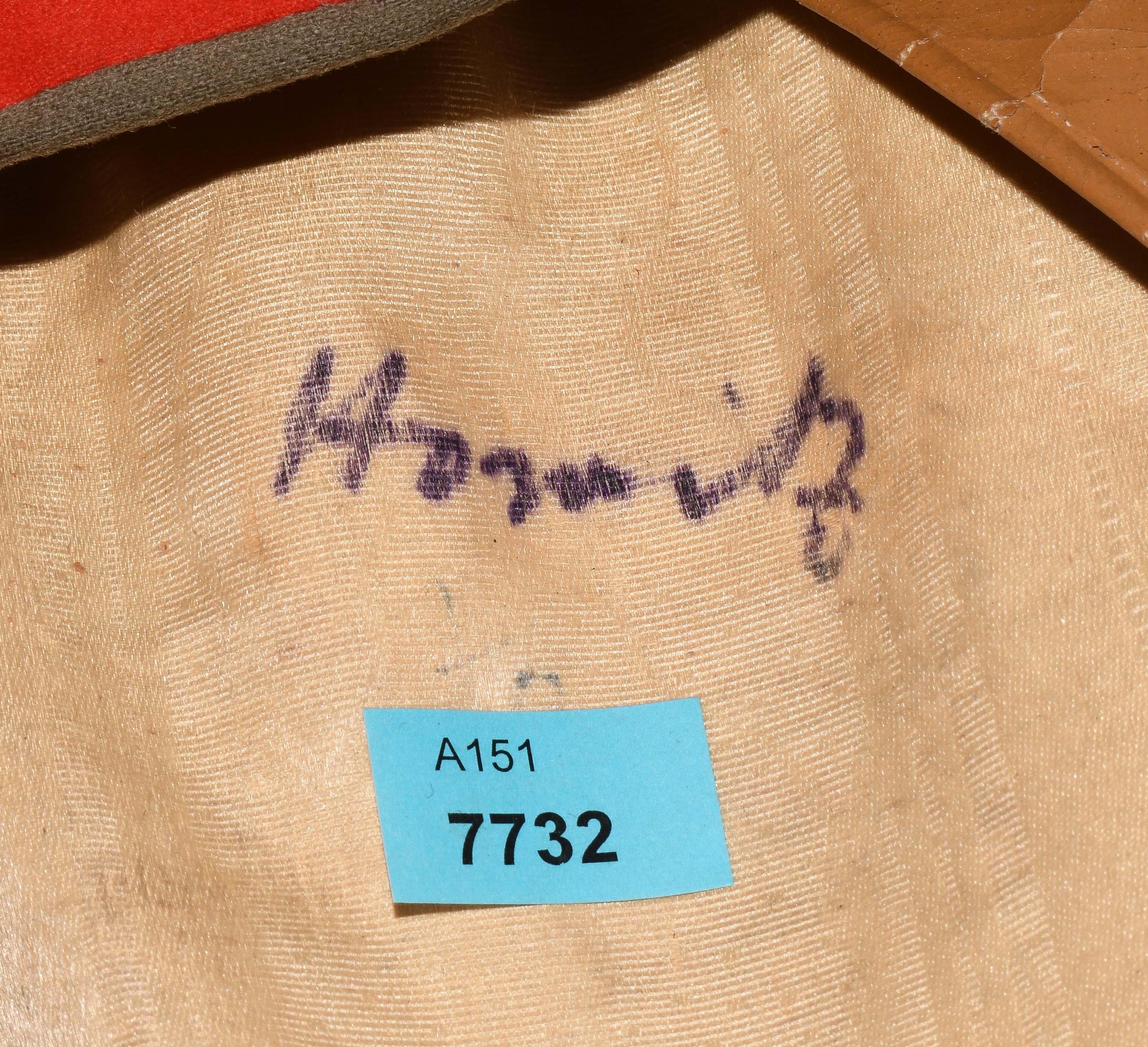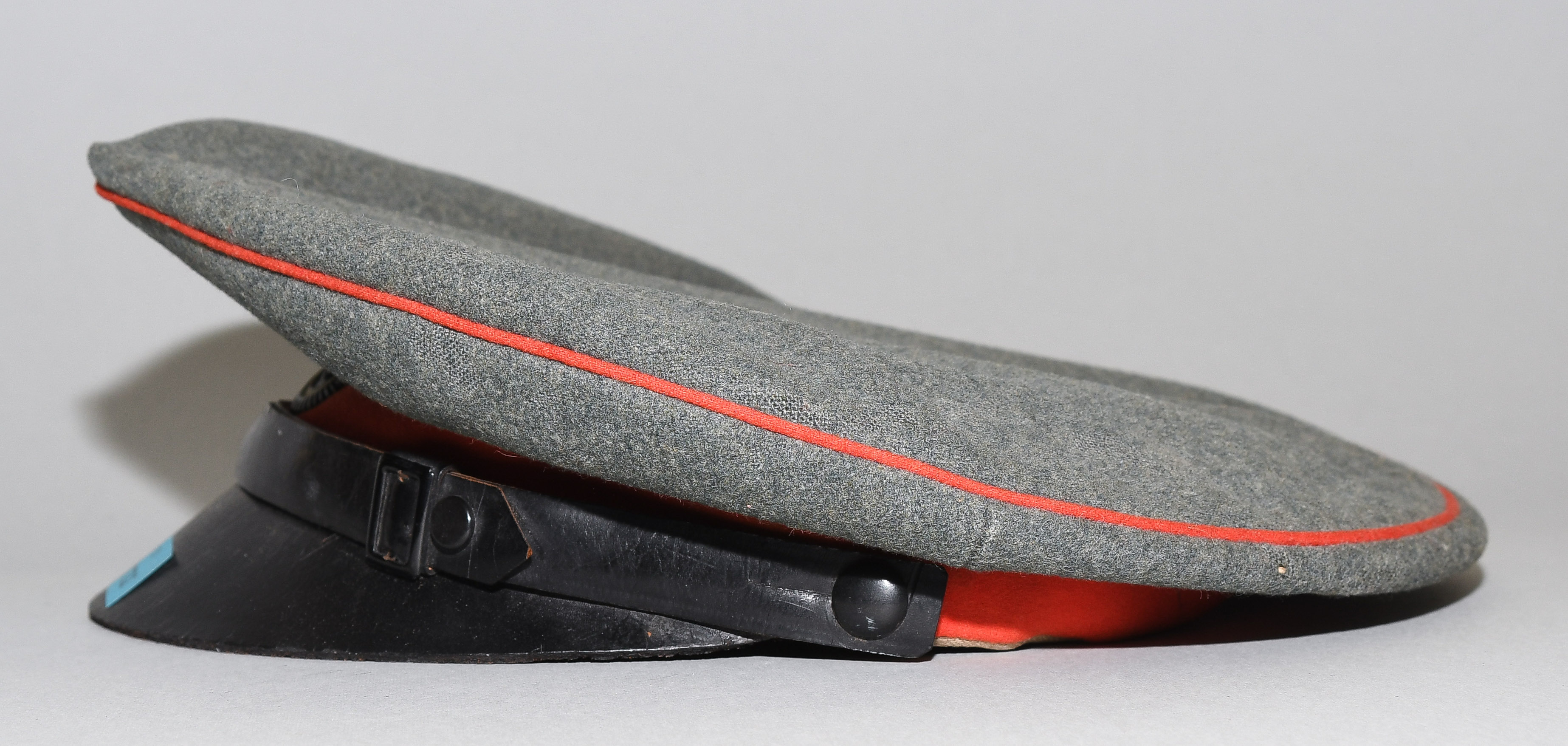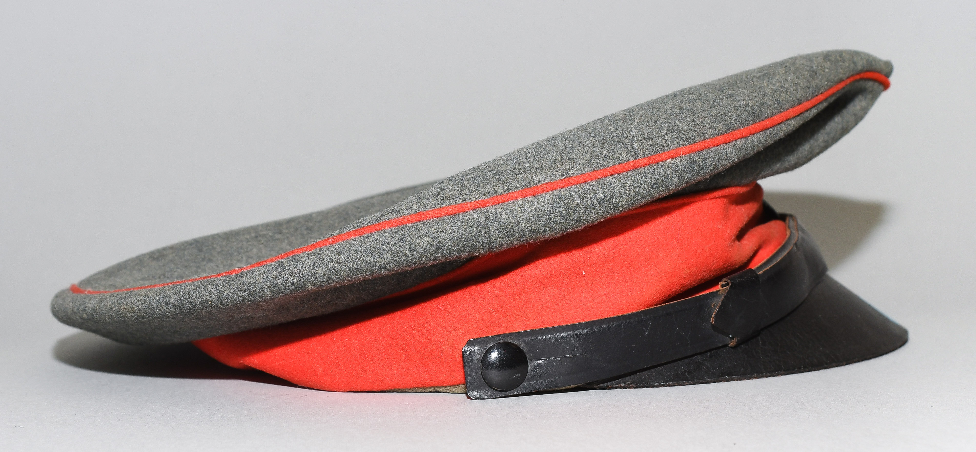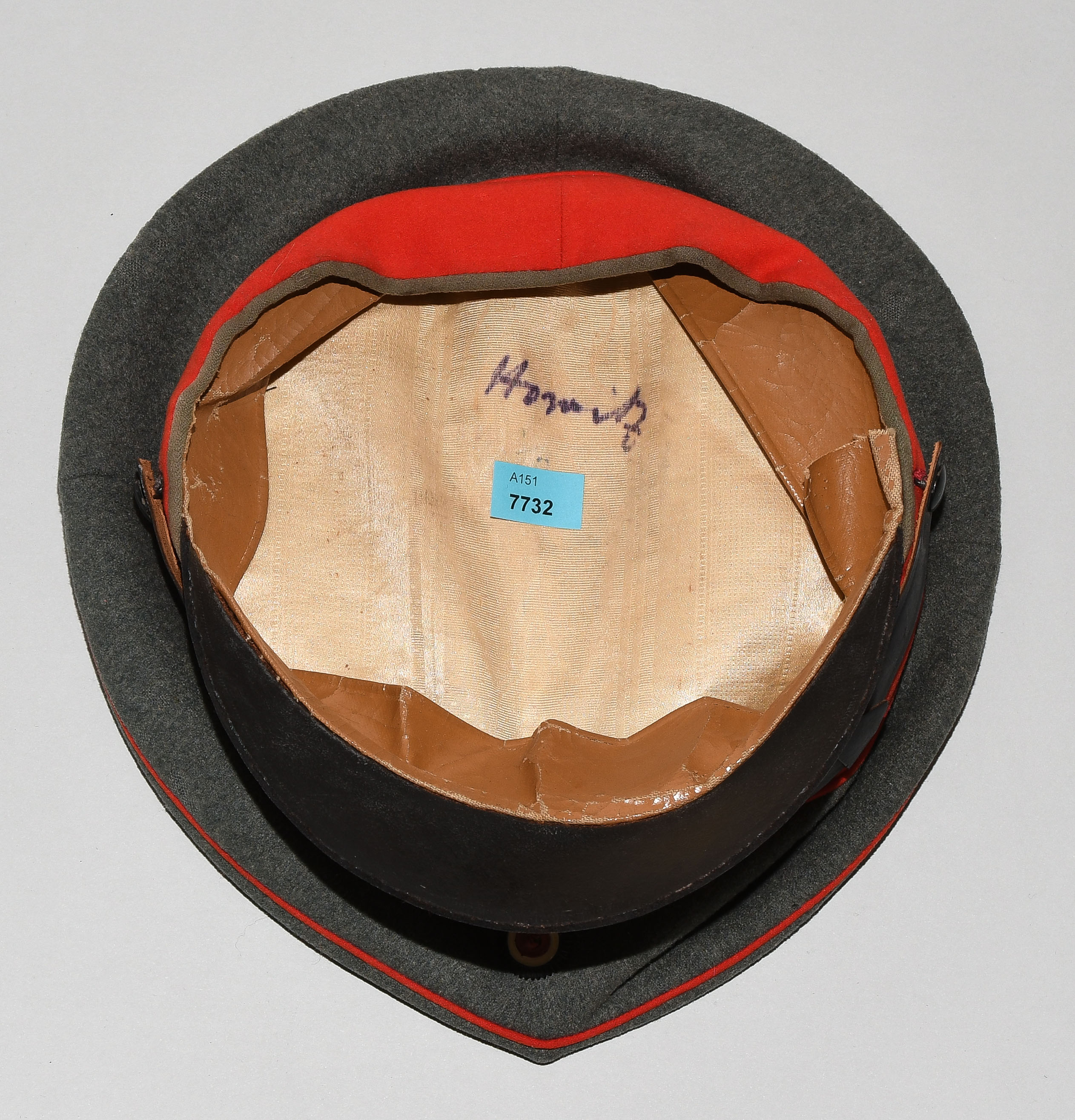 Russland, 20.Jh. Feldgrüner Stoff mit rotem Zierstreifen und -band, lederne Stirnkappe. Dm 25 cm.