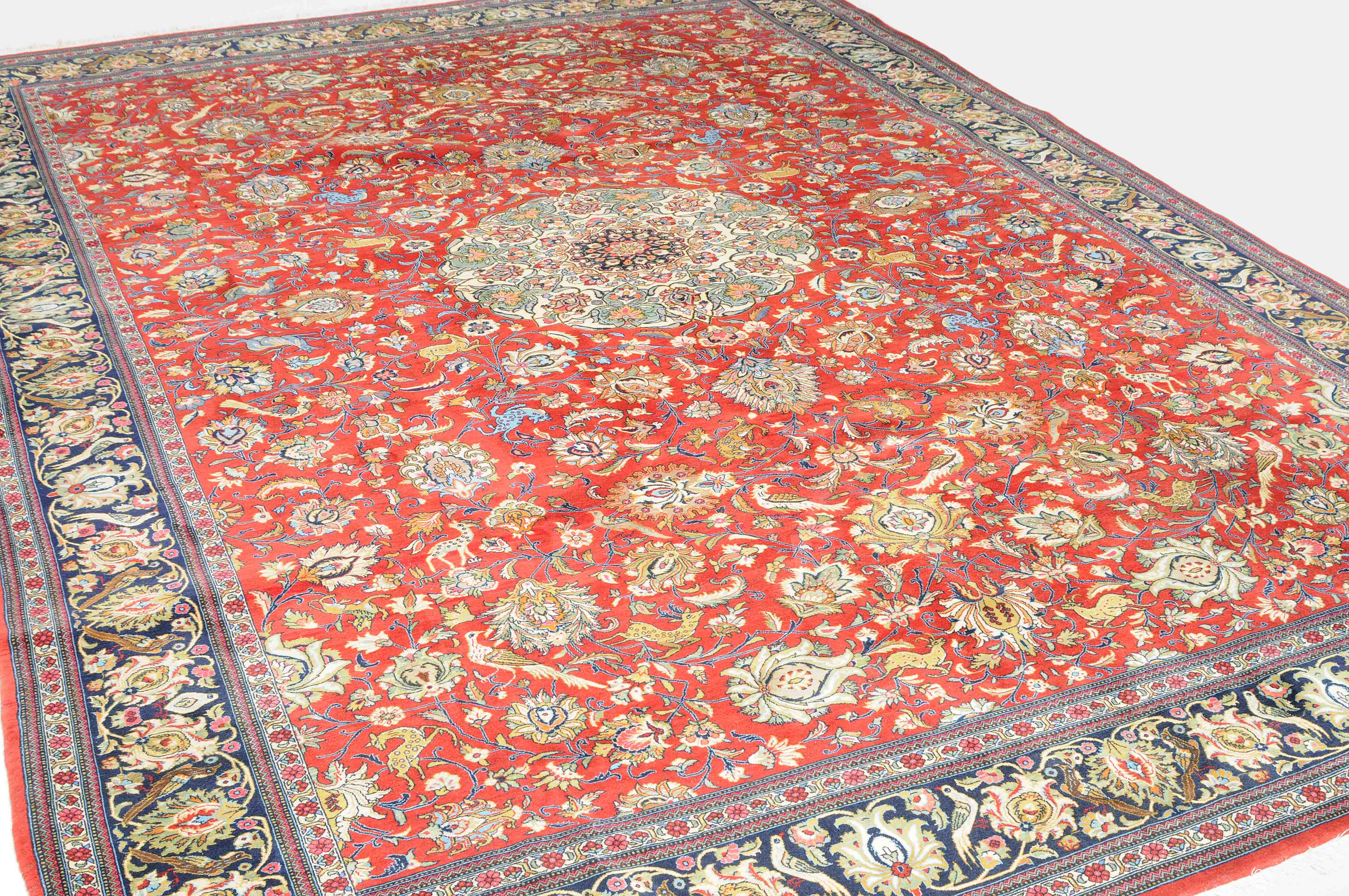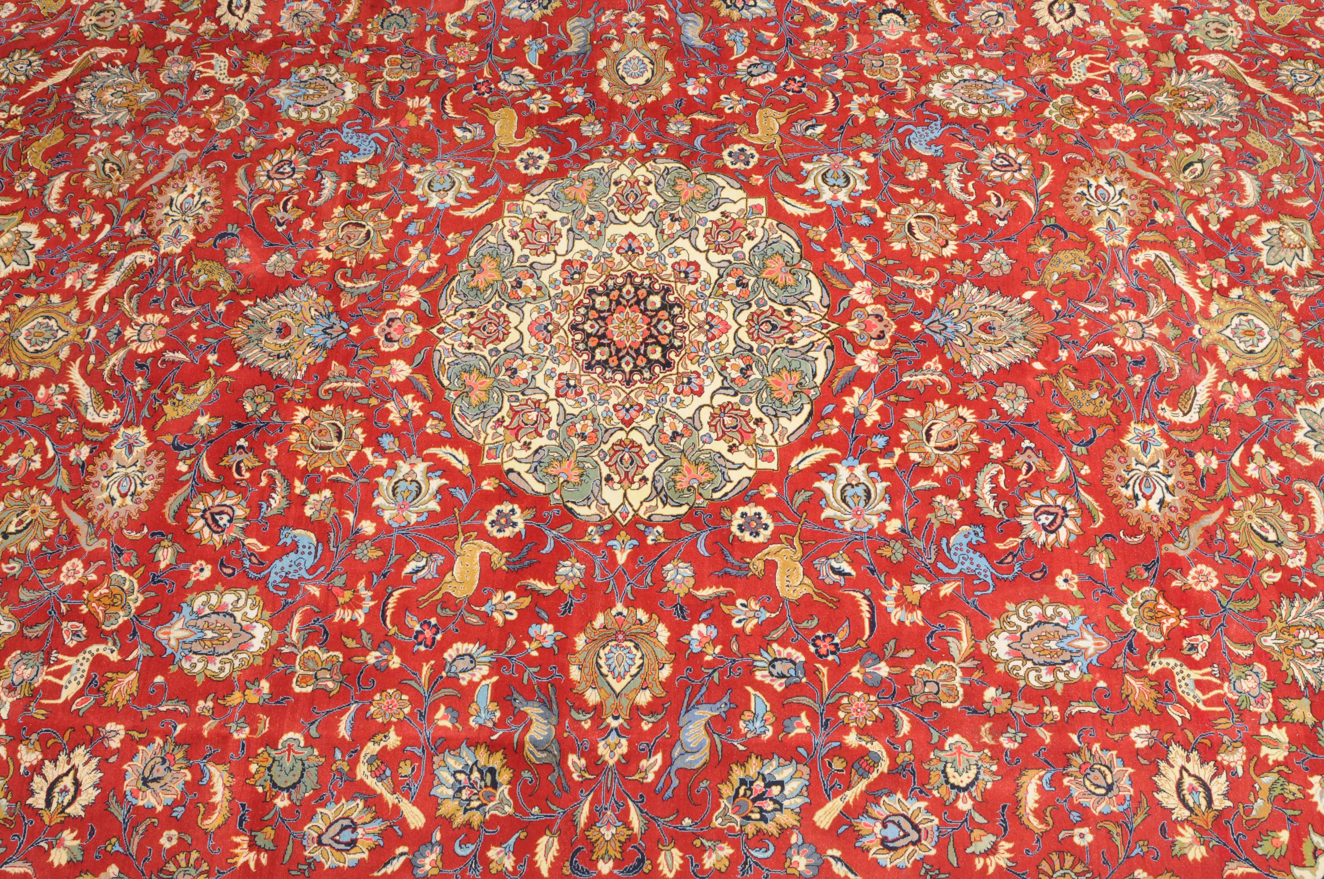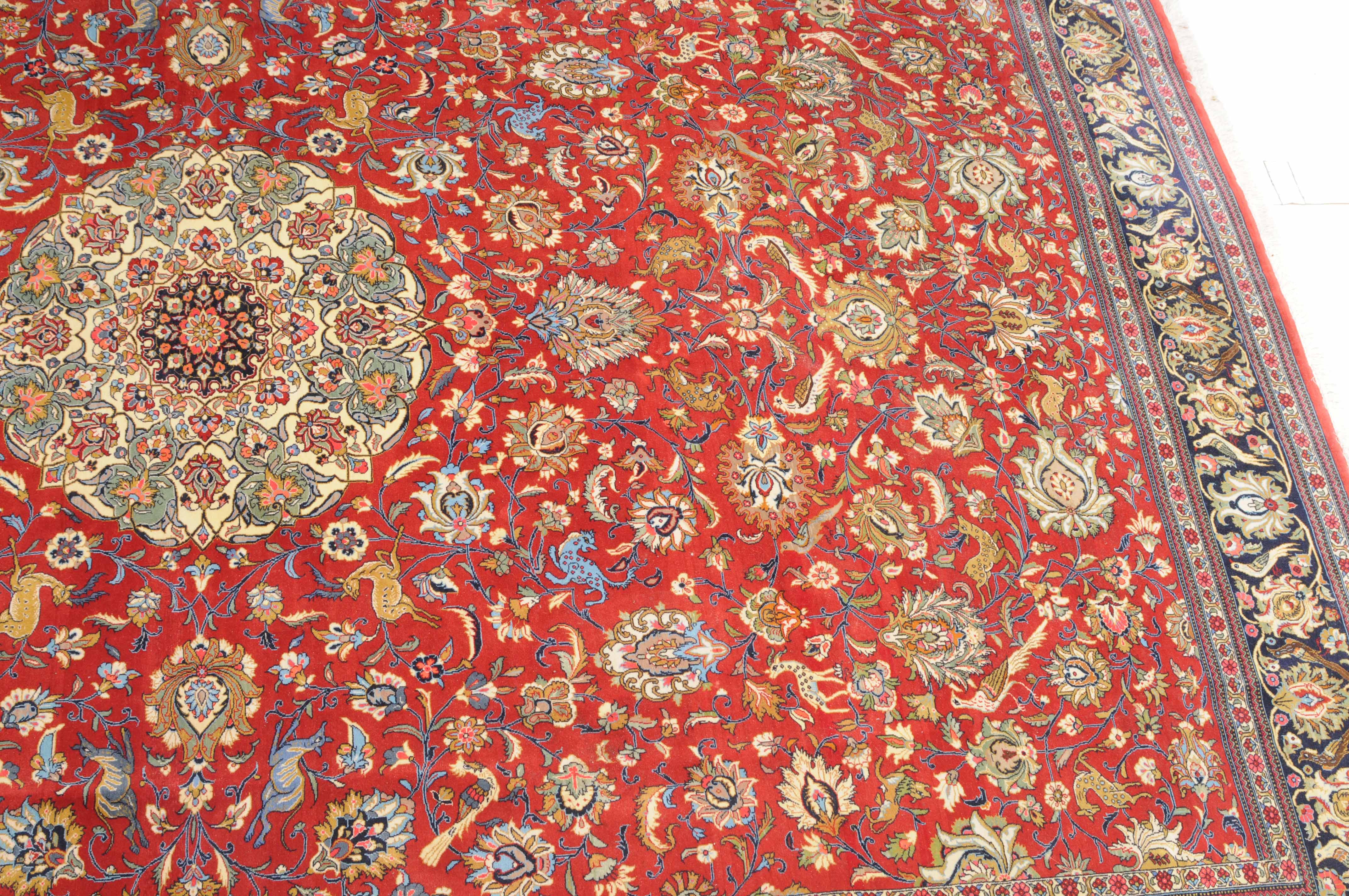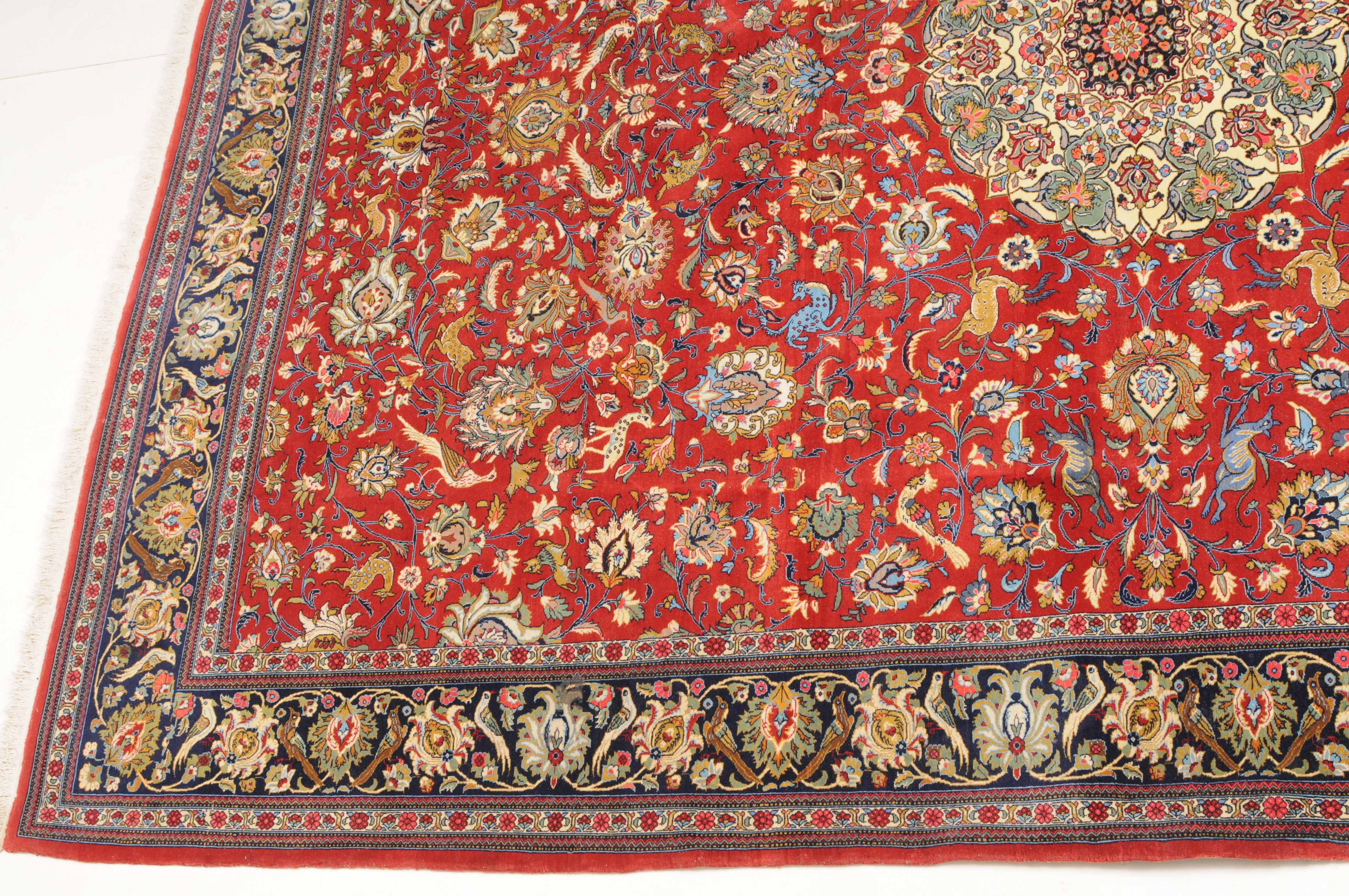 Z-Persien, um 1980. Auf rotem Grund liegt ein eindrucksvolles Rund-Medaillon, umgeben von Blütenkompositionen, Ranken und Vögeln. 2 helle Nebenbordüren umfassen die breite, mit Palmetten und Wellenranken verzierte nachtblaue Hauptbordüre. Sehr gute Erhaltung. 255x355 cm (ft. 8.4x11.7).