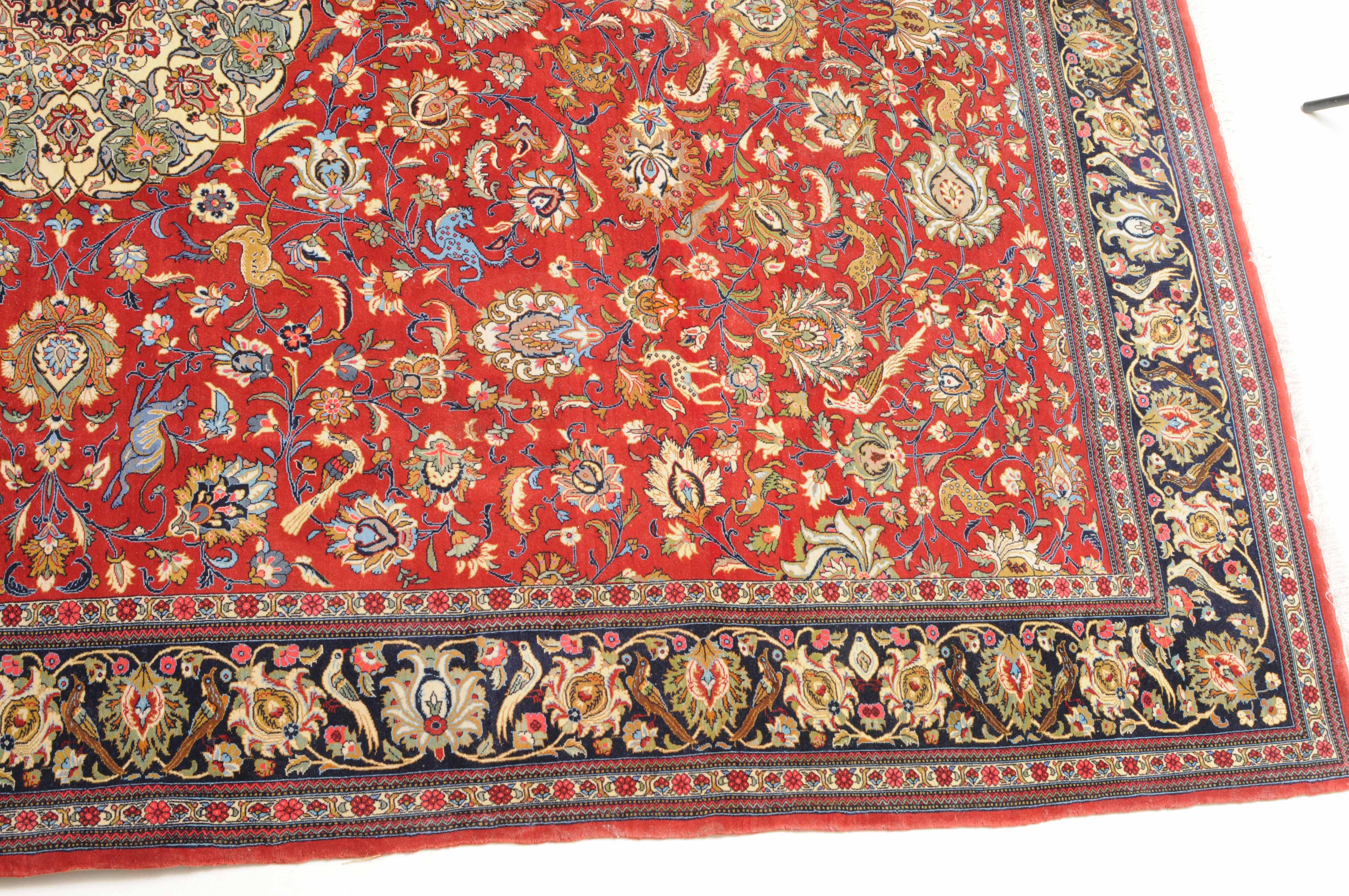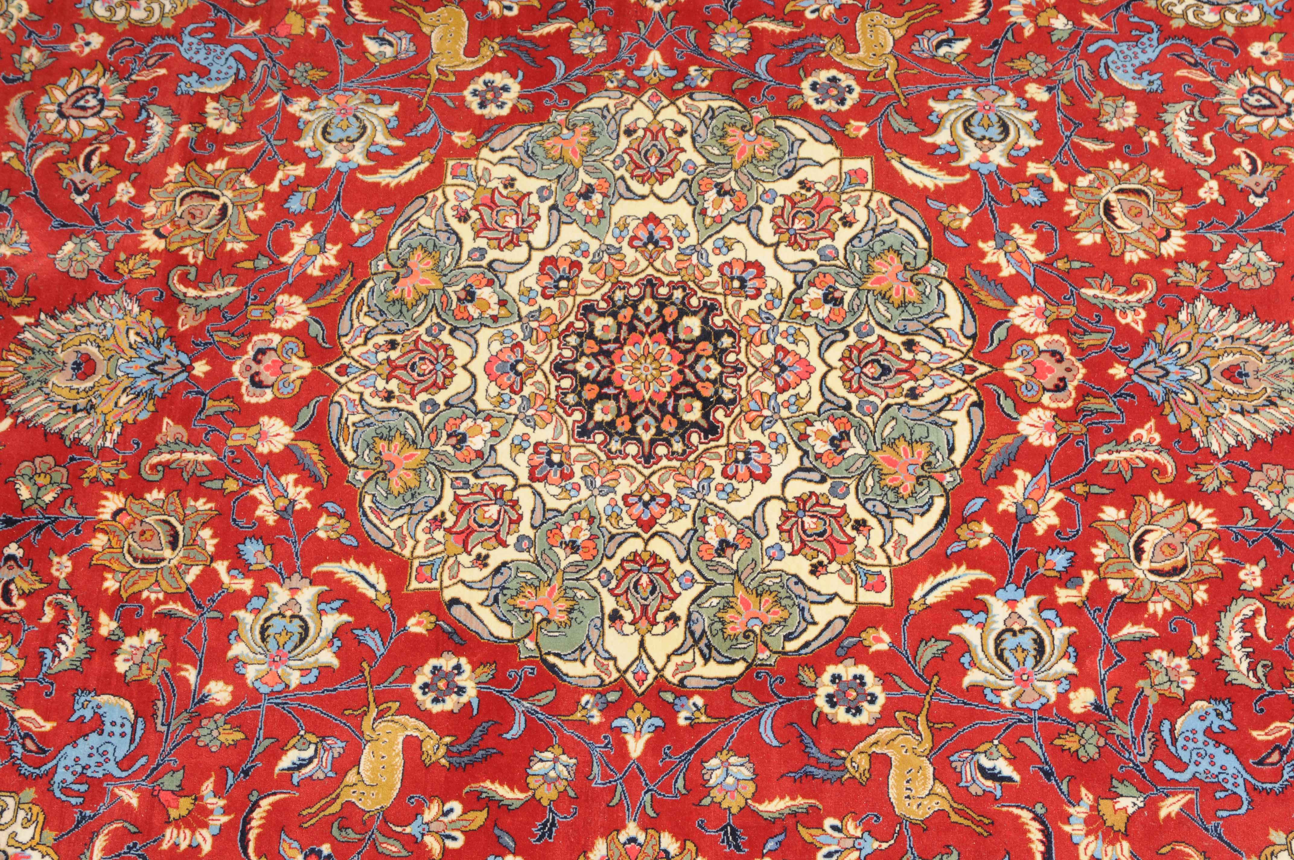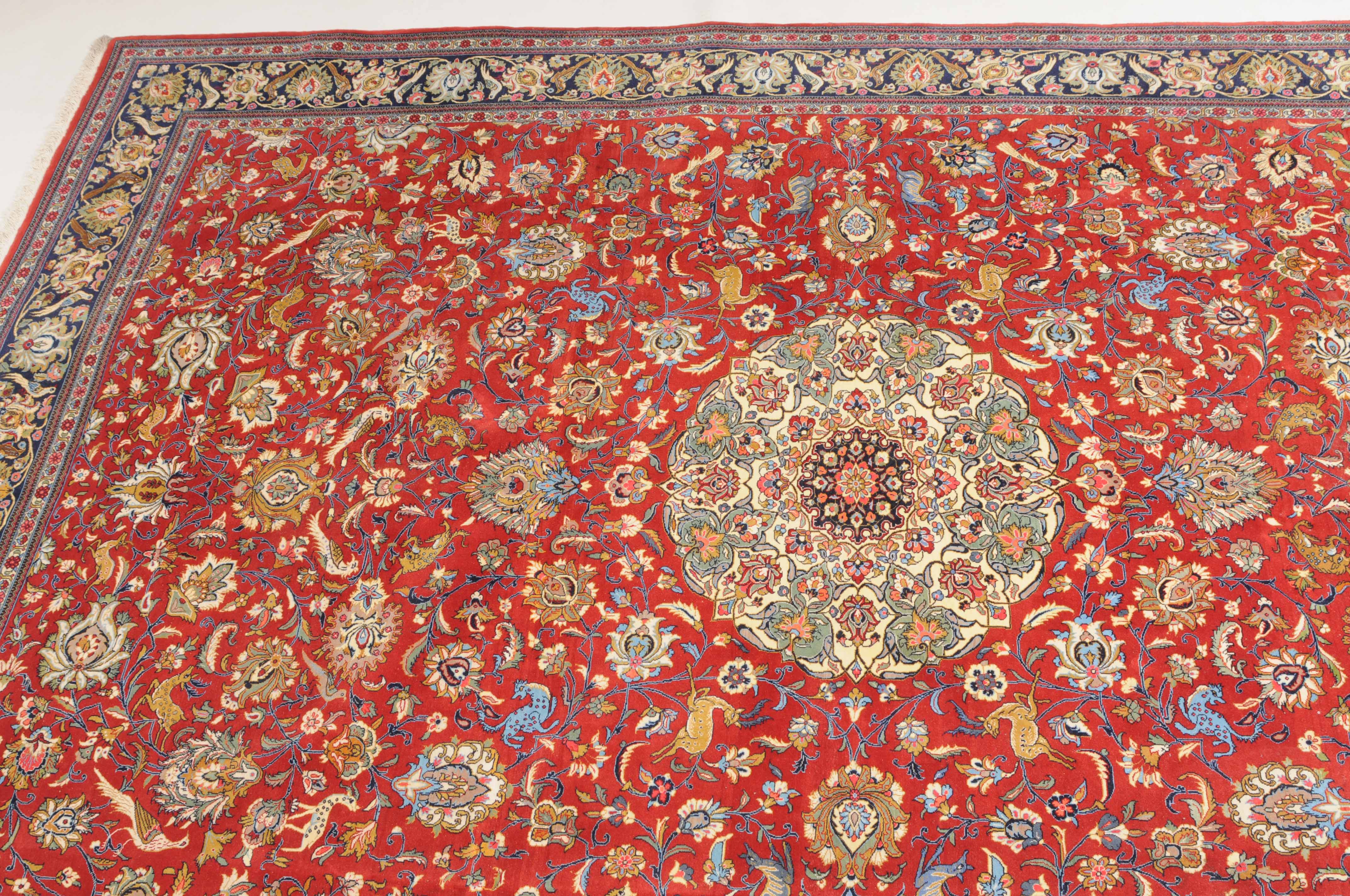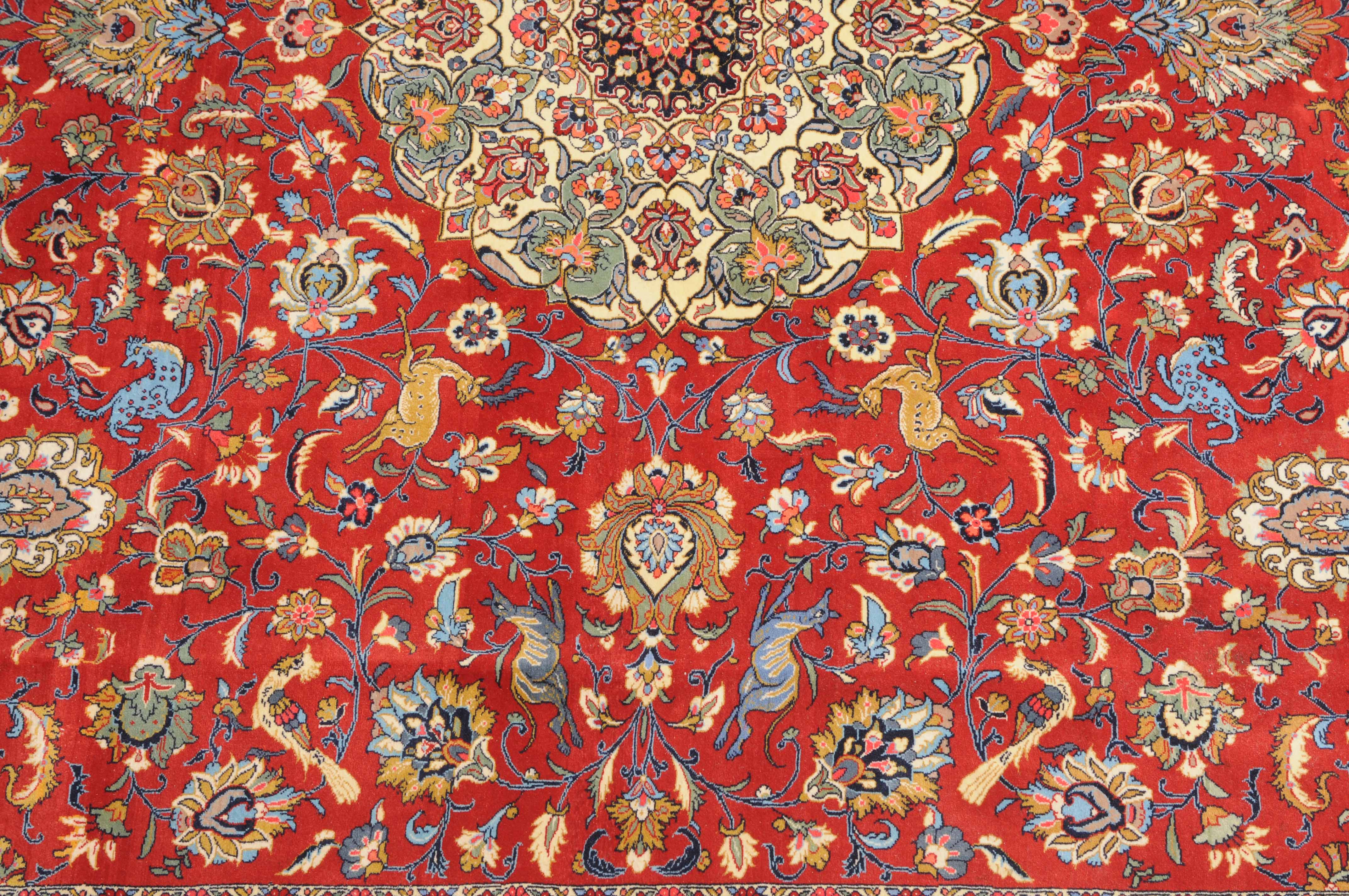 Z-Persien, um 1980. Auf rotem Grund liegt ein eindrucksvolles Rund-Medaillon, umgeben von Blütenkompositionen, Ranken und Vögeln. 2 helle Nebenbordüren umfassen die breite, mit Palmetten und Wellenranken verzierte nachtblaue Hauptbordüre. Sehr gute Erhaltung. 255x355 cm (ft. 8.4x11.7).