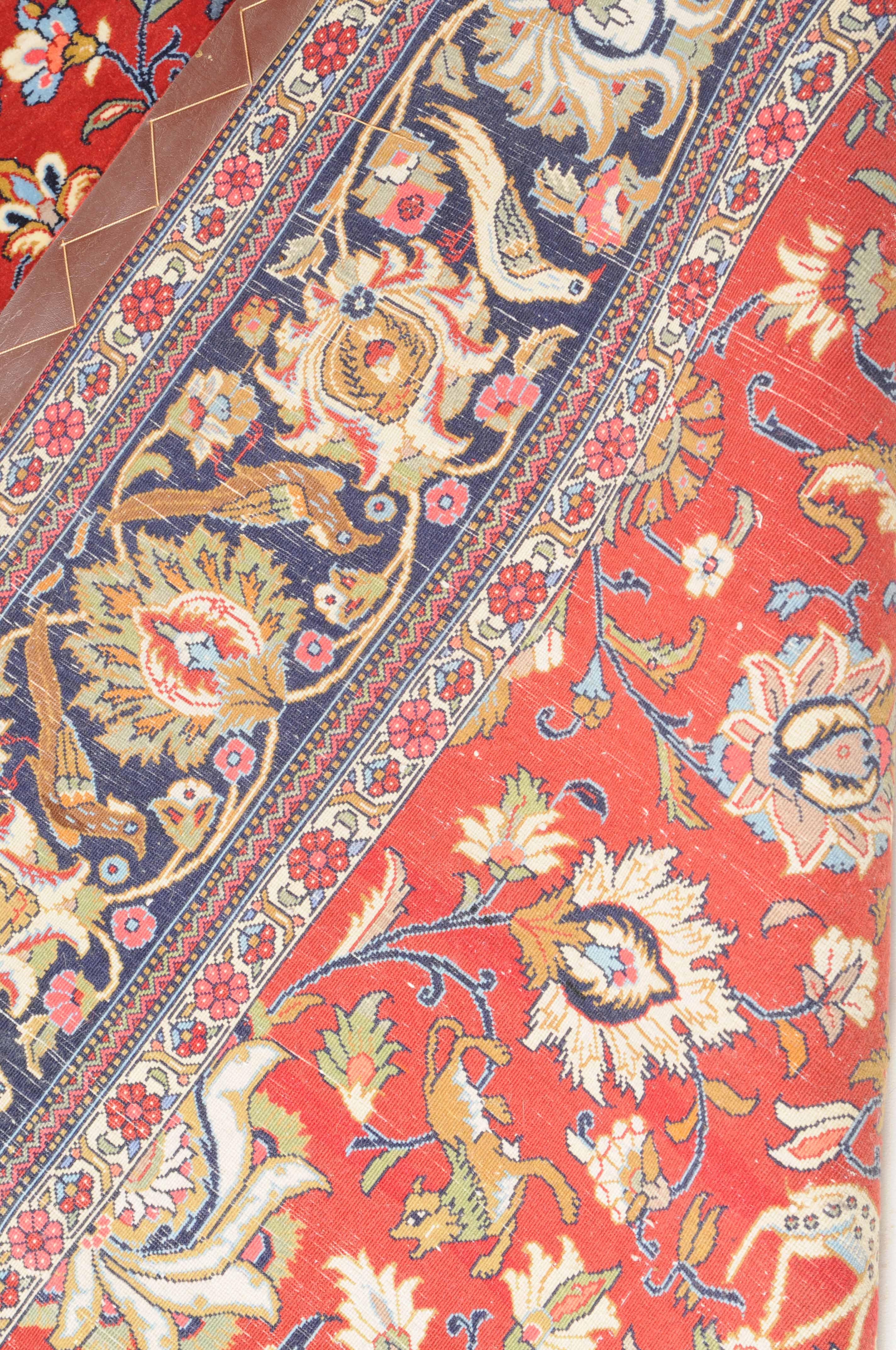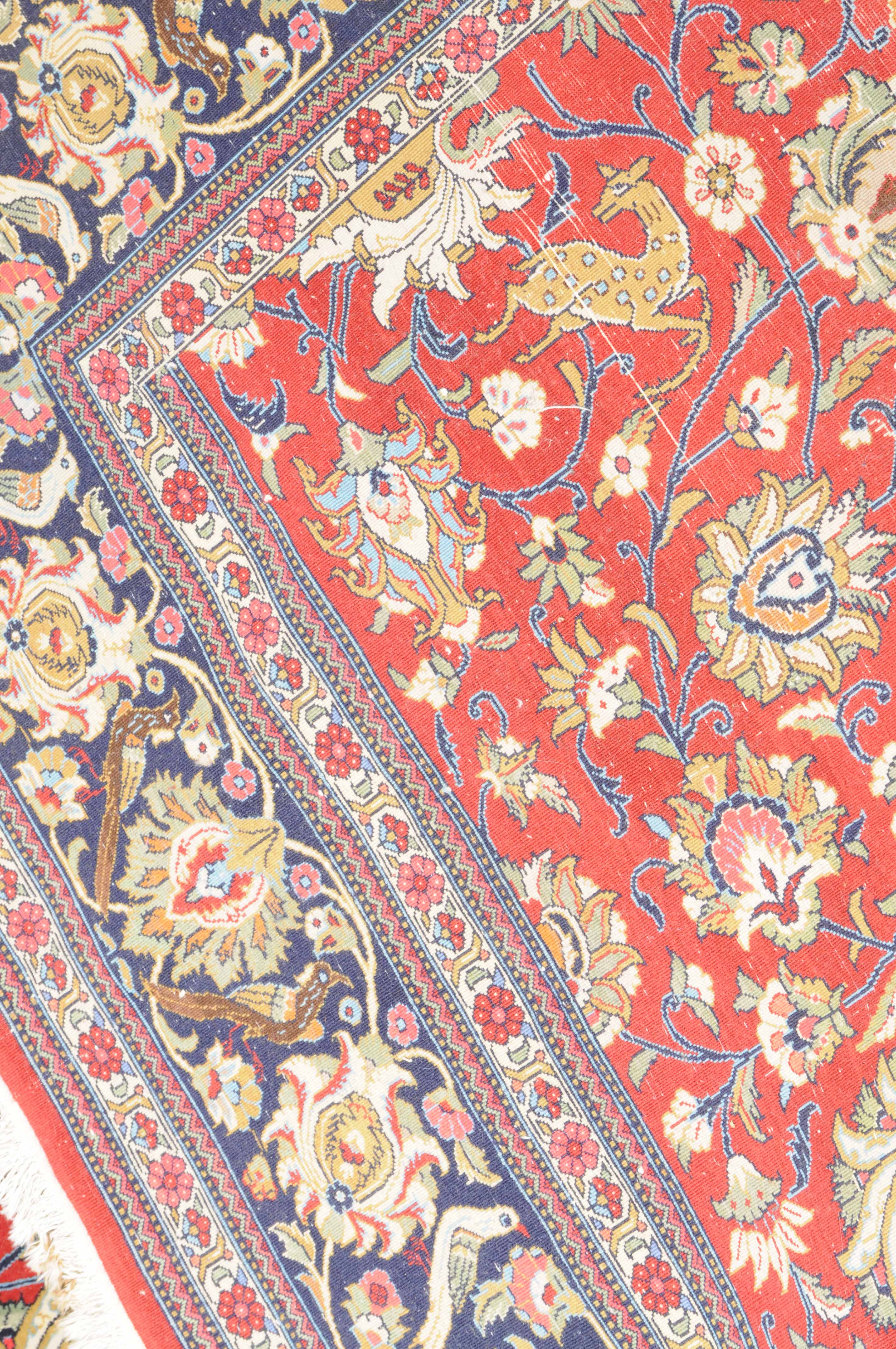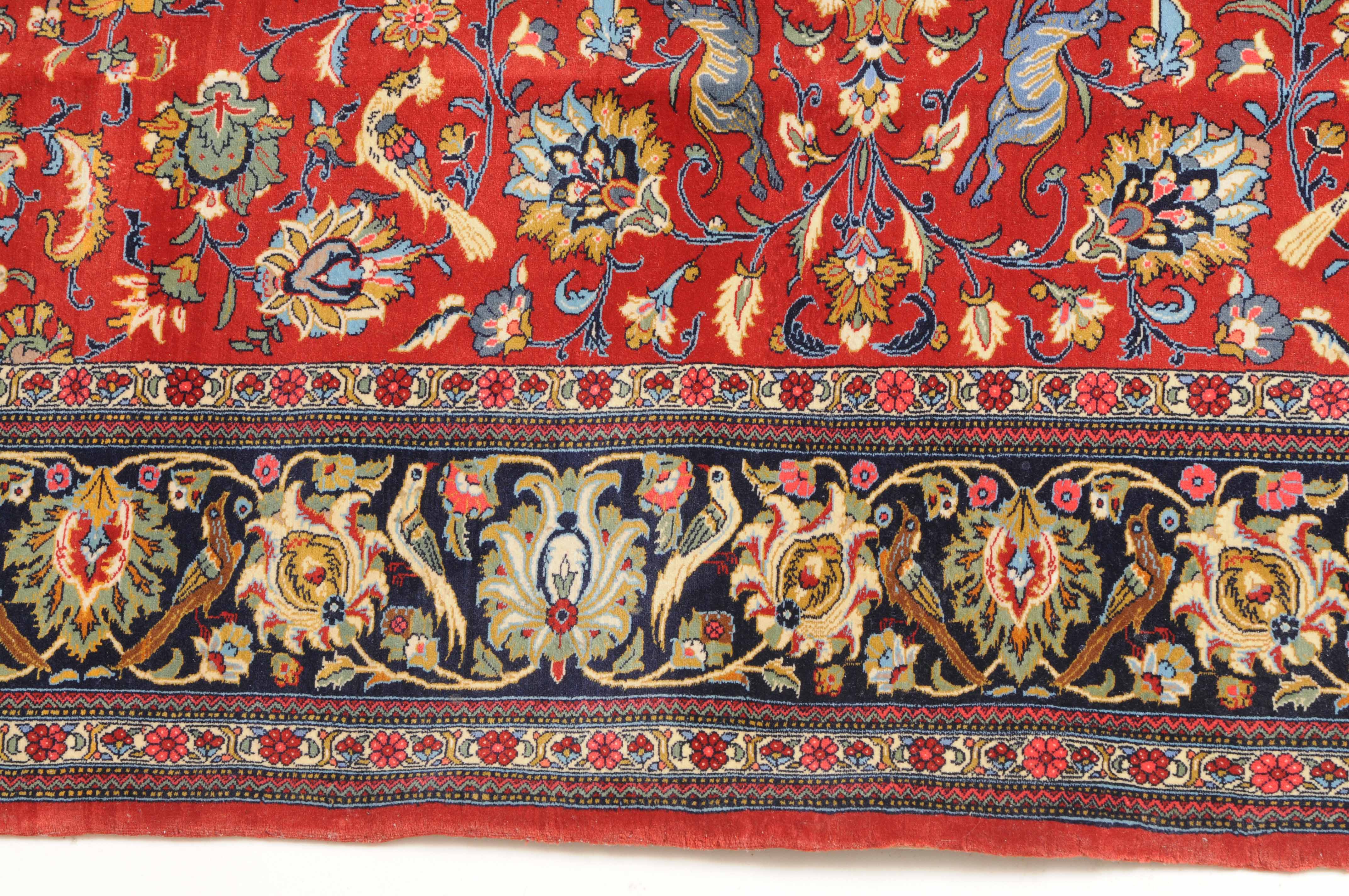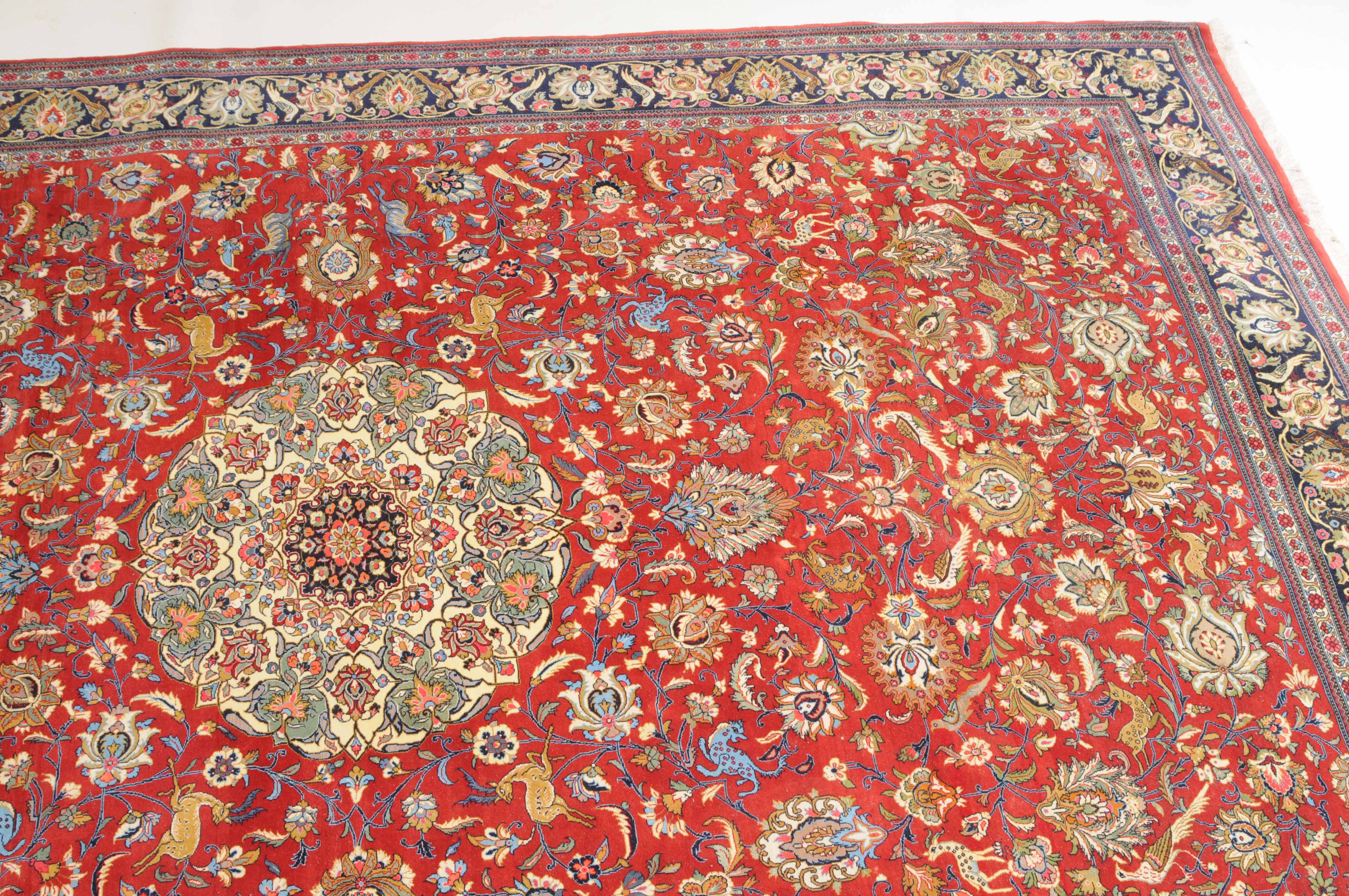 Z-Persien, um 1980. Auf rotem Grund liegt ein eindrucksvolles Rund-Medaillon, umgeben von Blütenkompositionen, Ranken und Vögeln. 2 helle Nebenbordüren umfassen die breite, mit Palmetten und Wellenranken verzierte nachtblaue Hauptbordüre. Sehr gute Erhaltung. 255x355 cm (ft. 8.4x11.7).