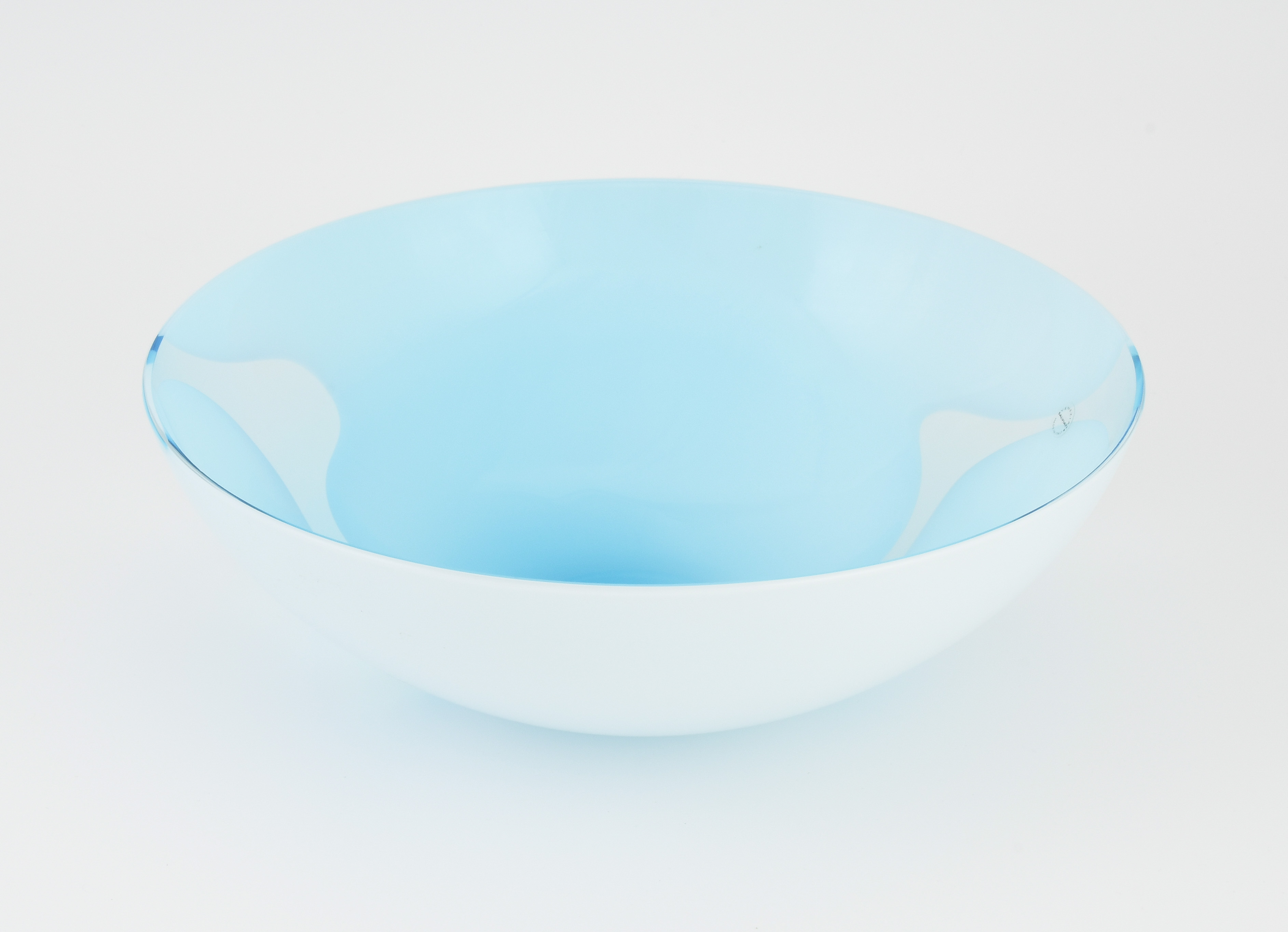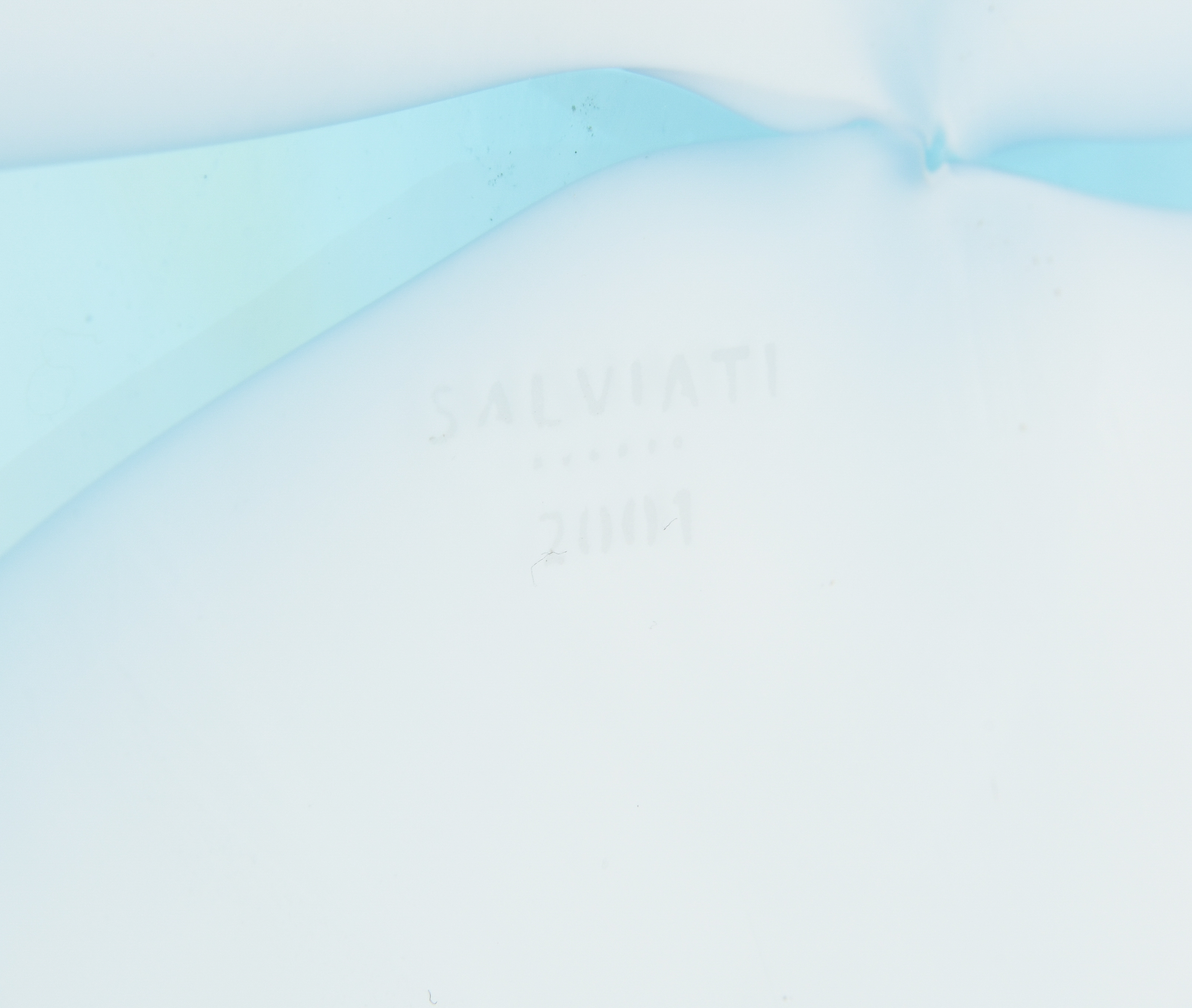 Murano, 2001. Schale "Nuovole". Farbloses Glas mit milchigweiss-hellblauen Farbeinschmelzungen. Bezeichnet: SALVIATI 2001. H 10.