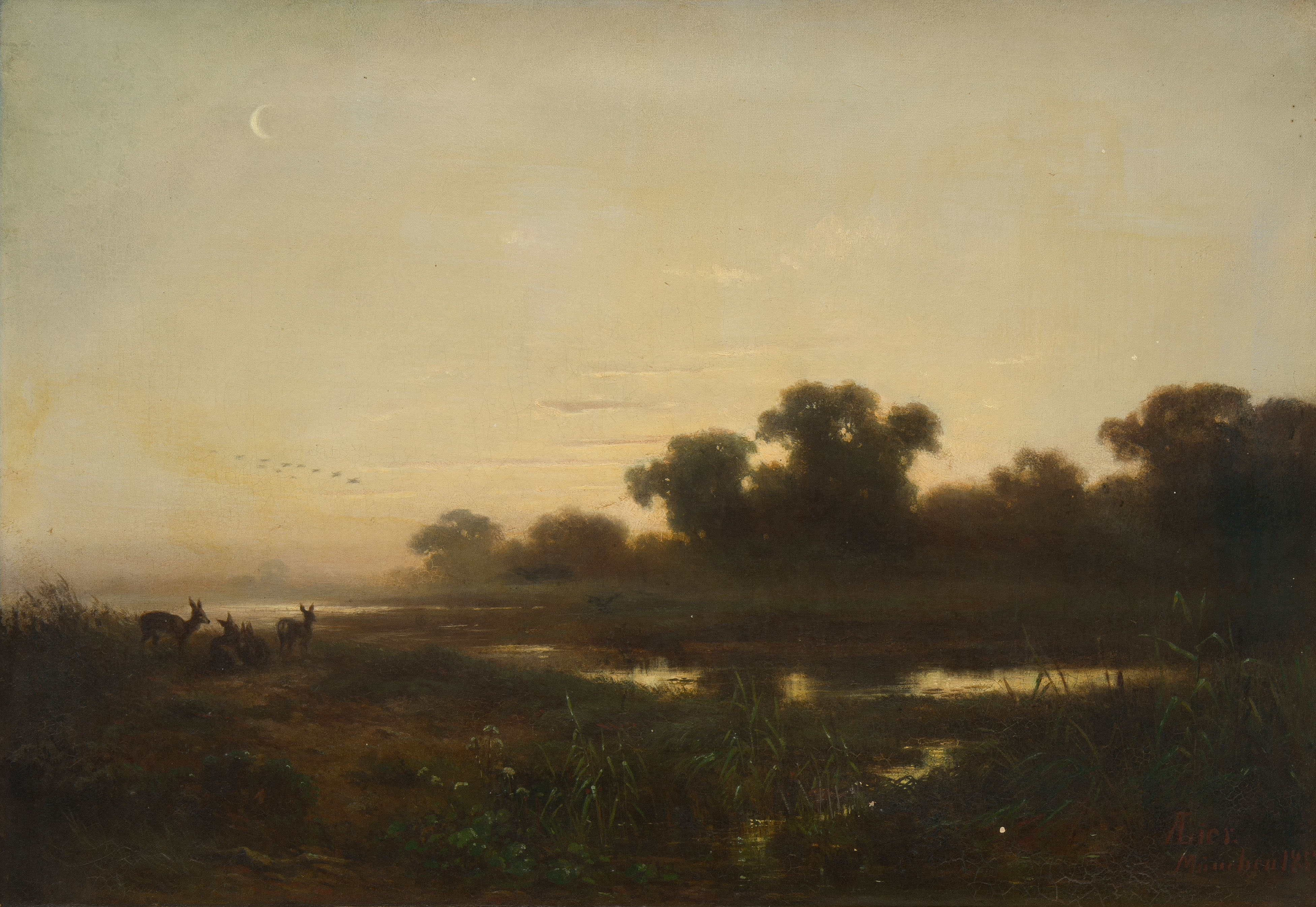 Rehe in einer Flusslandschaft. 1859. Öl auf Leinwand. Unten rechts signiert, datiert und bezeichnet München. 39,5x56 cm.