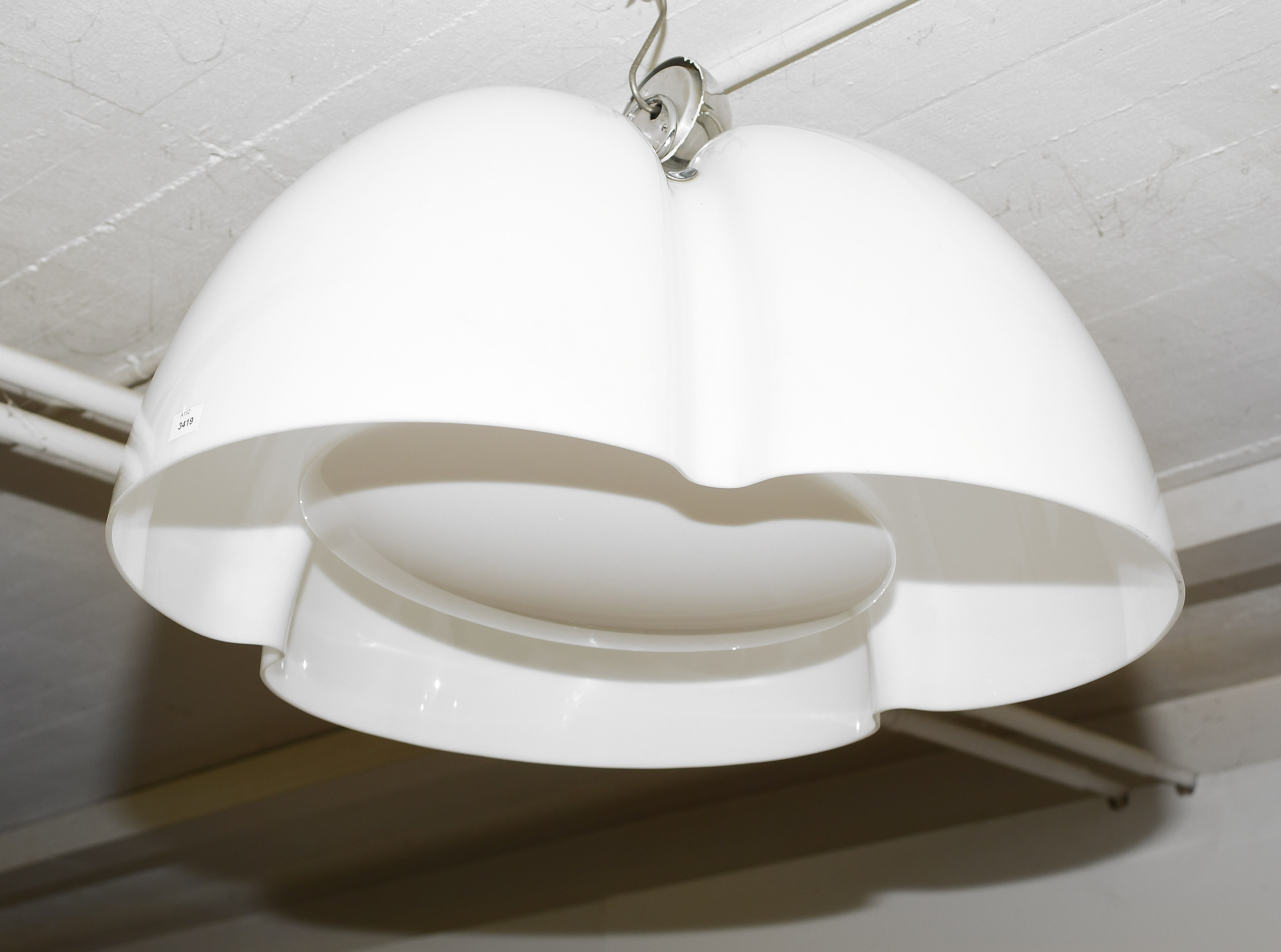 Deckenlampe "Tricena". München, Entwurf 1968. Kunststoff weiss, Metall verchromt. H ca. 73 cm, D 60 cm.