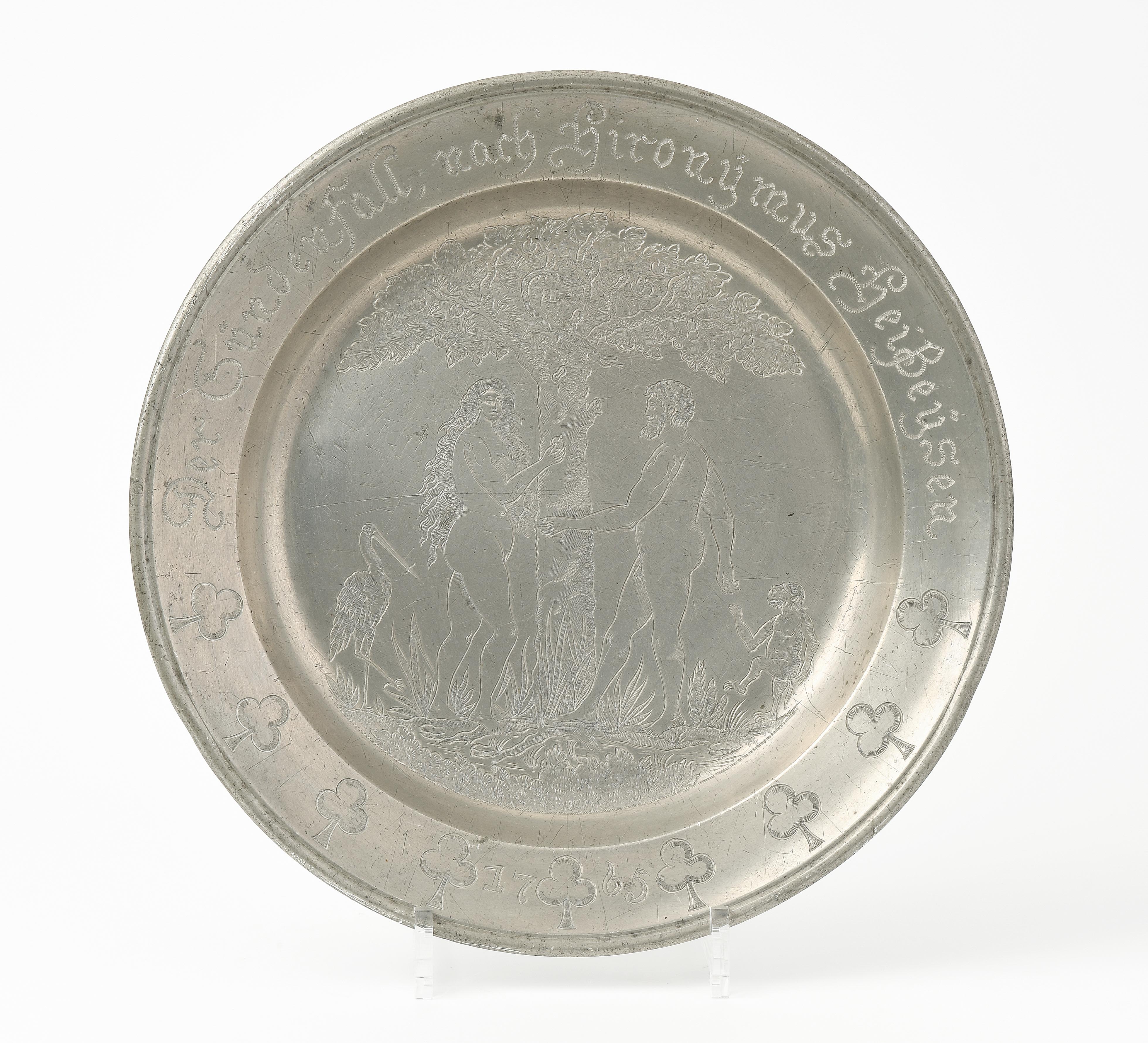 Wohl Chur, 1.Hälfte 19.Jh. Zinn. Marke des Johann Jakob Ulrich Bauer (1781–1850). Gravuren in der Art des 18.Jhs. Im Spiegel Darstellung des Sündenfalls. Fahne mit Inschrift: "Der Sündenfall, nach Hironymus Heisseysen 1765". D 30 cm.