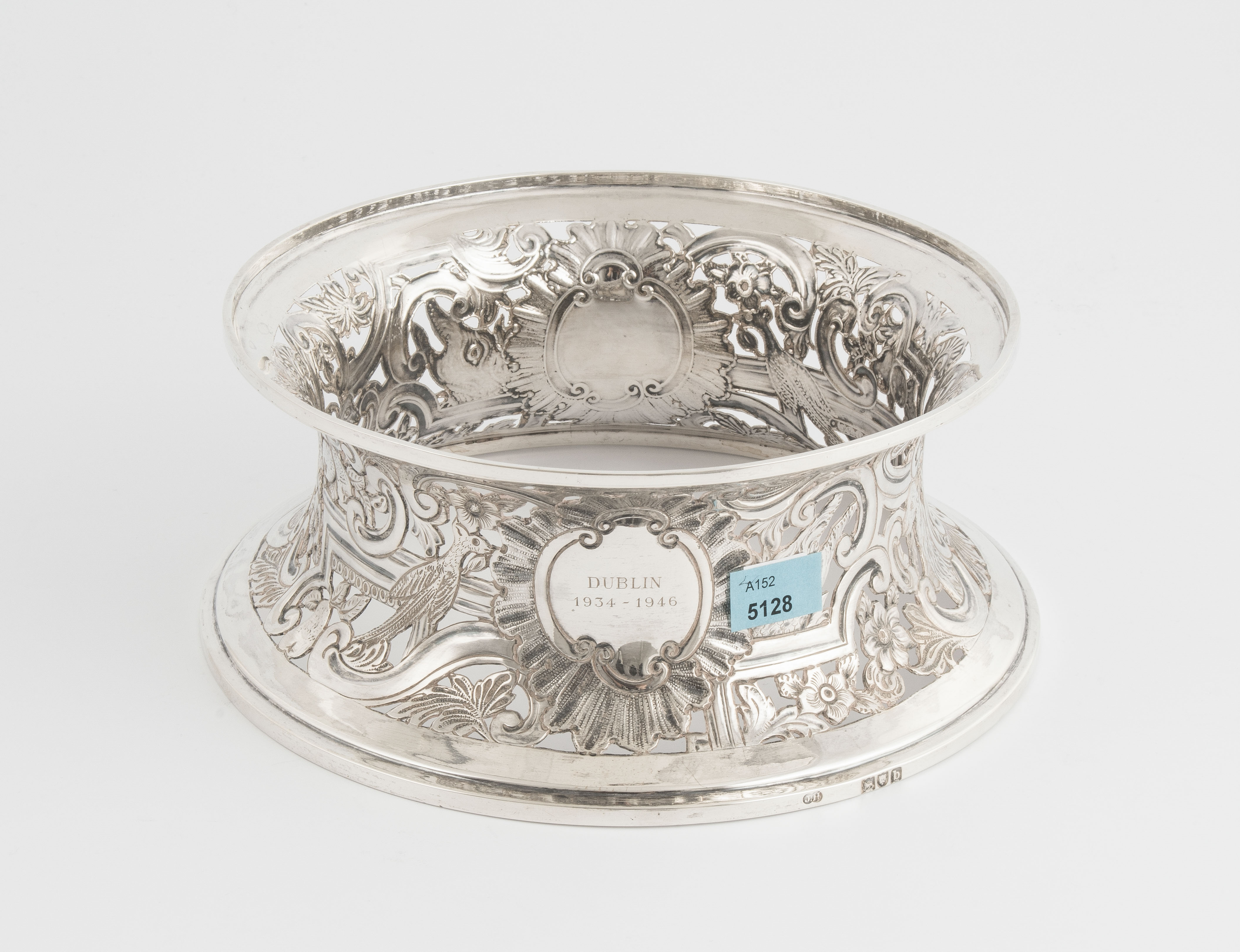 London, 1897. Silber. Meistermarke Job Frank Hall. Runde, durchbrochene Form mit konkaver Wandung. Vegetabiler Dekor mit verschiedenen Tieren, zwischen Voluten, Rocaillen und zwei Kartuschen. Gemarkt, Feingehalt 925. D 21, 5 cm, ca. 430 g.