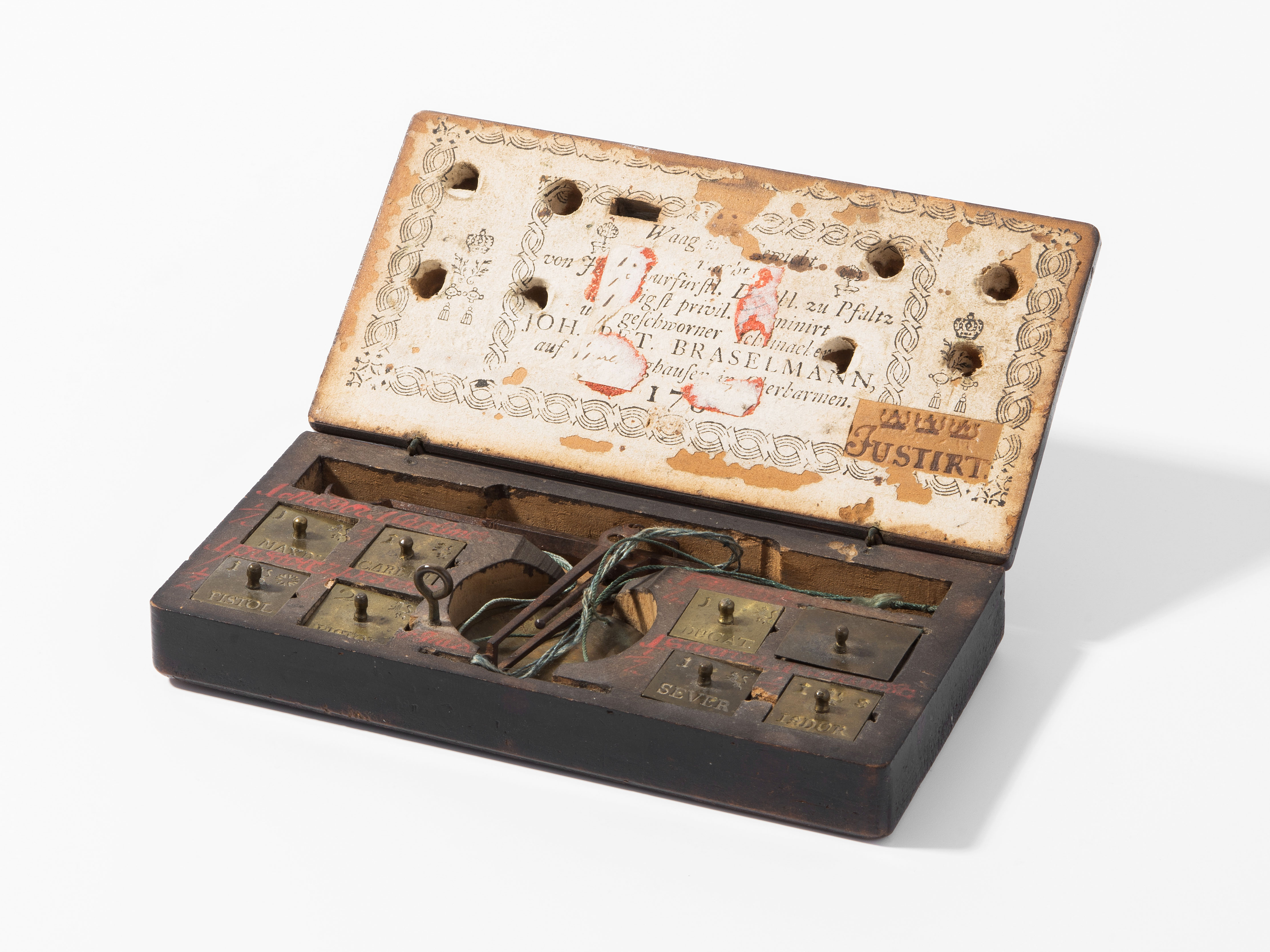 Deutschland, Mitte 18.Jh. Rechteckige Holzschatulle mit 11 Gewichten. Auf Papieretikett im Deckelinnern bezeichnet: "JOH. PET. BRASELMANN". Waage mit Eisenbalken und 2 runden Schalen aus Messing. 13x6,5x2,5 cm.