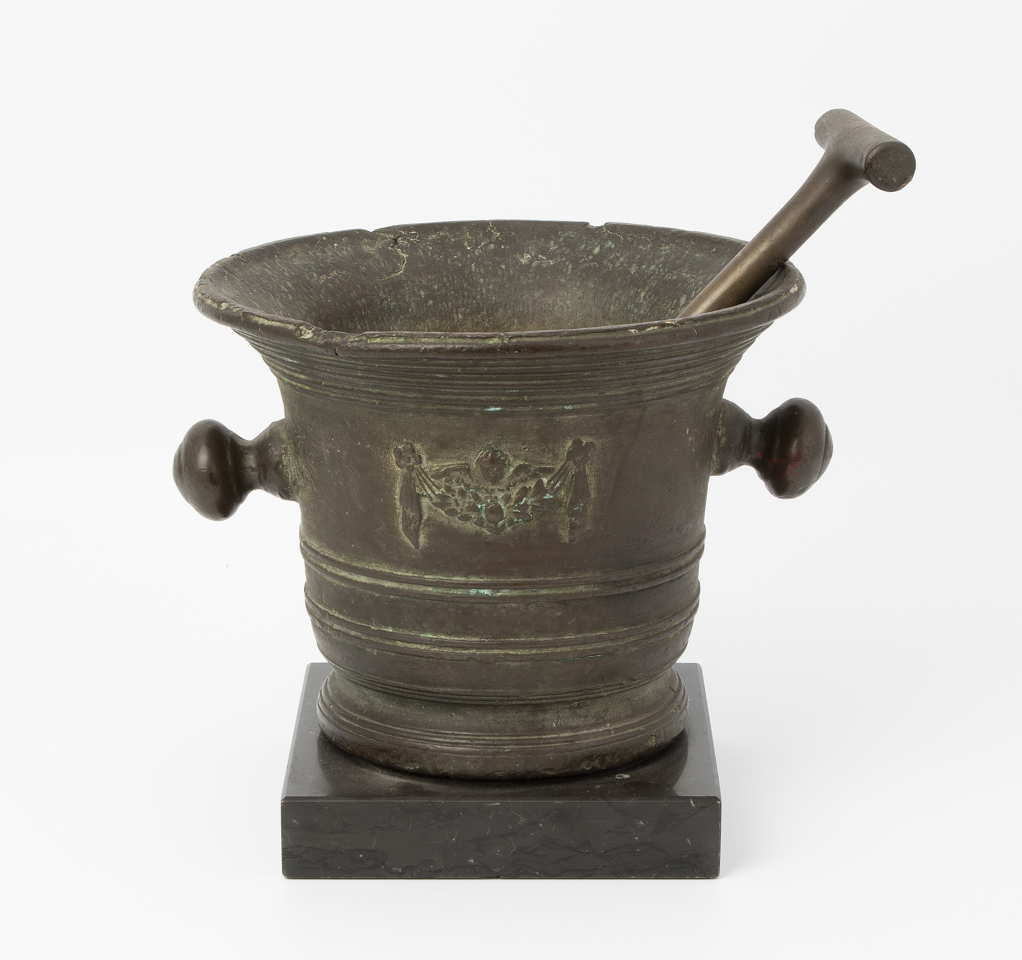 17.Jh. Bronze. Konische Form mit ausladendem Lippenrand und eingezogenem Fuss. Wandung mit 2 Früchte-Girlanden reliefiert. Knäufe als Handhaben. Auf dunkle Marmorplinthe montiert. H 22,5 cm.
