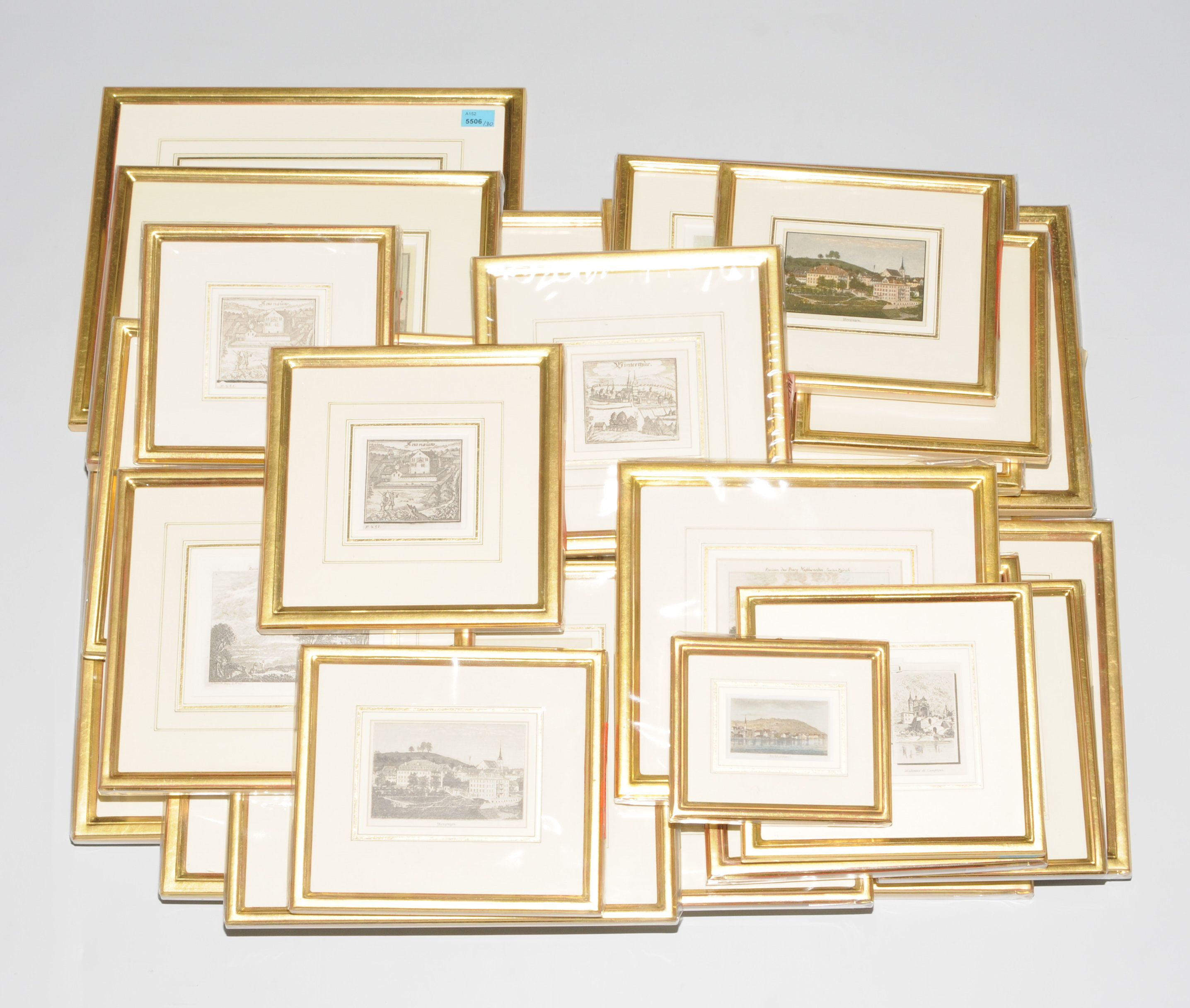 Rechteckige Holzrahmen, übereck vergoldet. Inhalt: diverse Schweizer Ansichten. 12x14–29x33 cm.