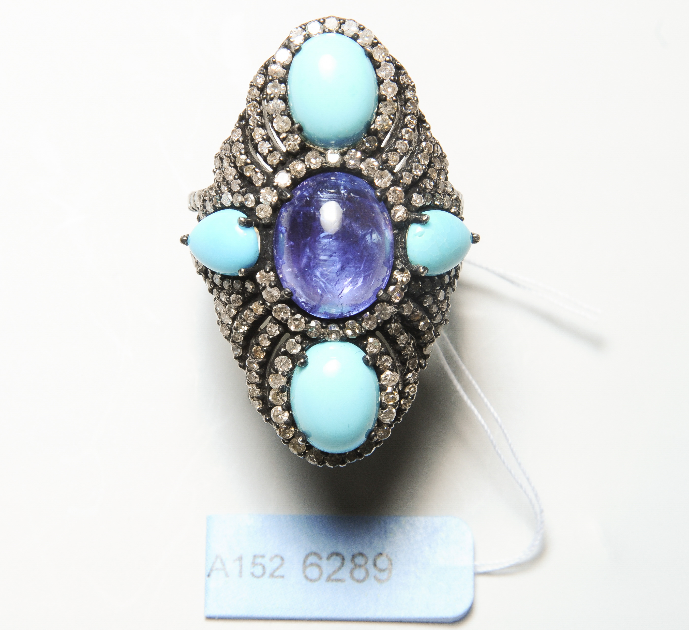 750 Gelbgold/Silber. 1 Tansanit-Cabochon 11x9 mm, 4 Türkis-Cabochons, div. kl. Diamanten. Gr. 55, 9,4 g.