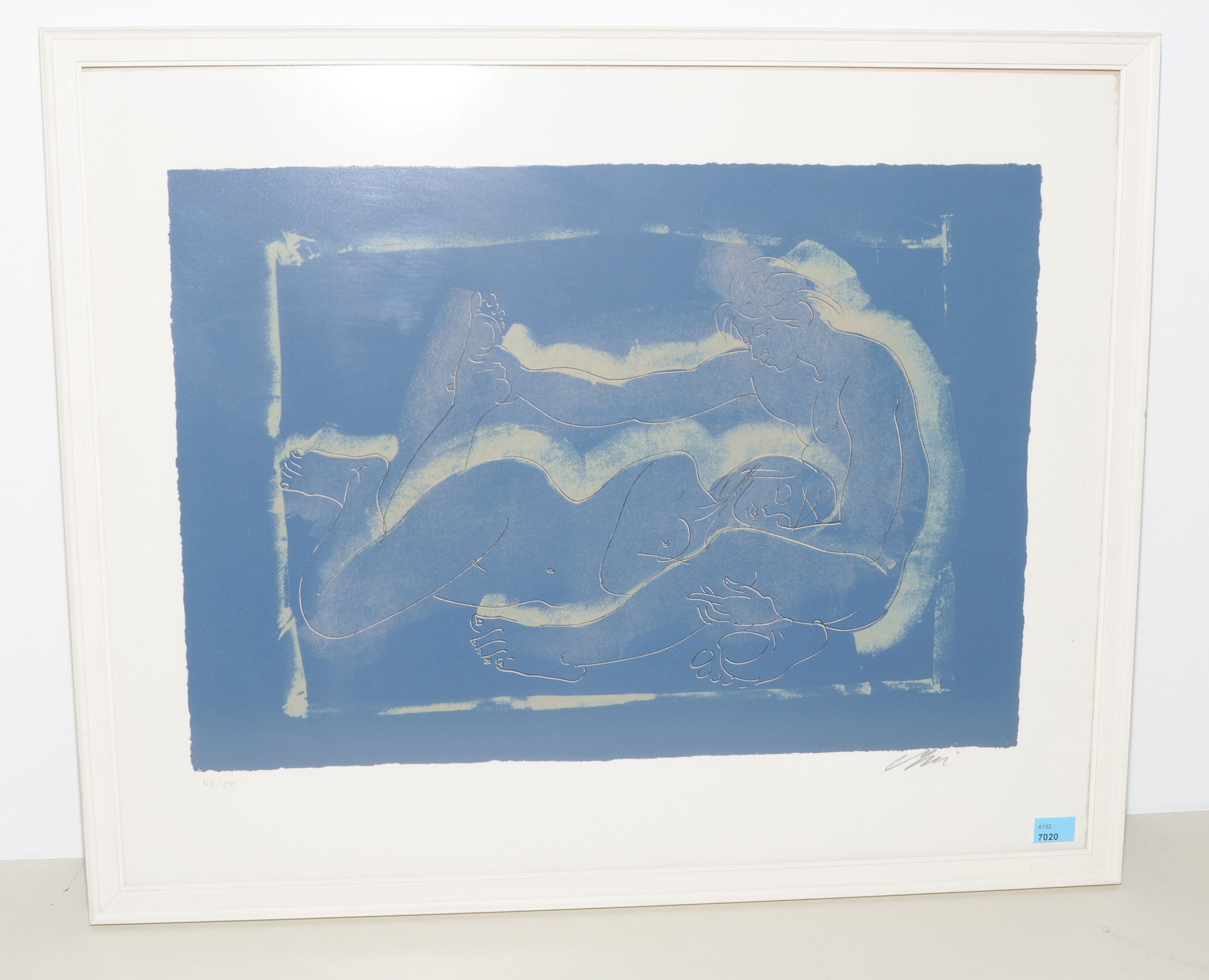 Aus: "Erni à Verbier". "Paar mit gelber Umrandung auf blauem Grund". 1971. Farblithographie. 43/50. Unten rechts signiert. Lichtmass 44,5x55 cm. Gerahmt.