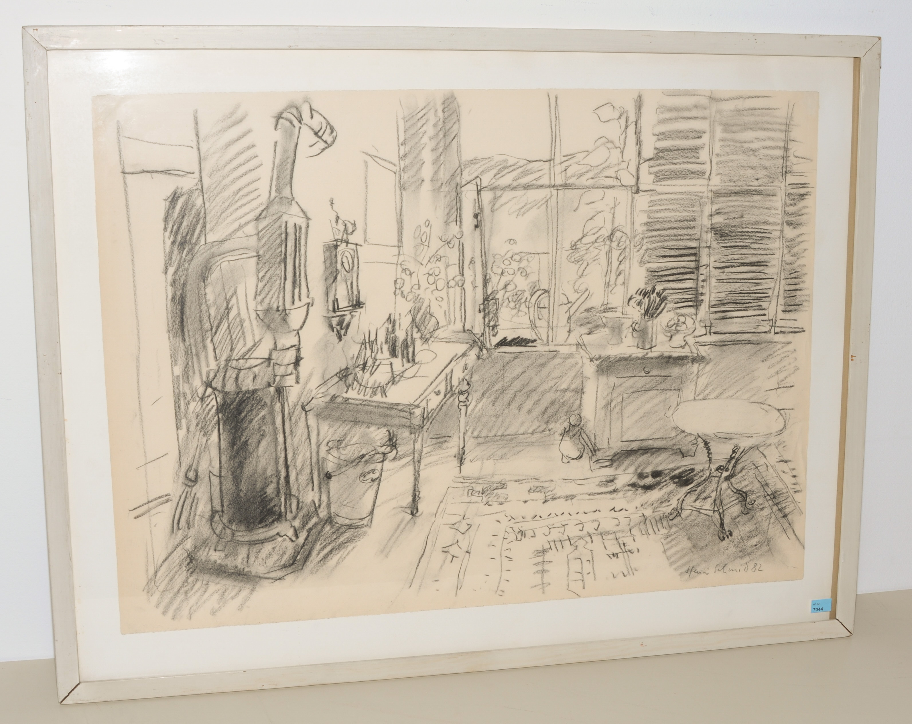 Interieur. 1982. Kohle auf Papier. Unten rechts signiert und datiert. Blattgrösse 53,8x75 cm. Gerahmt.