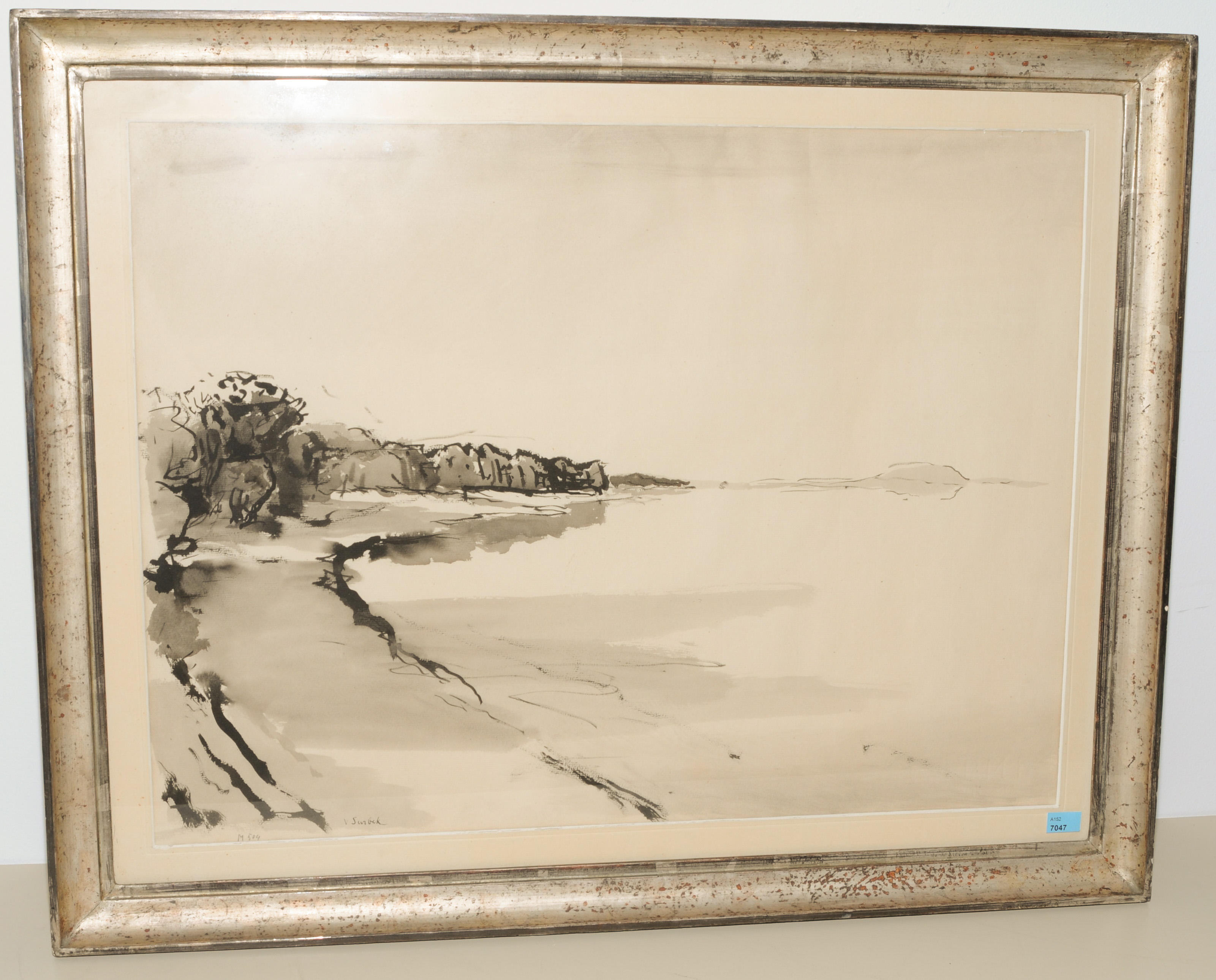 Seeufer. Tusche auf Papier. Unten links signiert und nummeriert: "M 506". Lichtmass 46x42 cm. Gerahmt.
