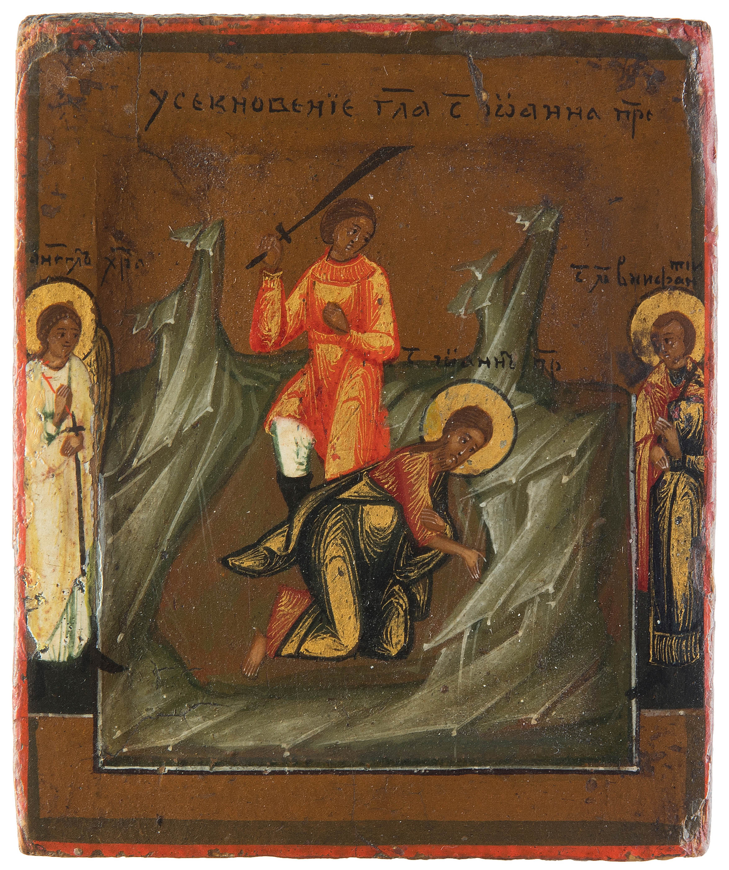 Russisch, um 1800. Tempera über Kreidegrund auf Holz. Im vertieften Mittelfeld Enthauptung des Hl. Johannes d. Vorläufers. 2 Randheilige: Schutzengel und Hl. Winfantij. 6x5 cm.
