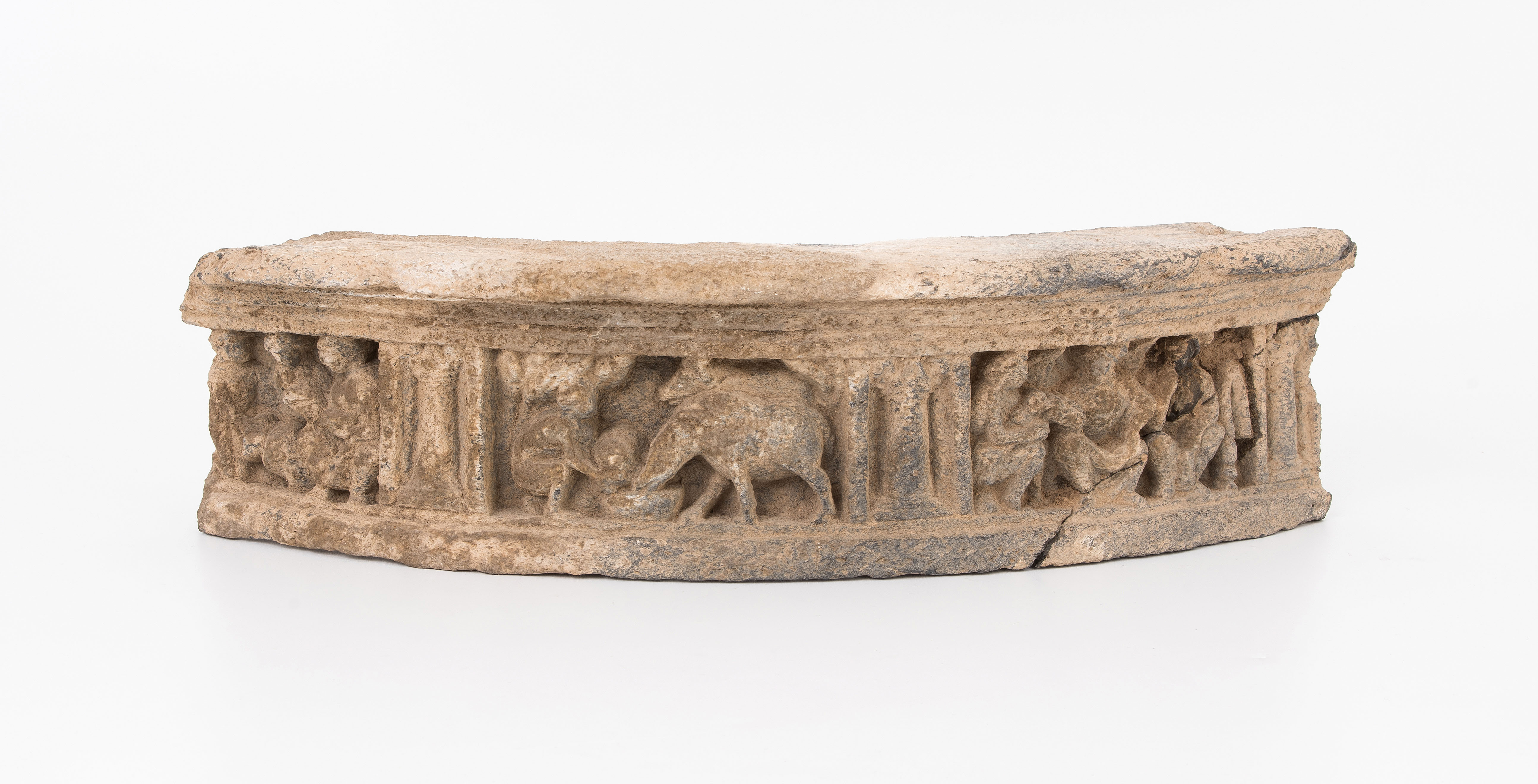 Gandhara, wohl 2./3.Jh. Grauer Schiefer. Gerundetes Friesfragment mit figürlichen Szenen. H 9,3, L 35 cm. - Repariert.