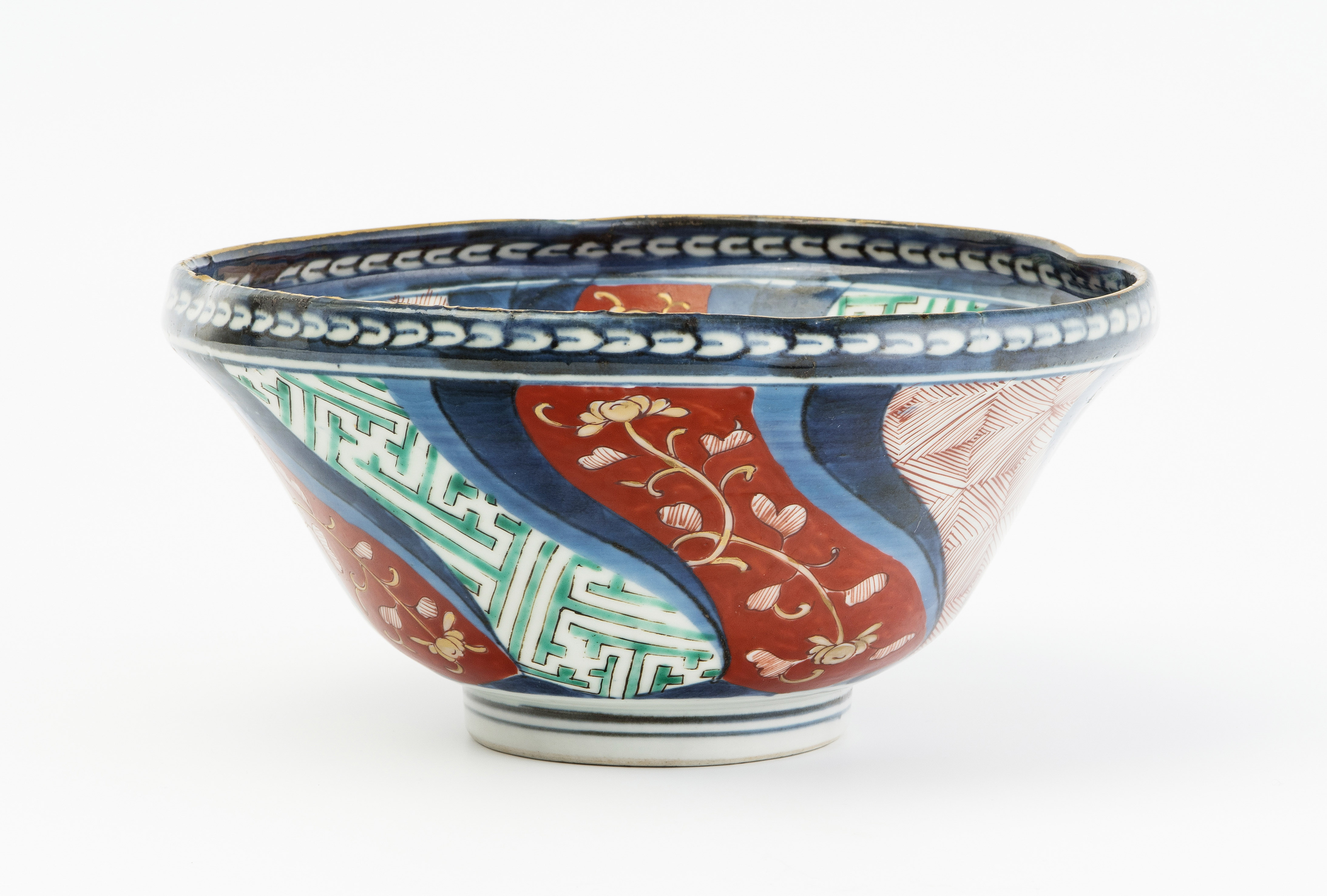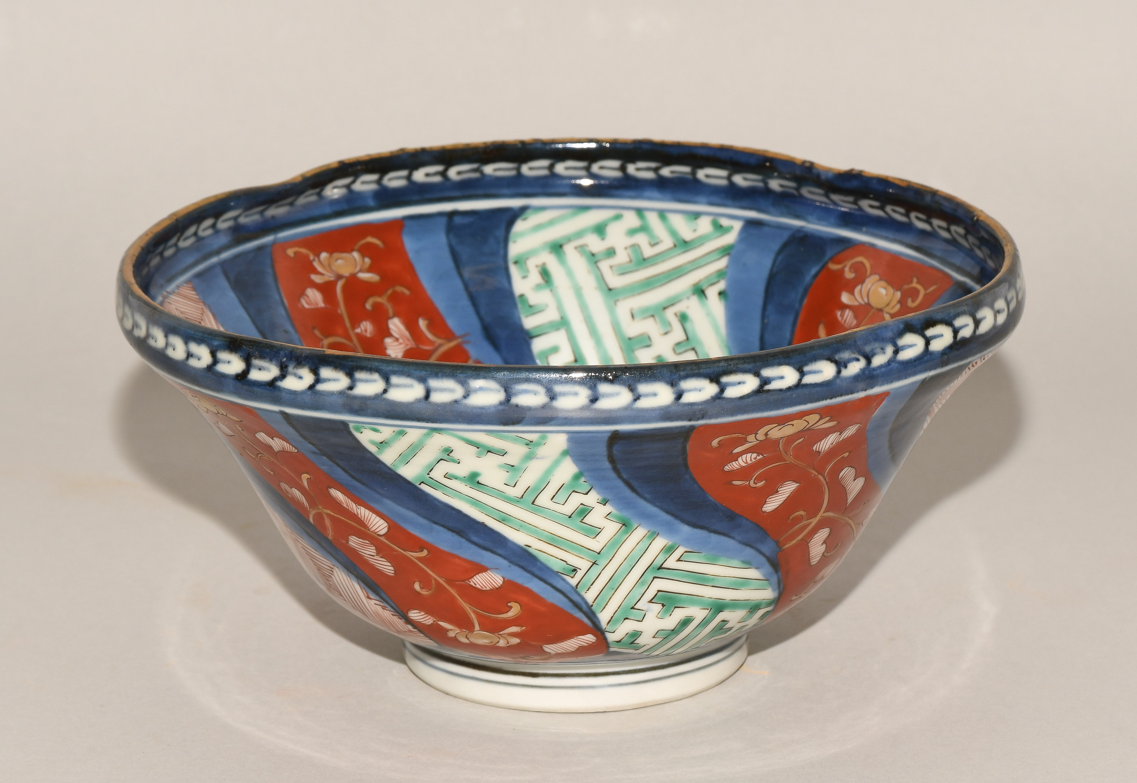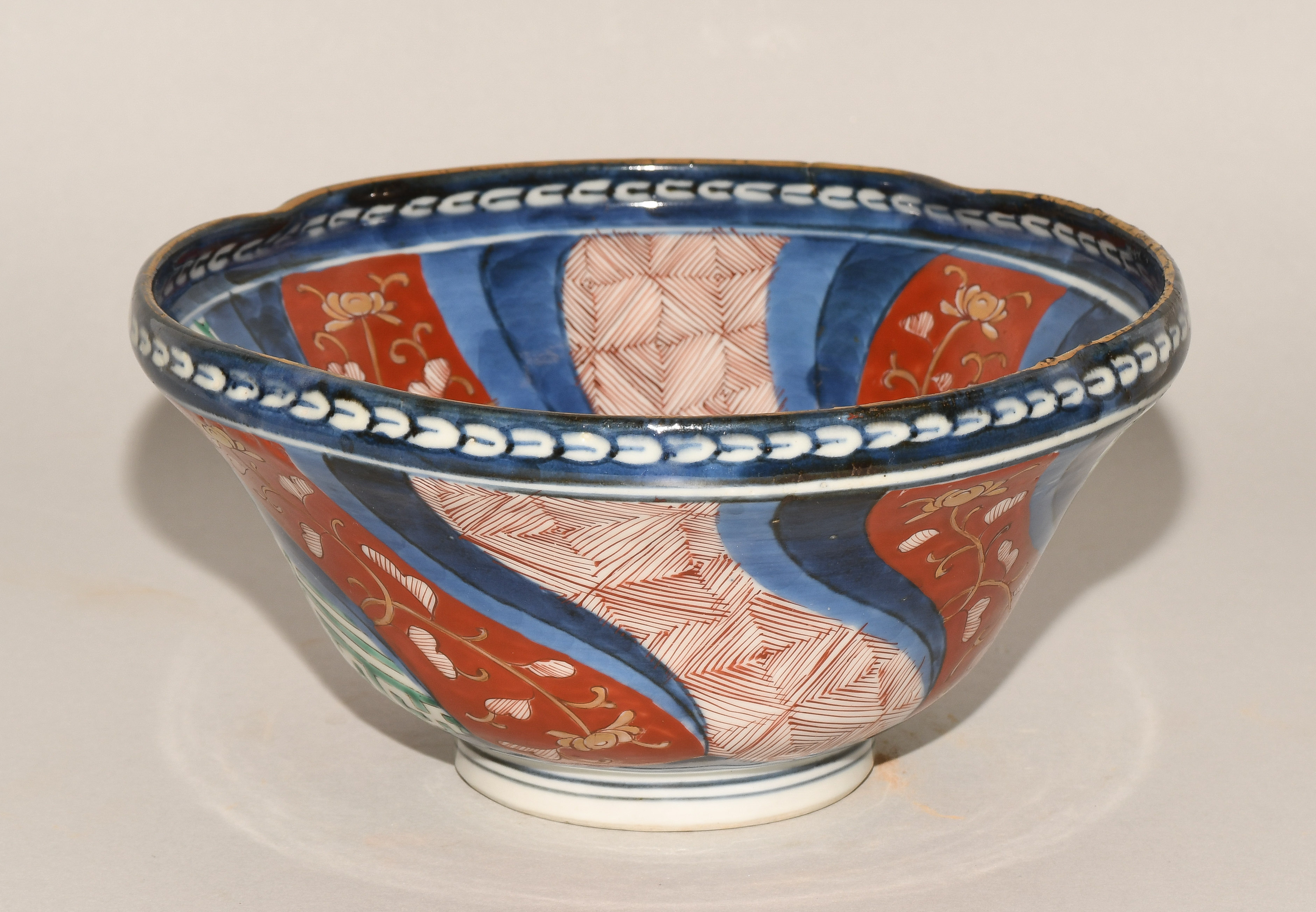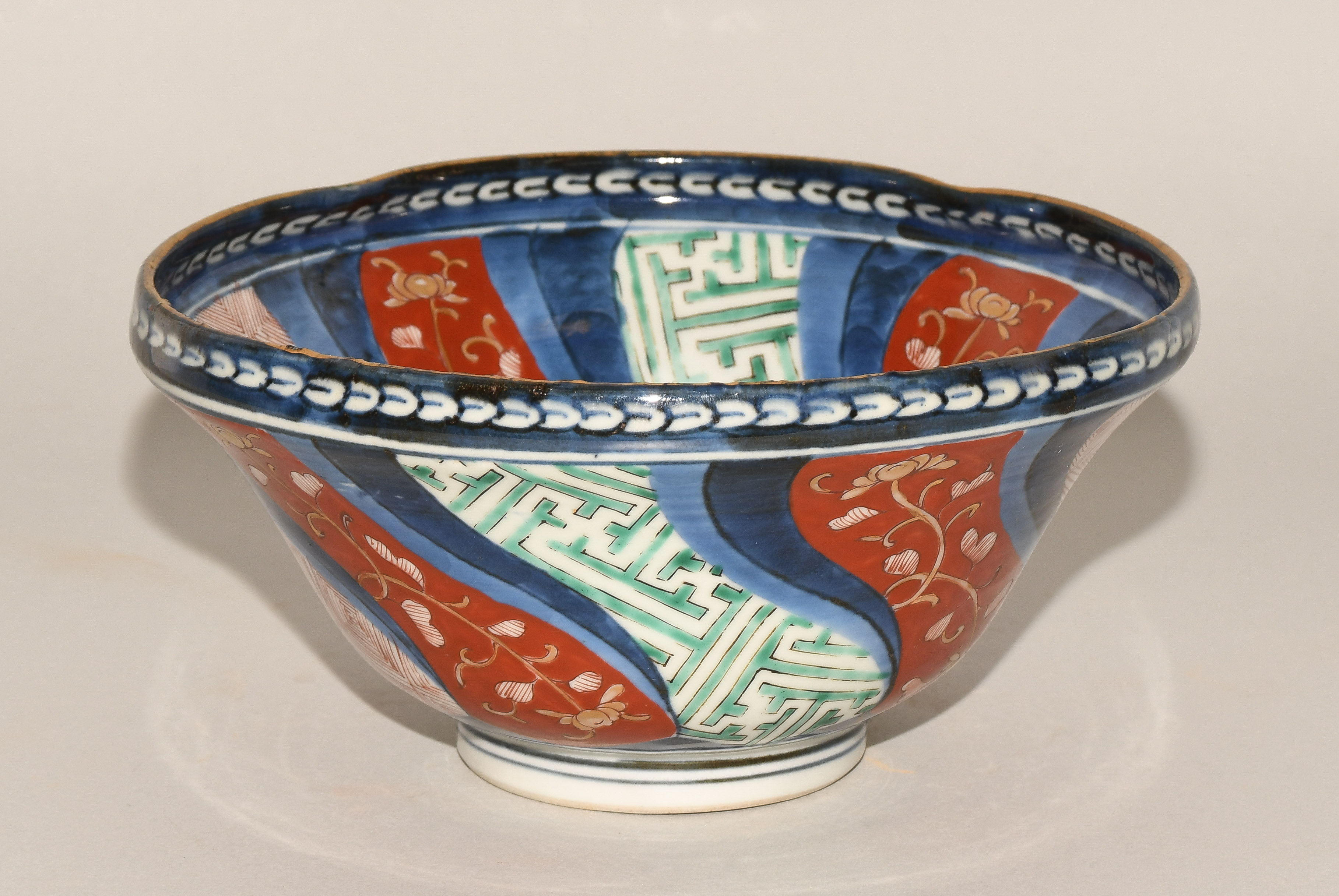 Japan, 19.Jh. Porzellan. Imari. Fassonierter Rand. Floraler und geometrischer Dekor. H9, D 18 cm.