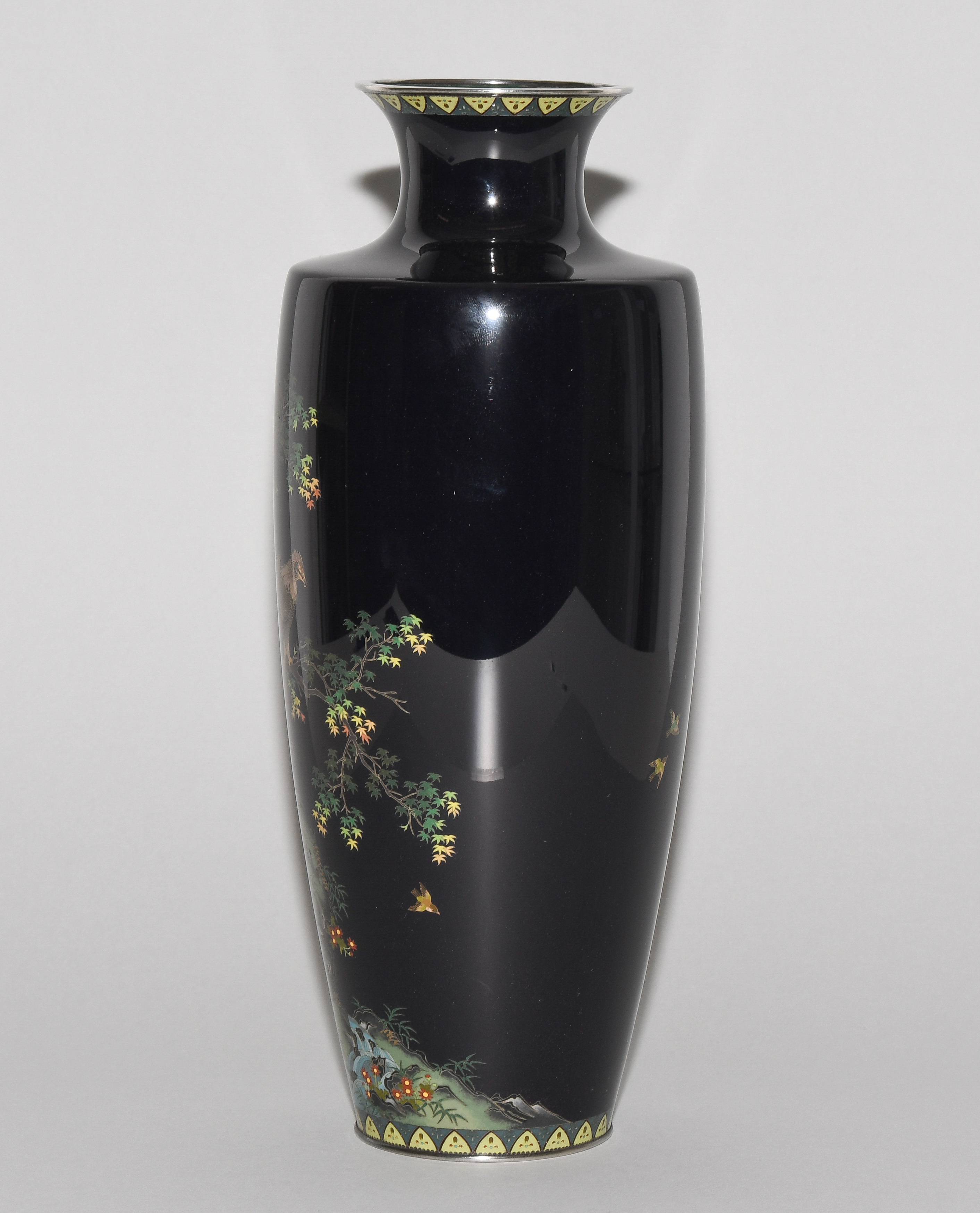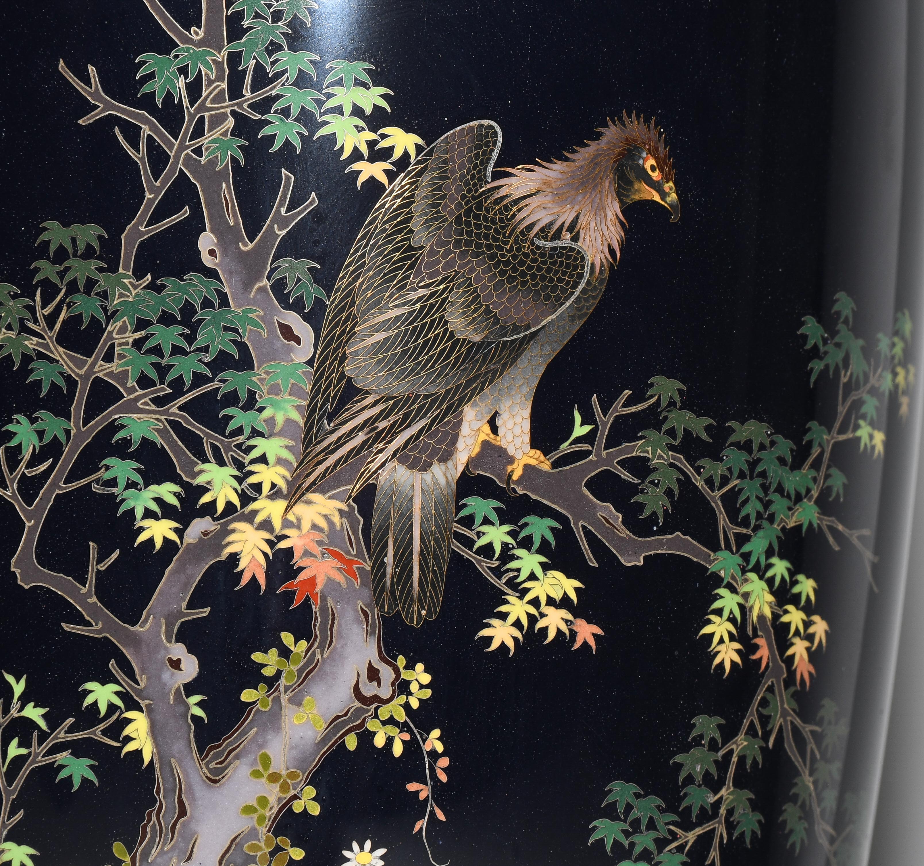 Japan, Meiji-Zeit. Inaba Nanaho Studio-Marke. Mit Jungin Silberpunze. Polychromer Dekor auf dunkelblauem Grund mit Darstellung eines Adlers auf Ahorn-Baum, gestaltet mit unterschiedlich dünnem Gold- und Silberdraht. H 31 cm. - Haarrisse auf innerer Mündung.