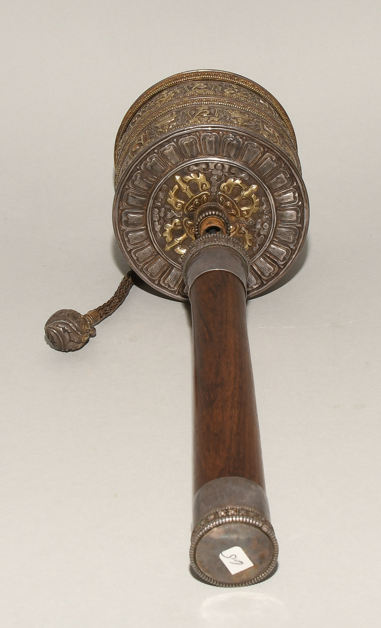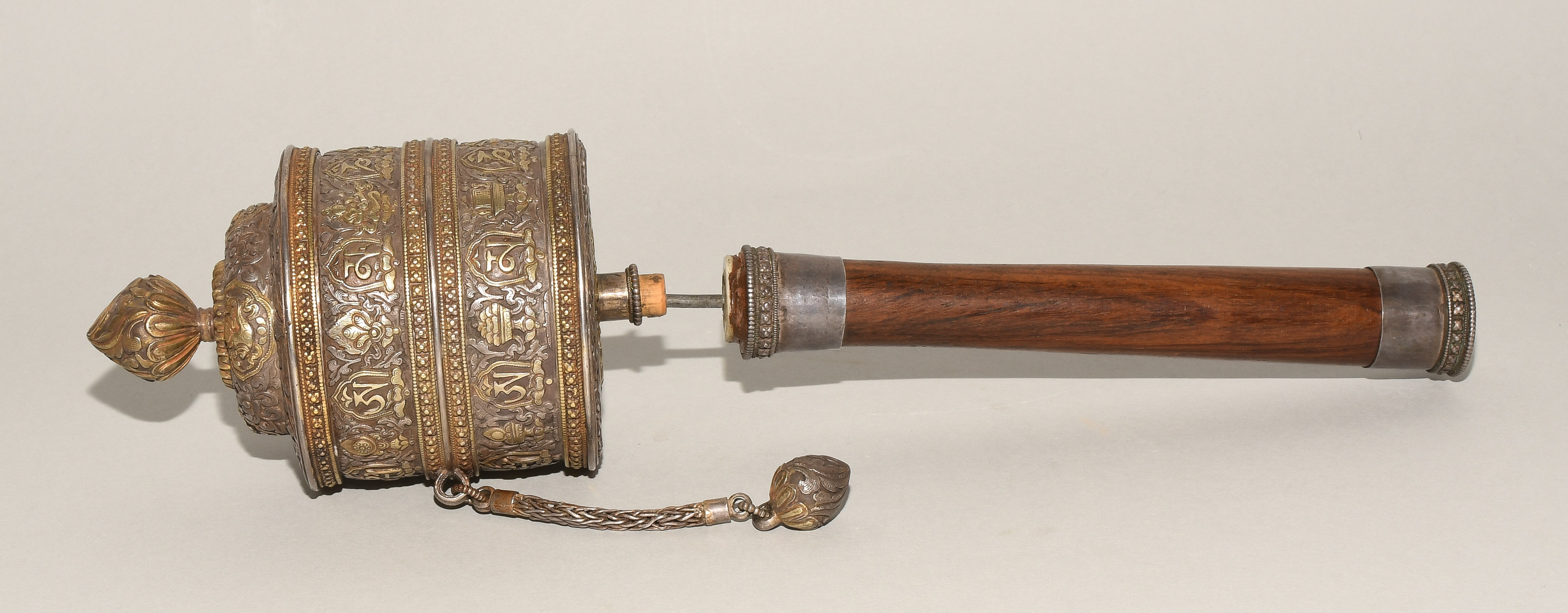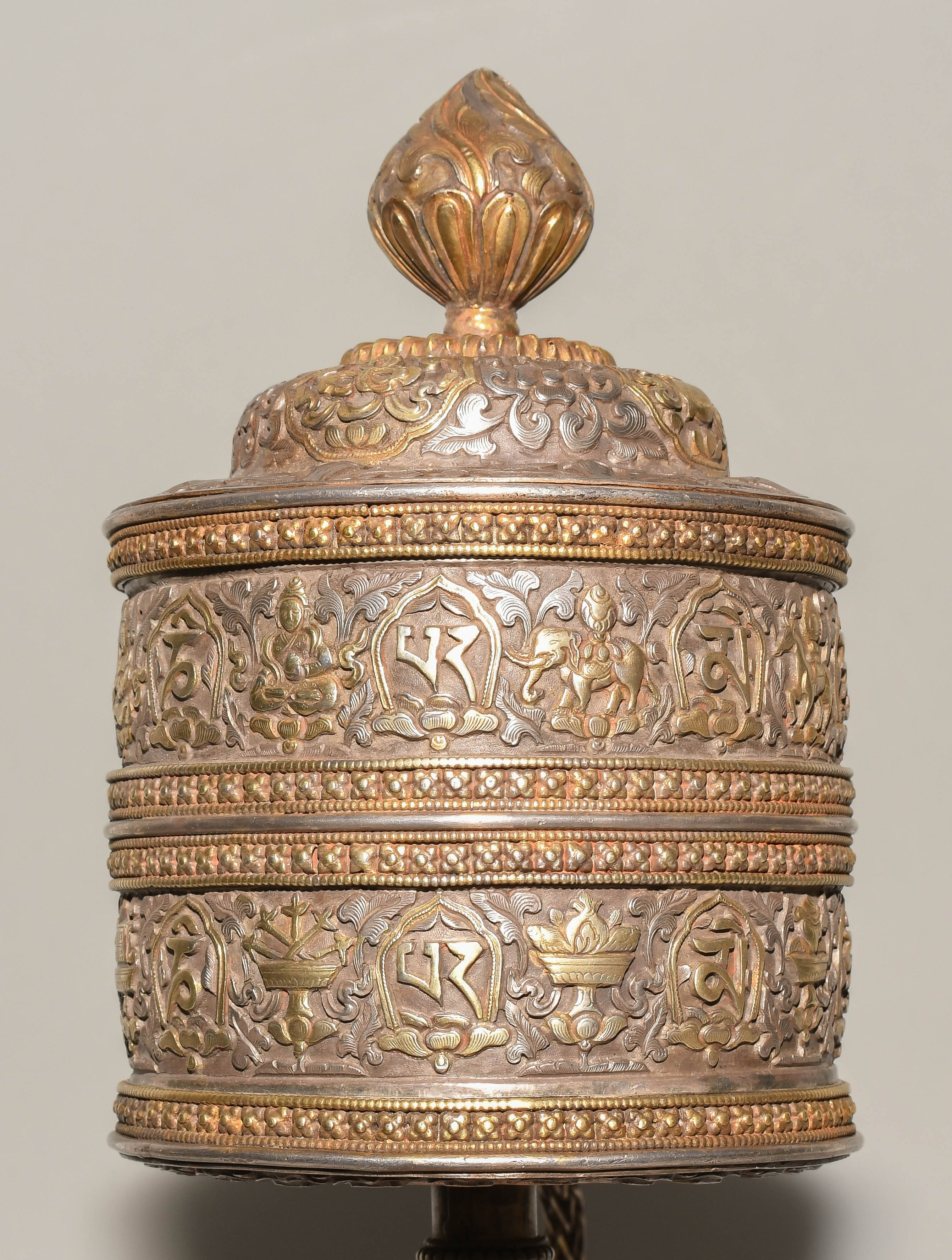 Tibet. Silber, teilweise vergoldet. Reliefiert mit buddhistischen Symbolen, Figuren, Tieren und Mantras in Nische. GL 33,5, Mühle 12,5, D 8,5 cm.