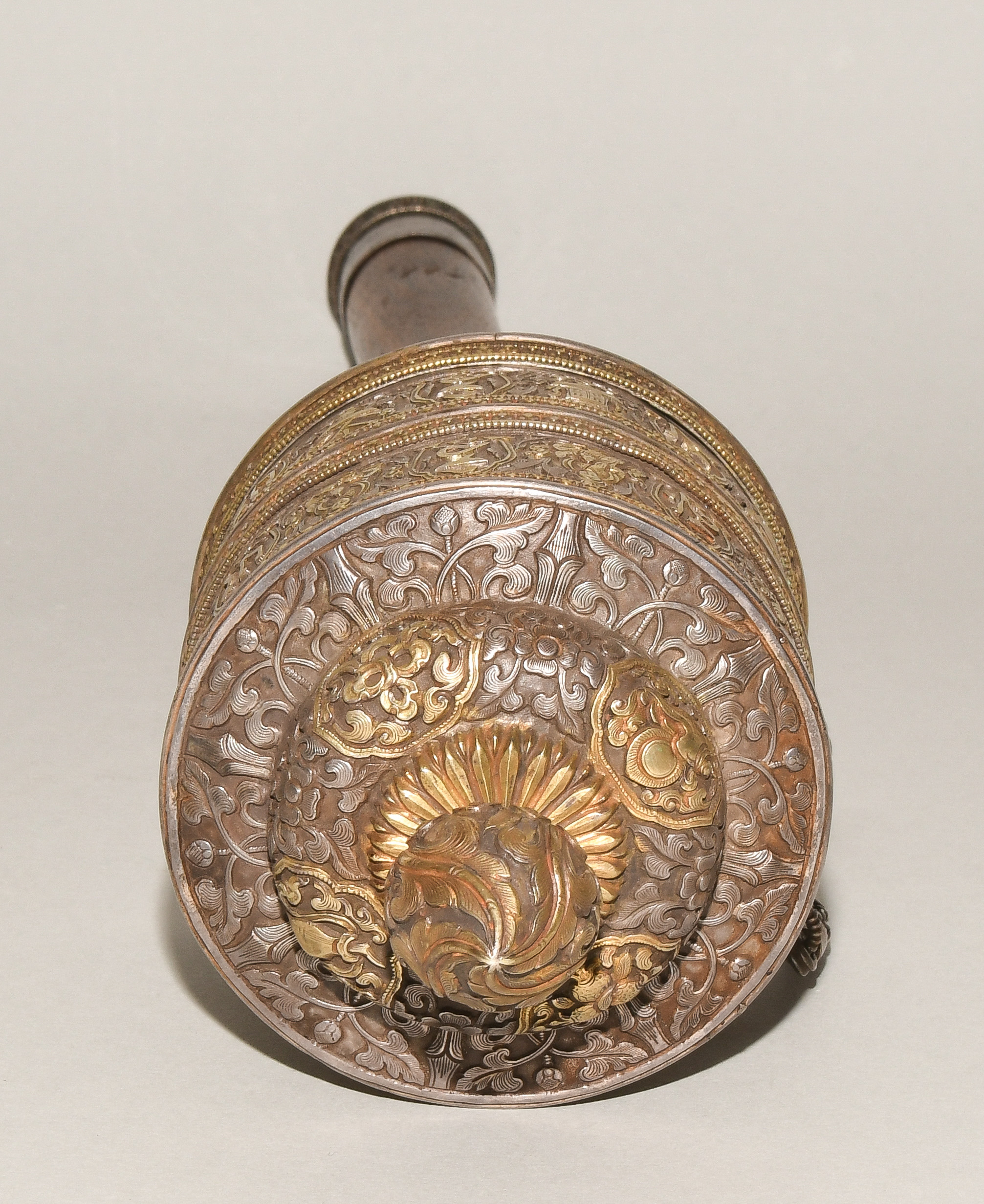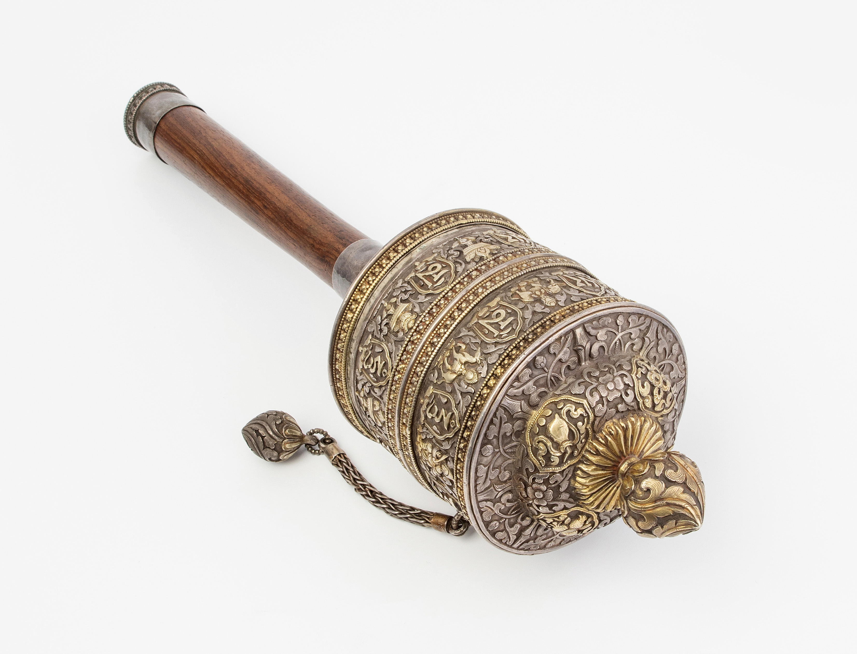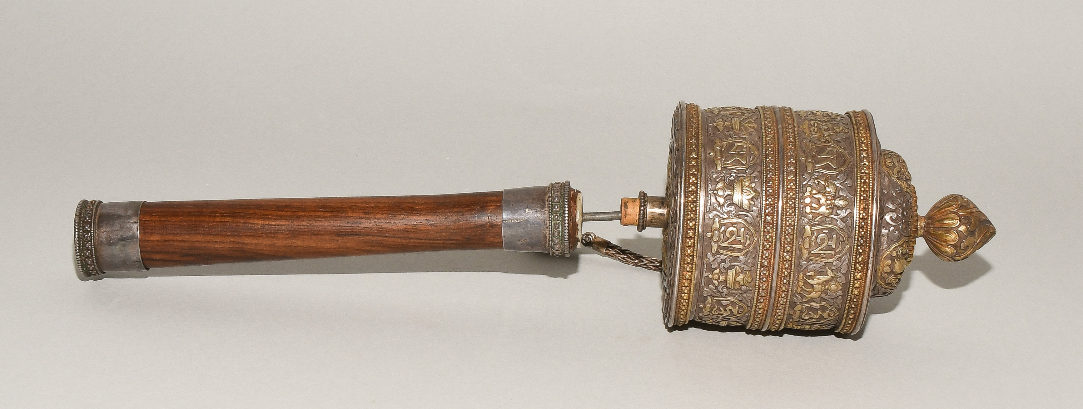 Tibet. Silber, teilweise vergoldet. Reliefiert mit buddhistischen Symbolen, Figuren, Tieren und Mantras in Nische. GL 33,5, Mühle 12,5, D 8,5 cm.