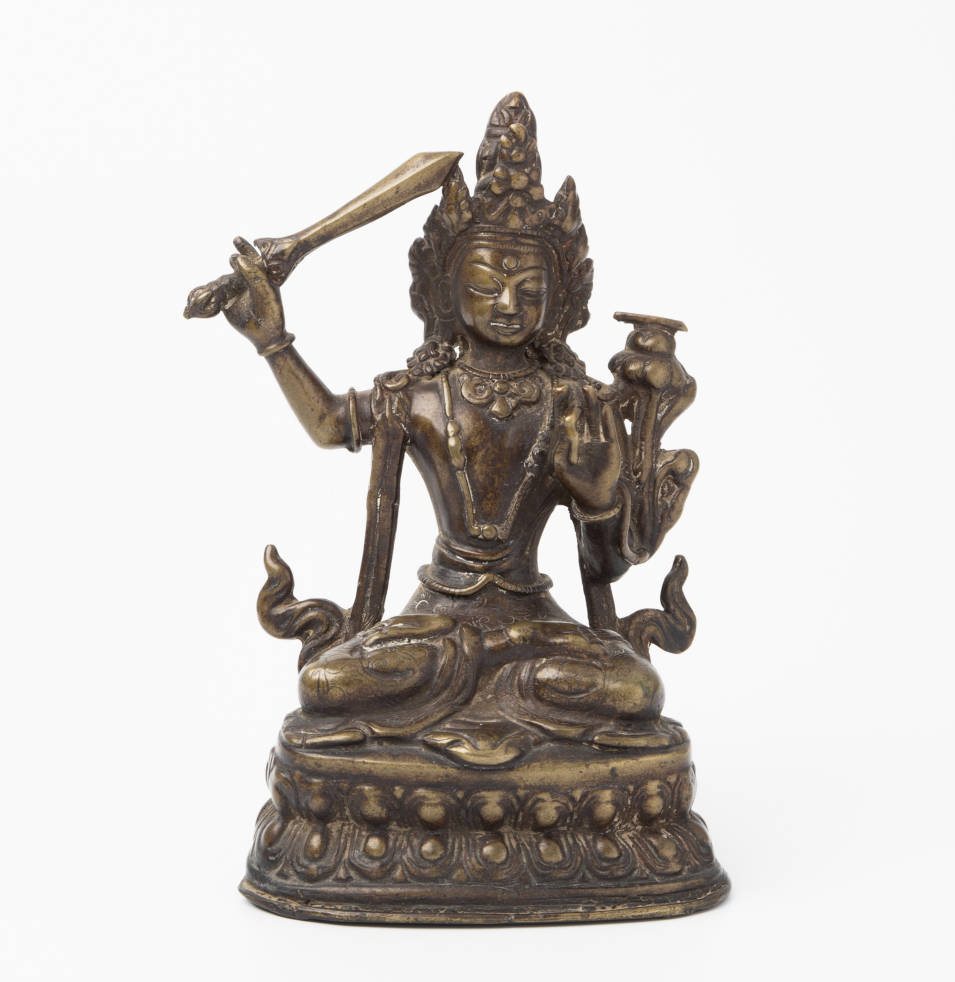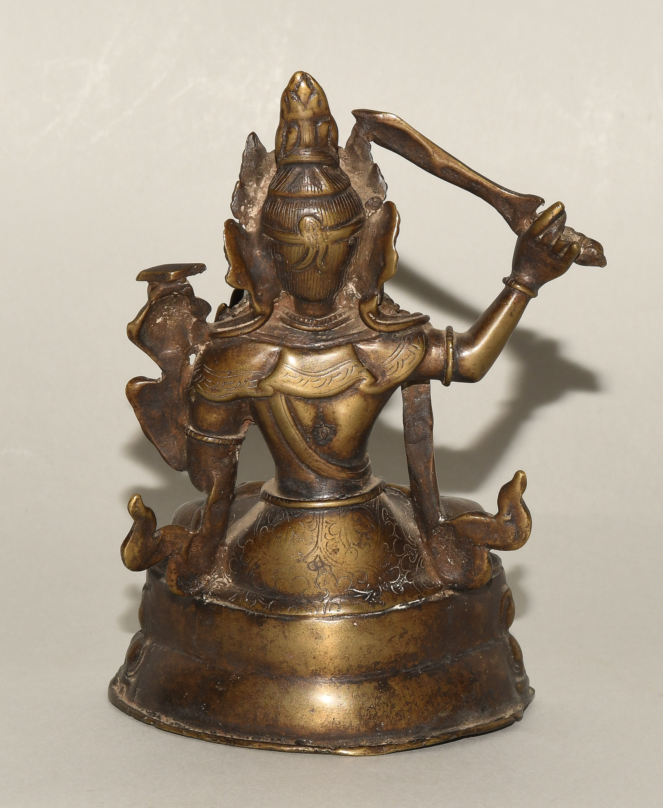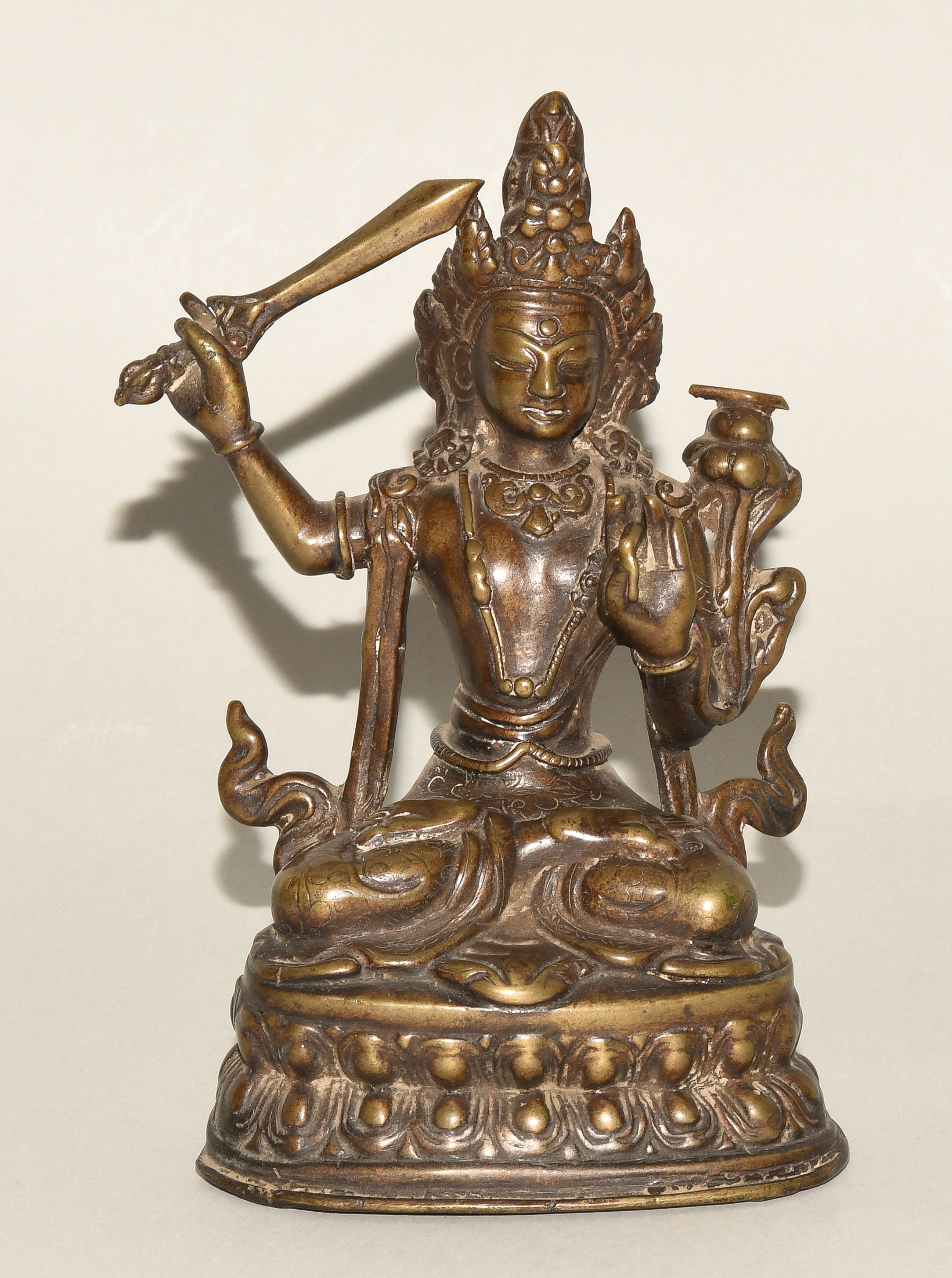 Nepal. Bronze. Auf doppeltem Lotossockel in padmasana sitzender Manjushri, seine rechte Hand das Schwert schwingend, seine linke Hand den Stengel des Lotos mit dem Buch der Transzendenten Weisheit haltend. Boden offen. H 15,8 cm.