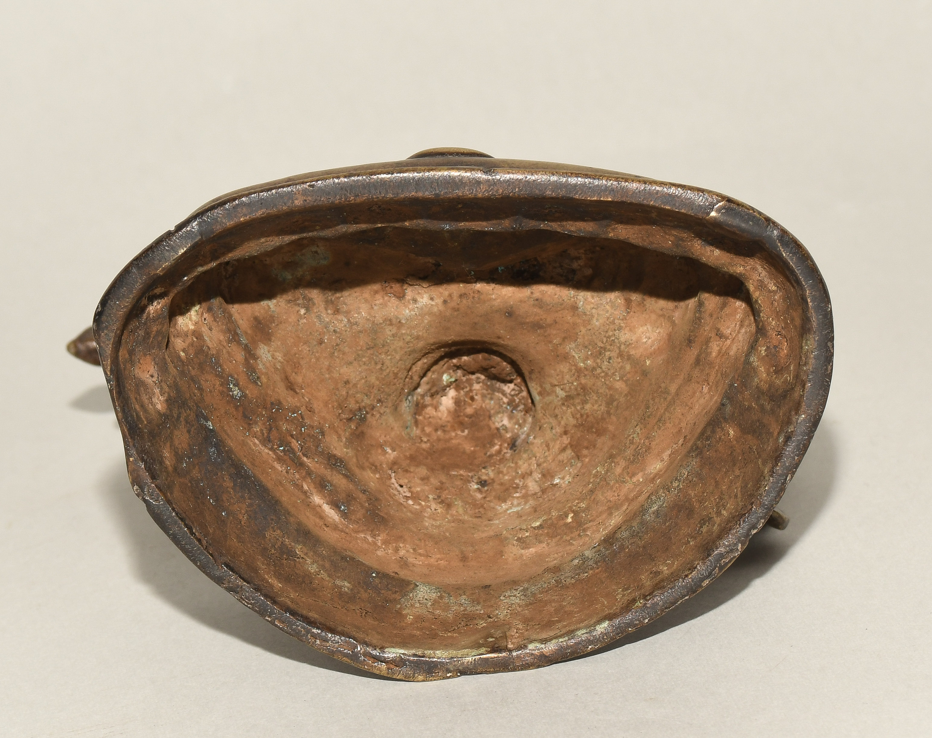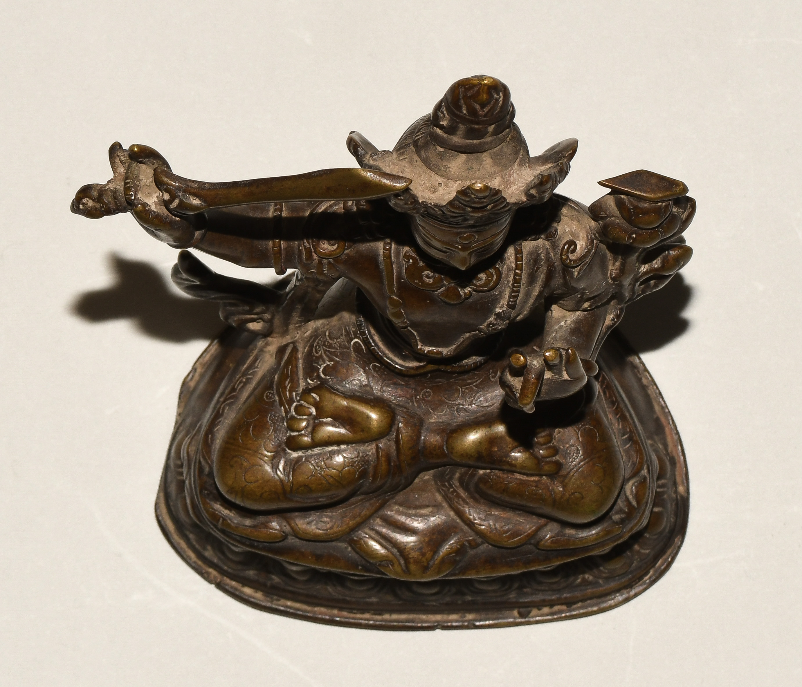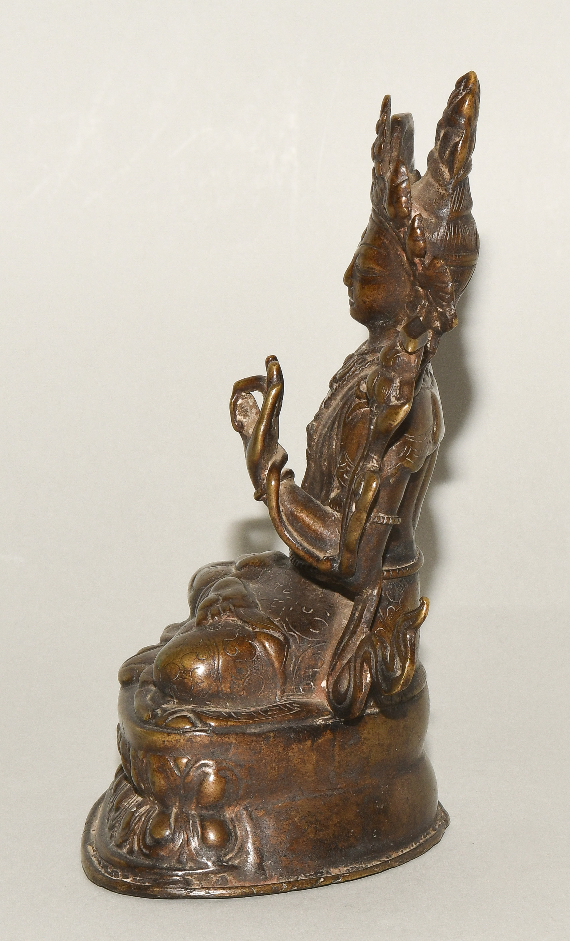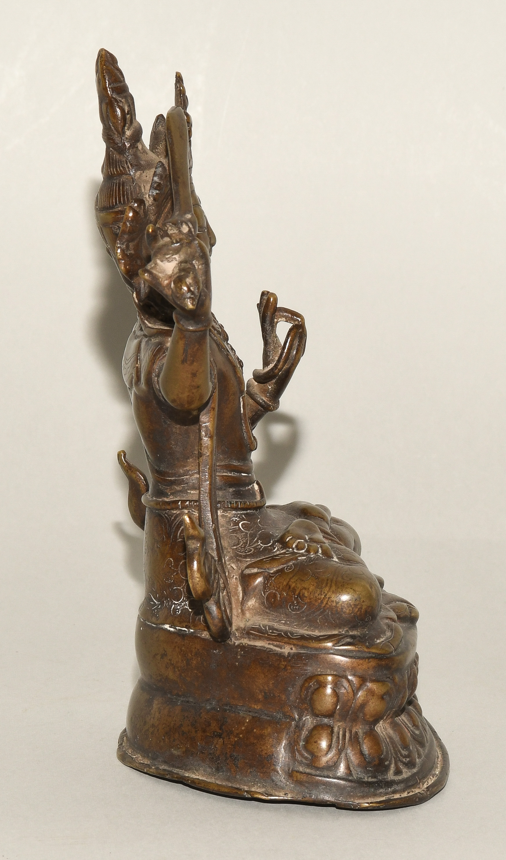 Nepal. Bronze. Auf doppeltem Lotossockel in padmasana sitzender Manjushri, seine rechte Hand das Schwert schwingend, seine linke Hand den Stengel des Lotos mit dem Buch der Transzendenten Weisheit haltend. Boden offen. H 15,8 cm.
