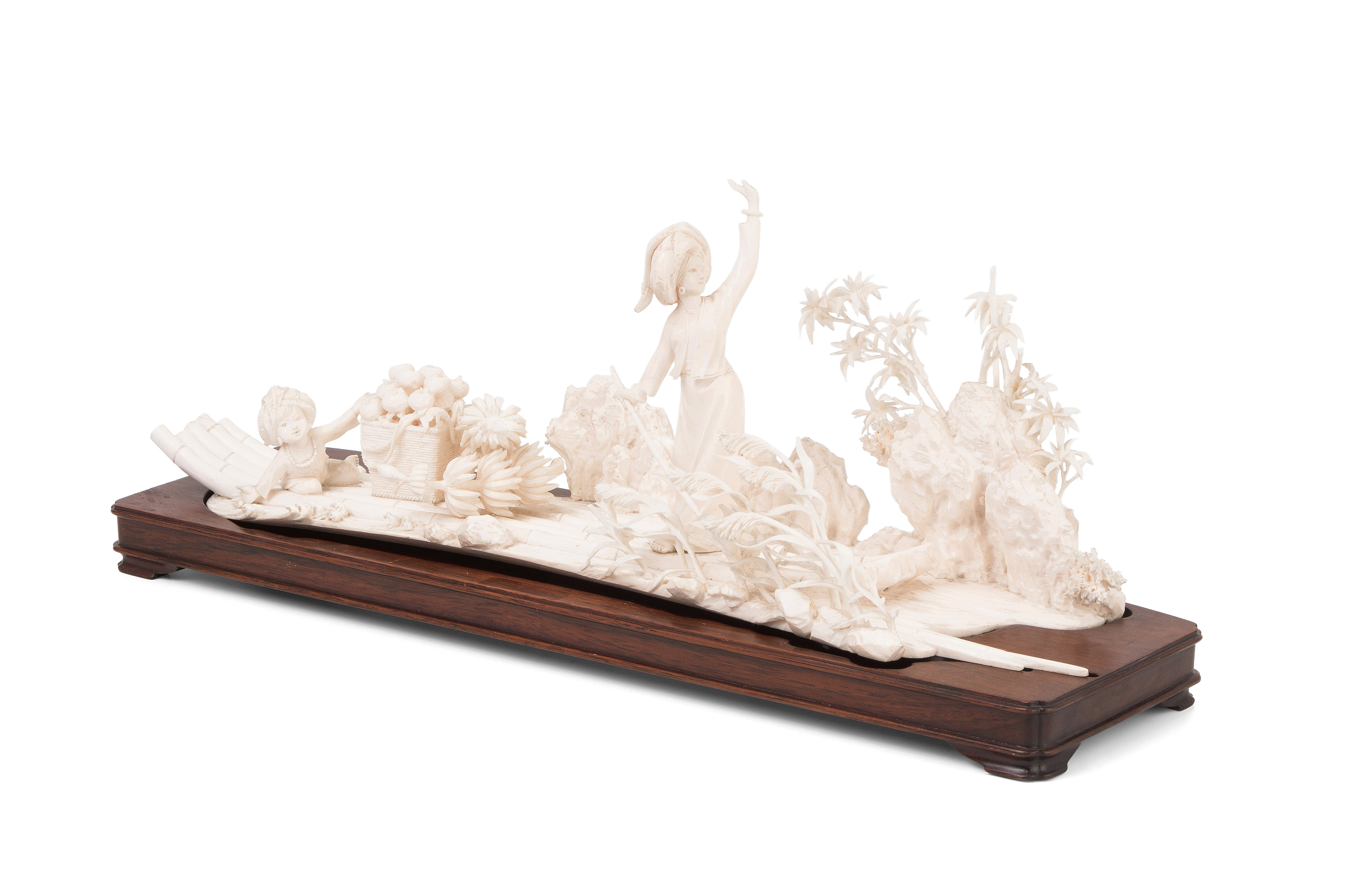 China, 20.Jh. Elfenbein. Langes, schmales Floss, mit junger Frau auf der Vorderseite stehend, das Floss dem Ufer entlang manövrierend. In der Mitte liegen ein Früchtekorb und Bananenstauden. Ihr Kind sitzt auf der Hinterseite und spielt mit dem Wasser. L 39 cm. Mit passendem Holzsockel. Mehrere Zweige abgebrochen.