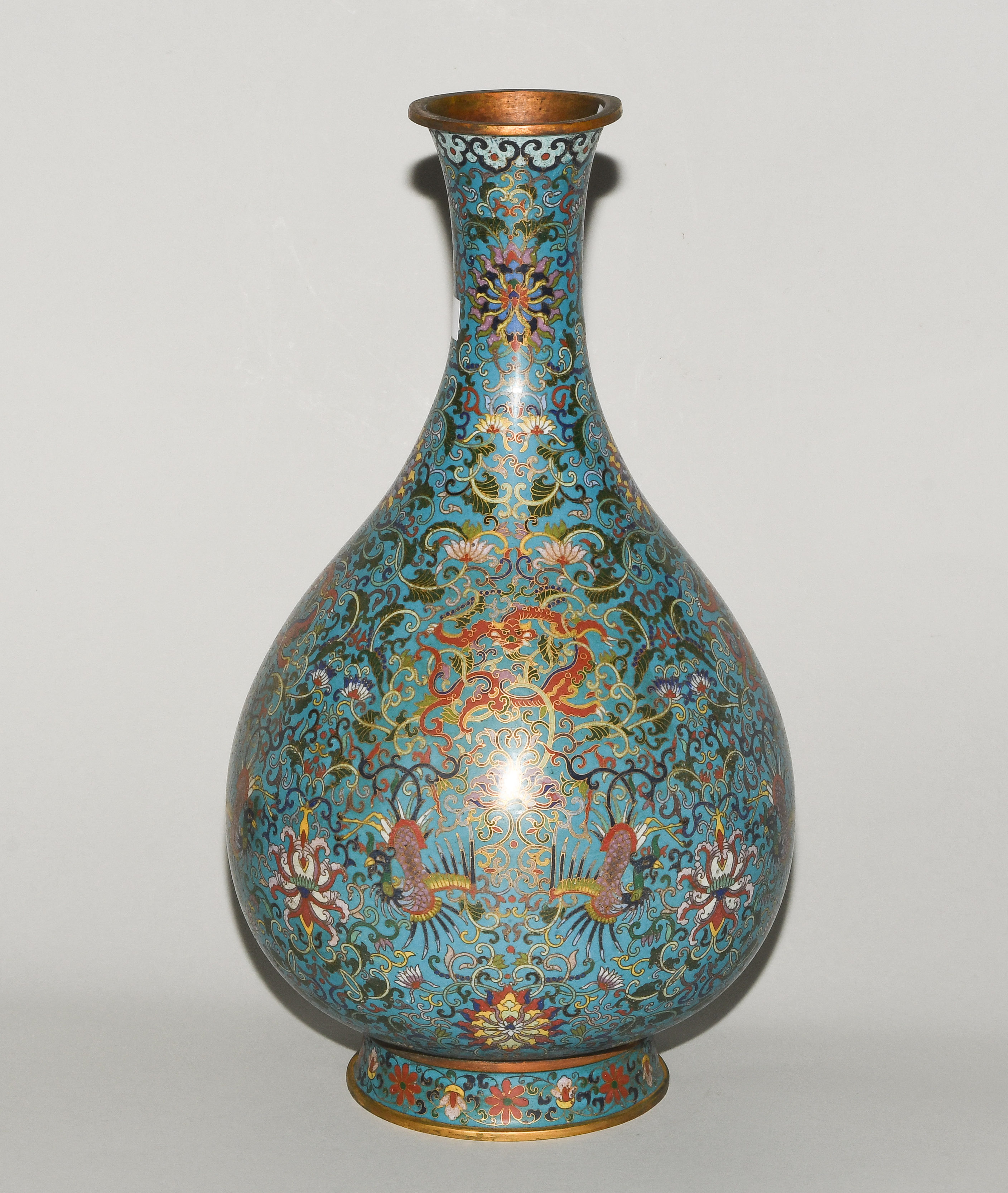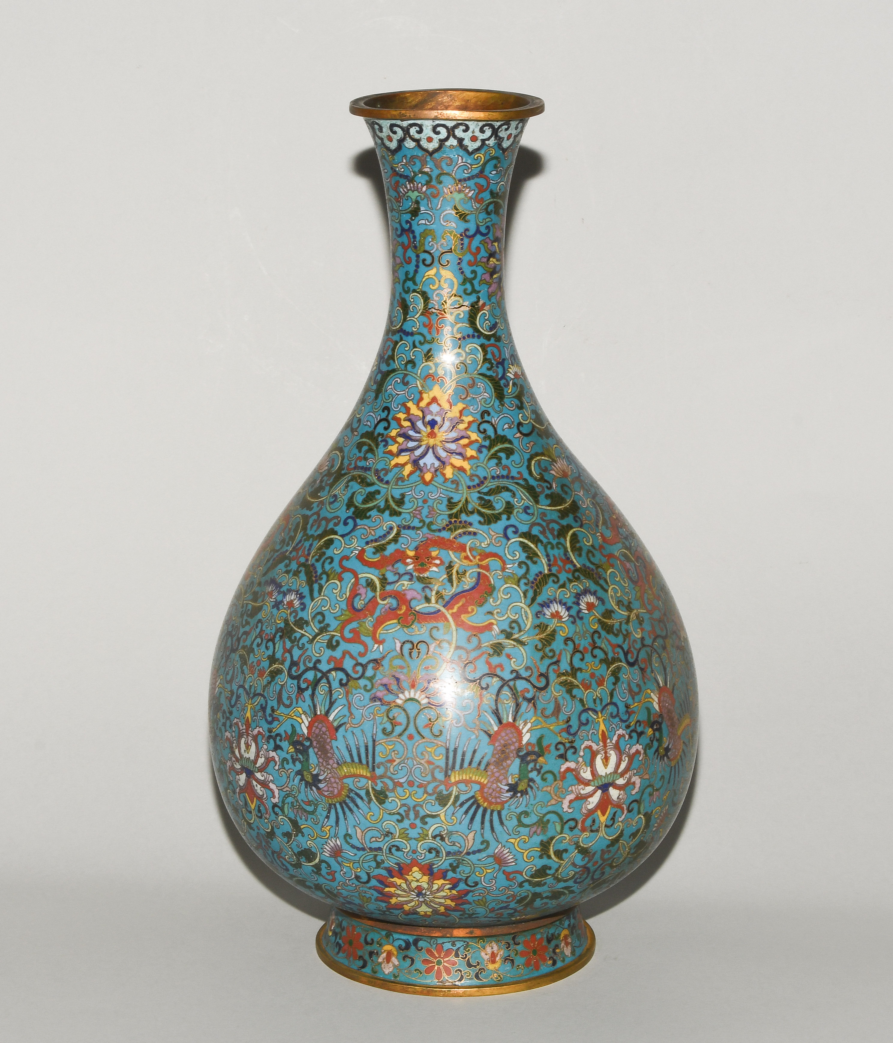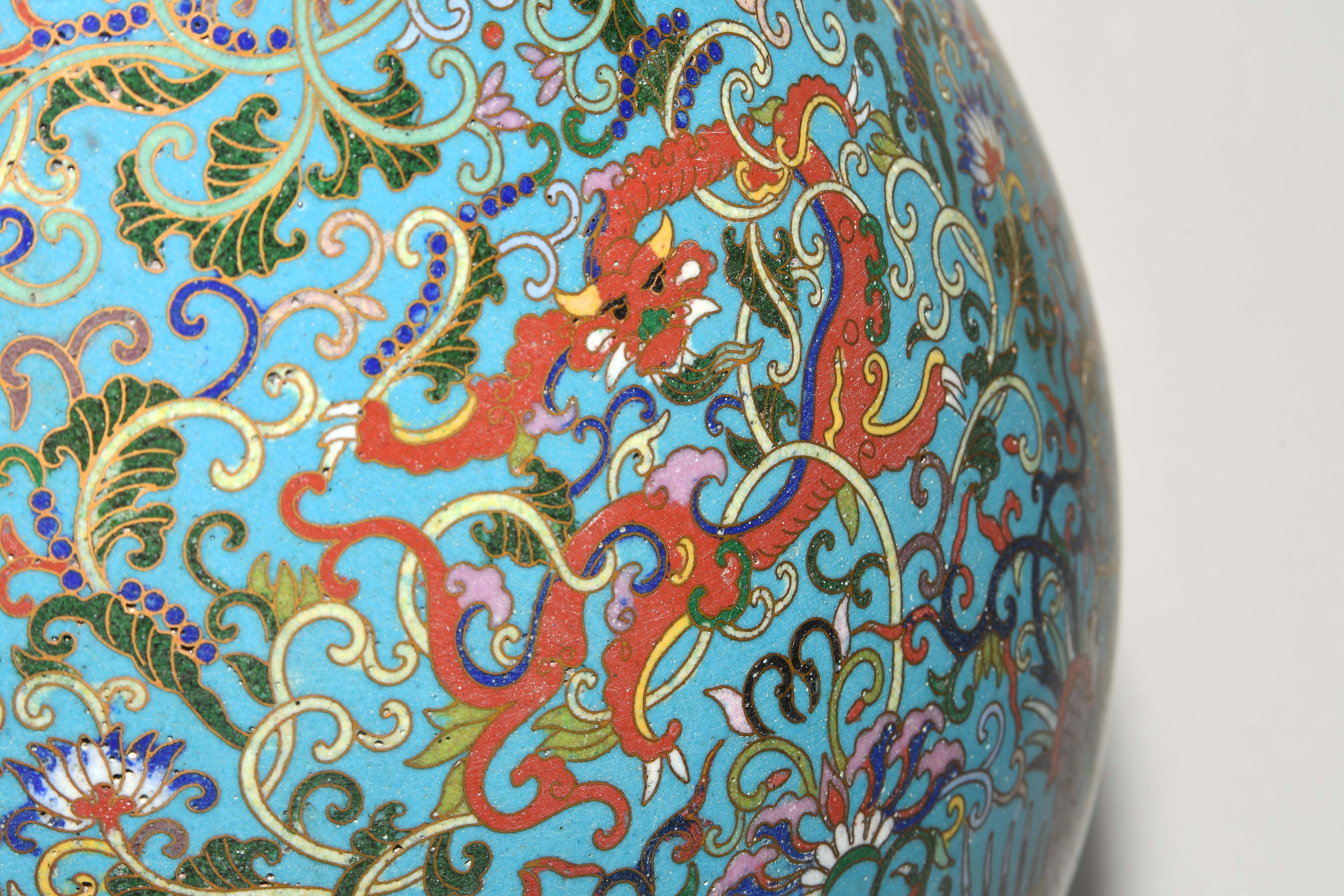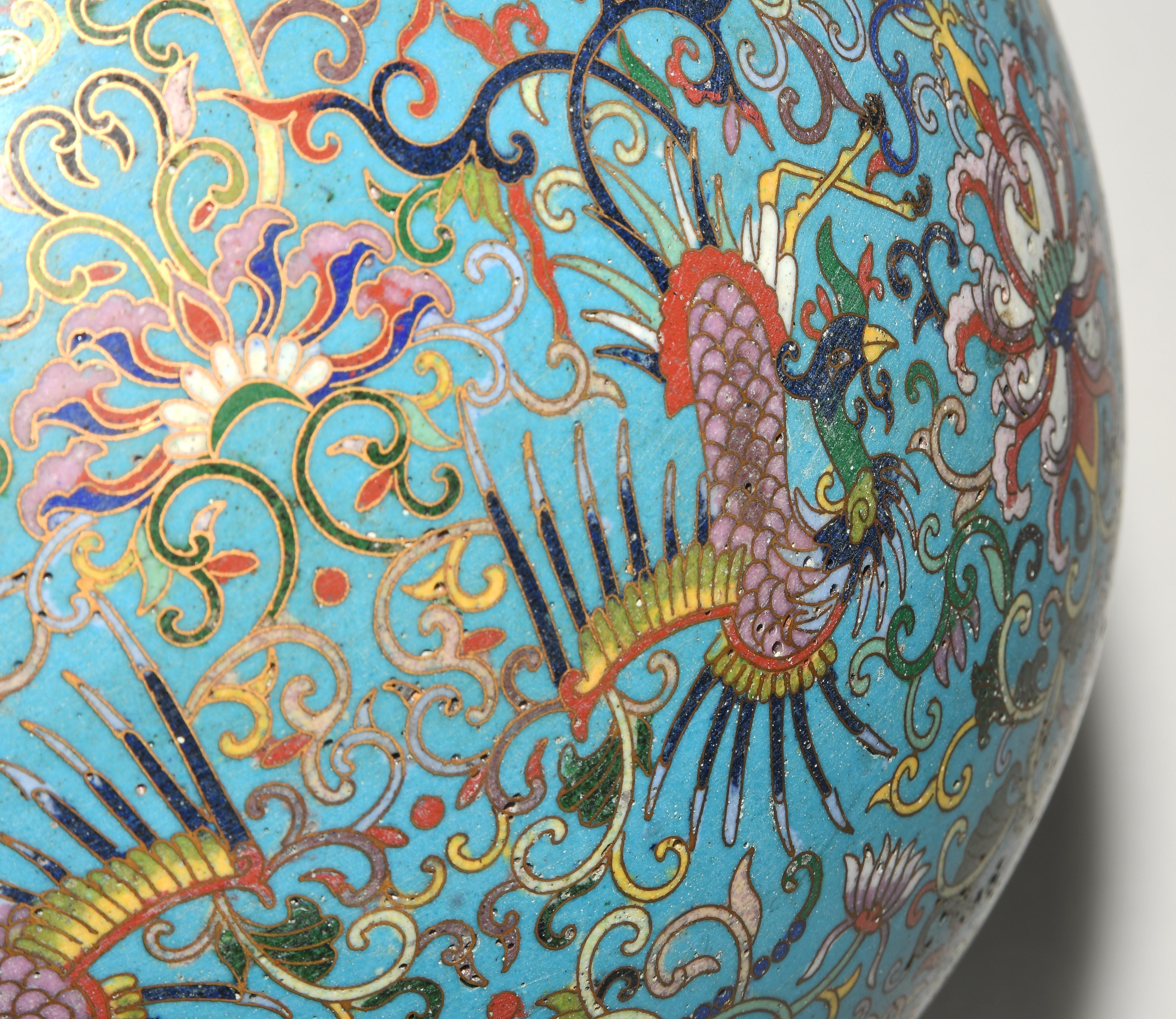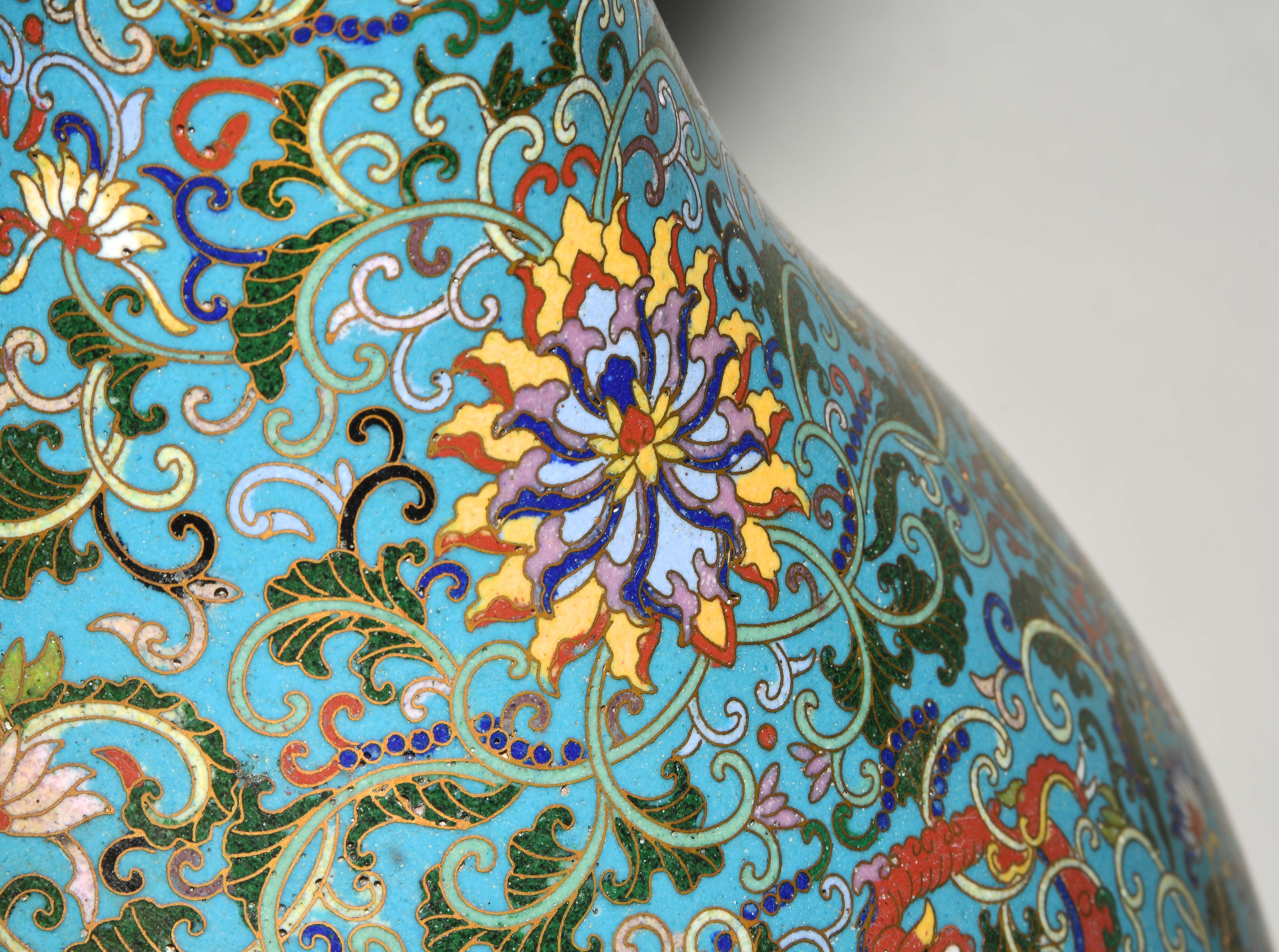 China. Qianlong-Marke. Email Cloisonné. Polychromer Drachen- und Phönix-Dekor mit Lotosblumenranken auf türkisblauem Fond. H 38 cm. - Riss am Hals.