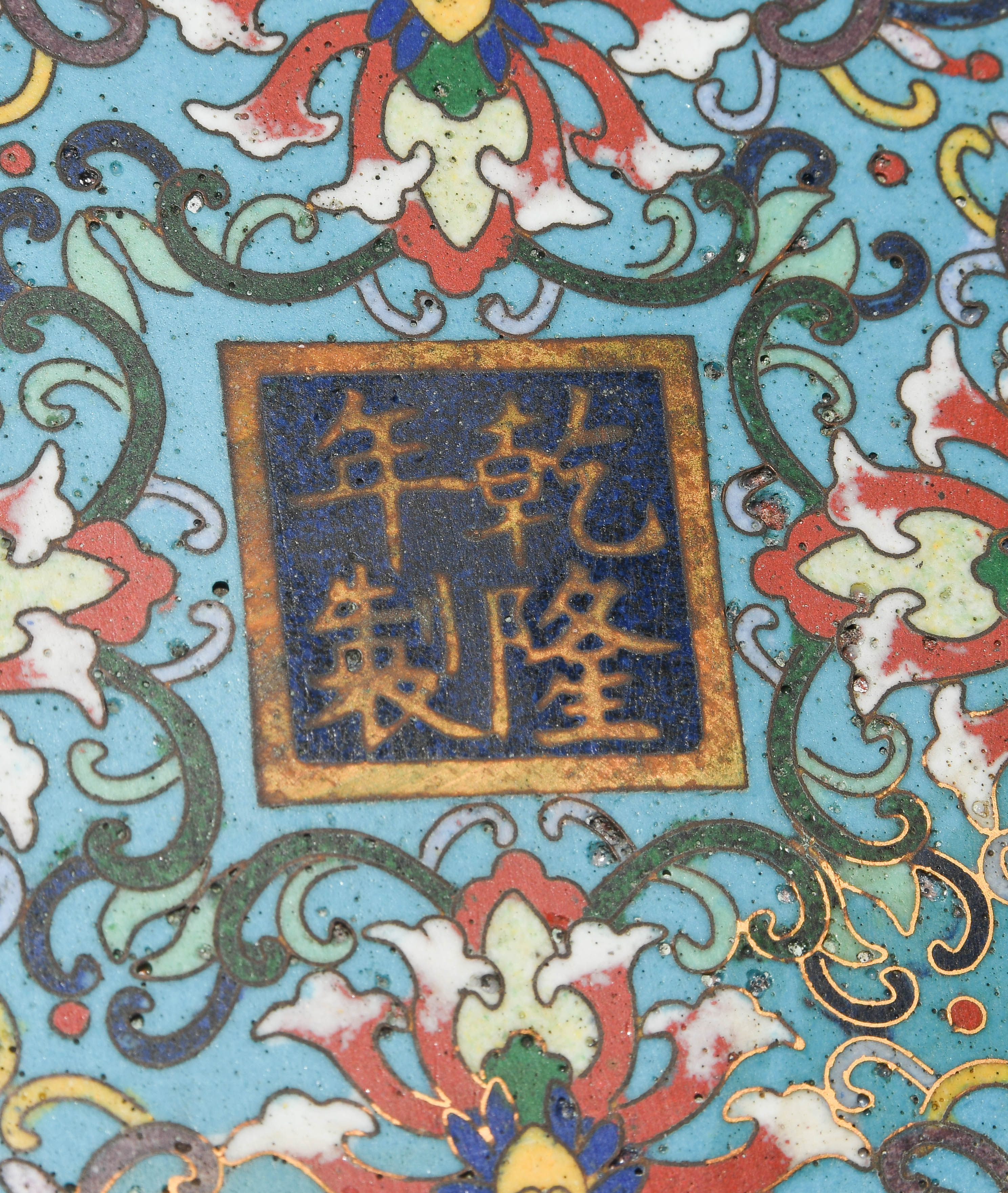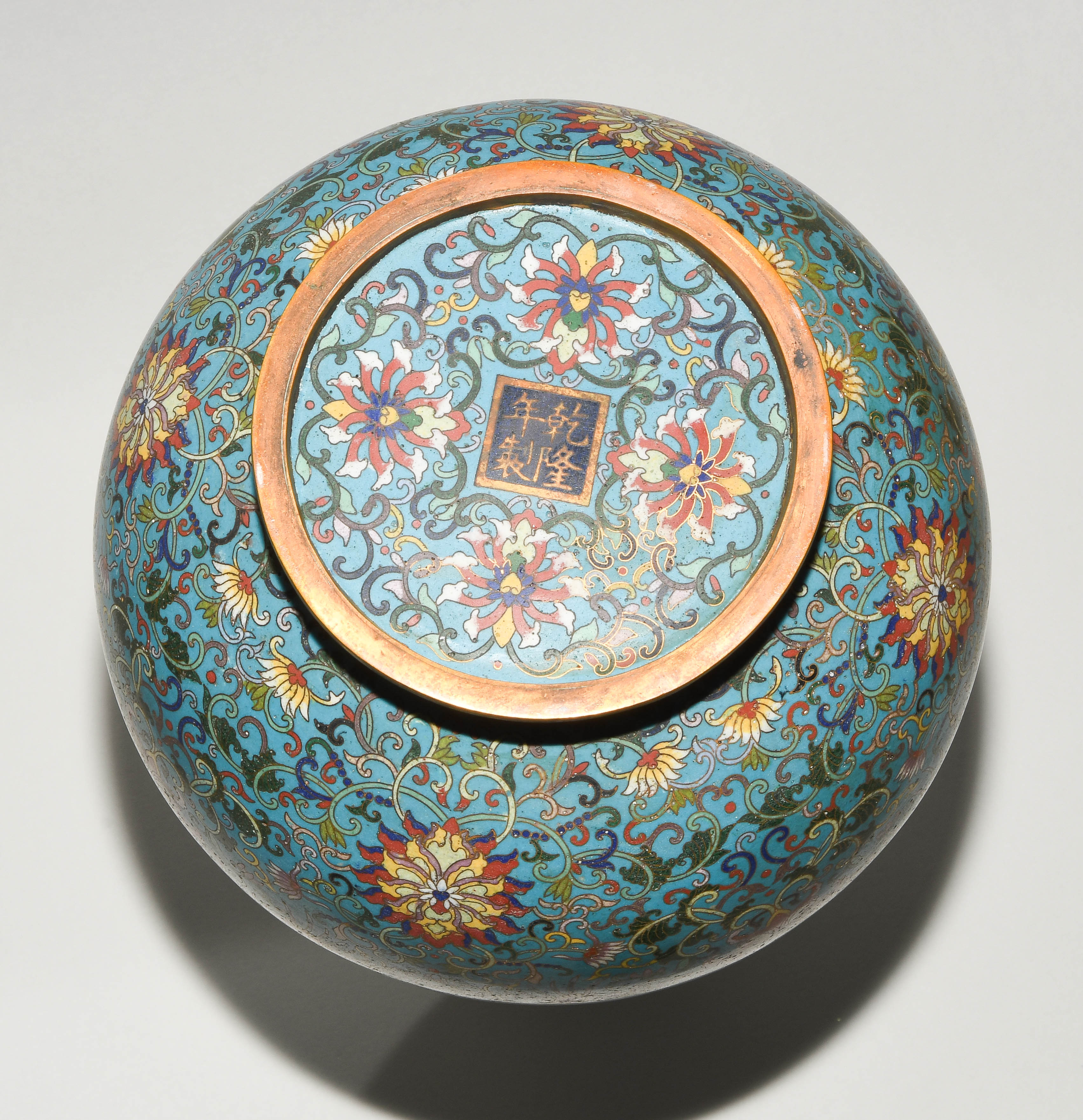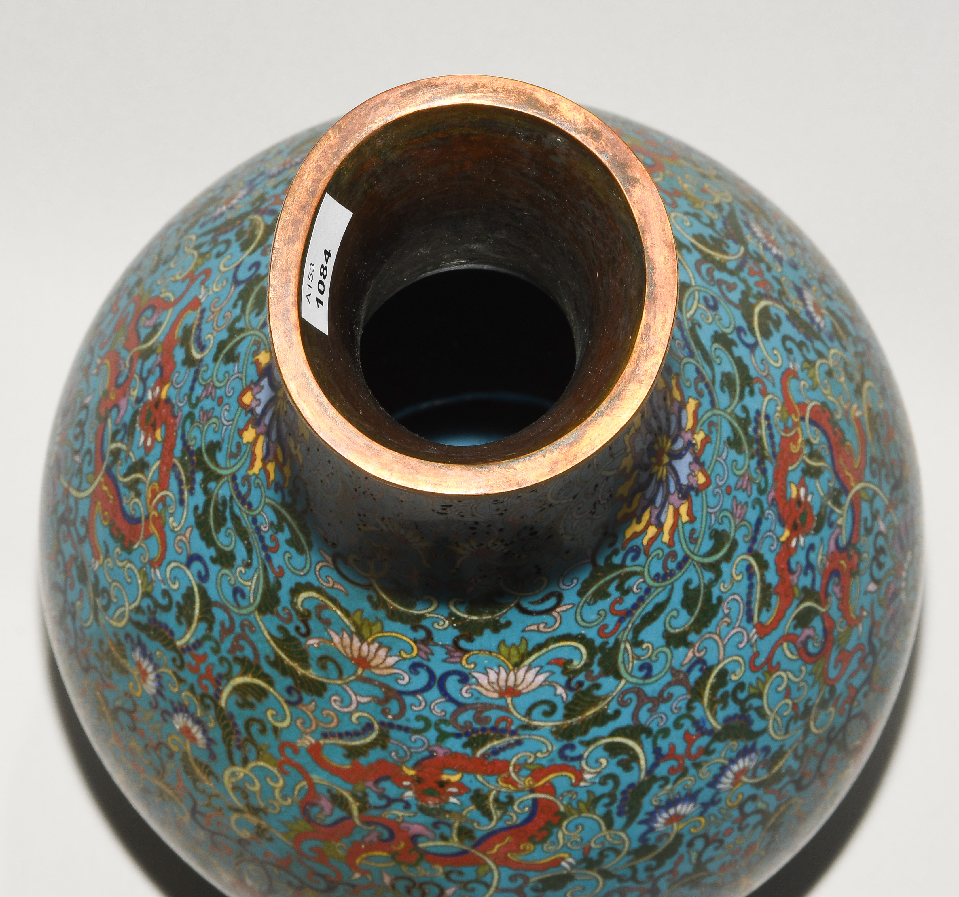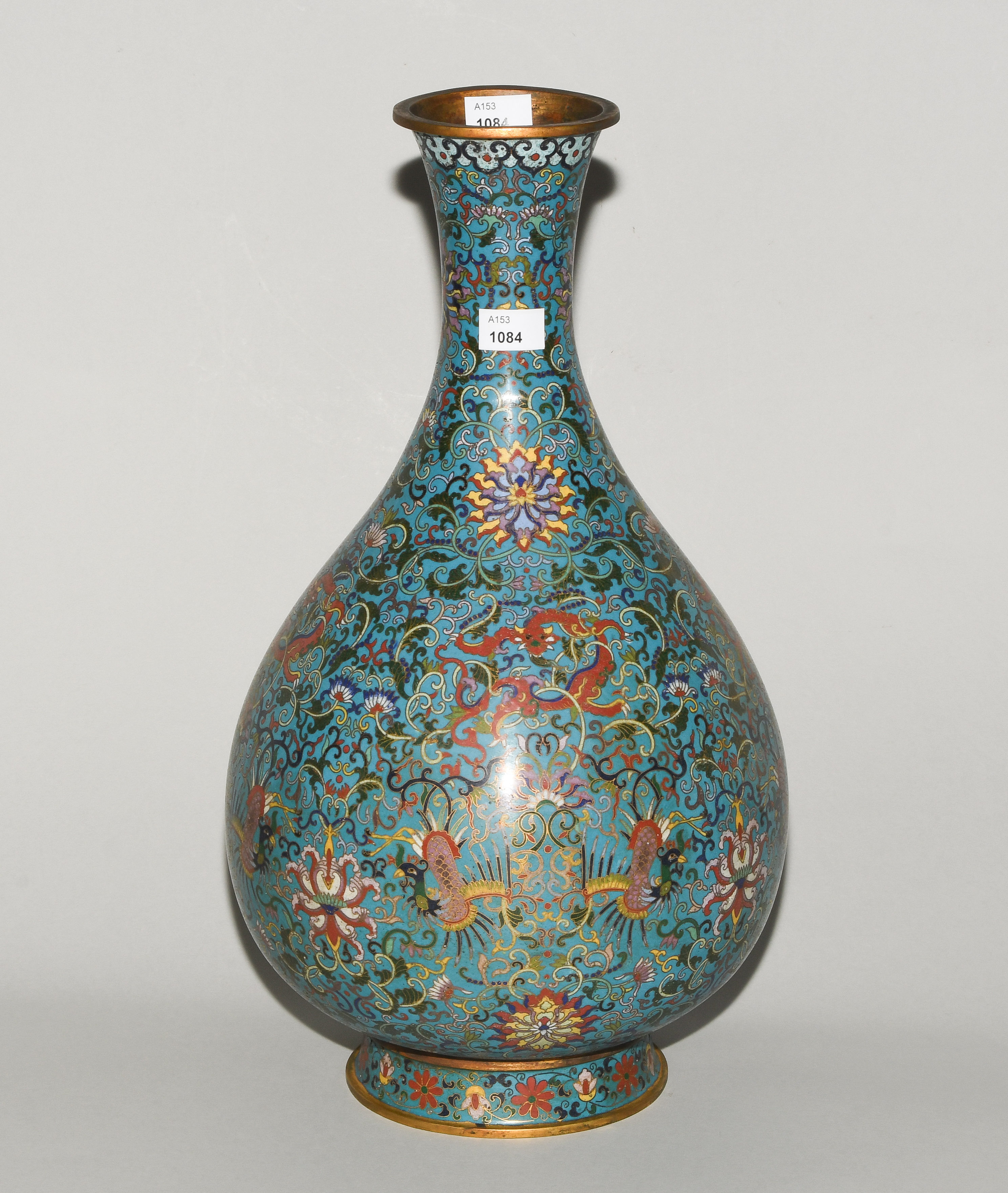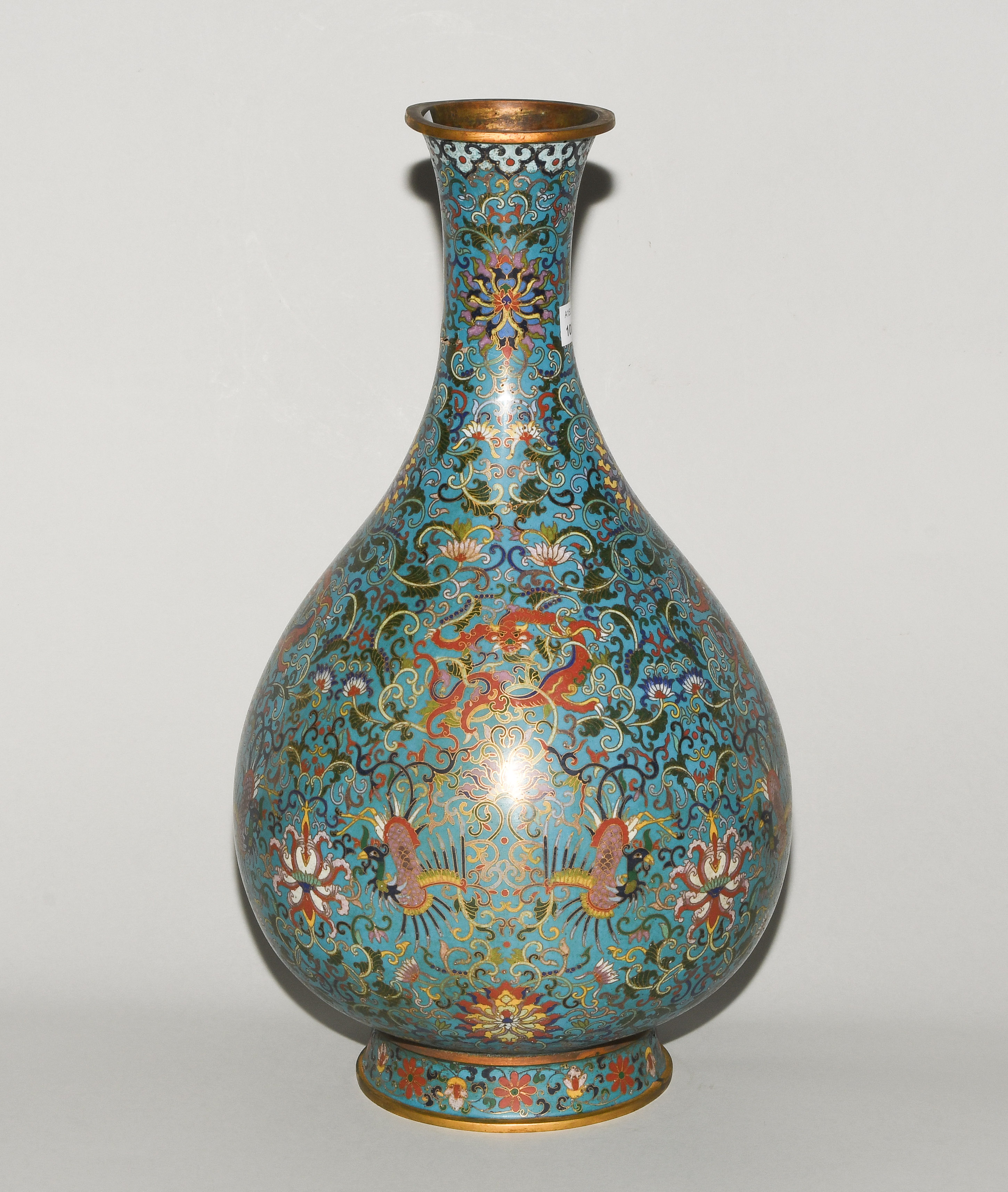China. Qianlong-Marke. Email Cloisonné. Polychromer Drachen- und Phönix-Dekor mit Lotosblumenranken auf türkisblauem Fond. H 38 cm. - Riss am Hals.