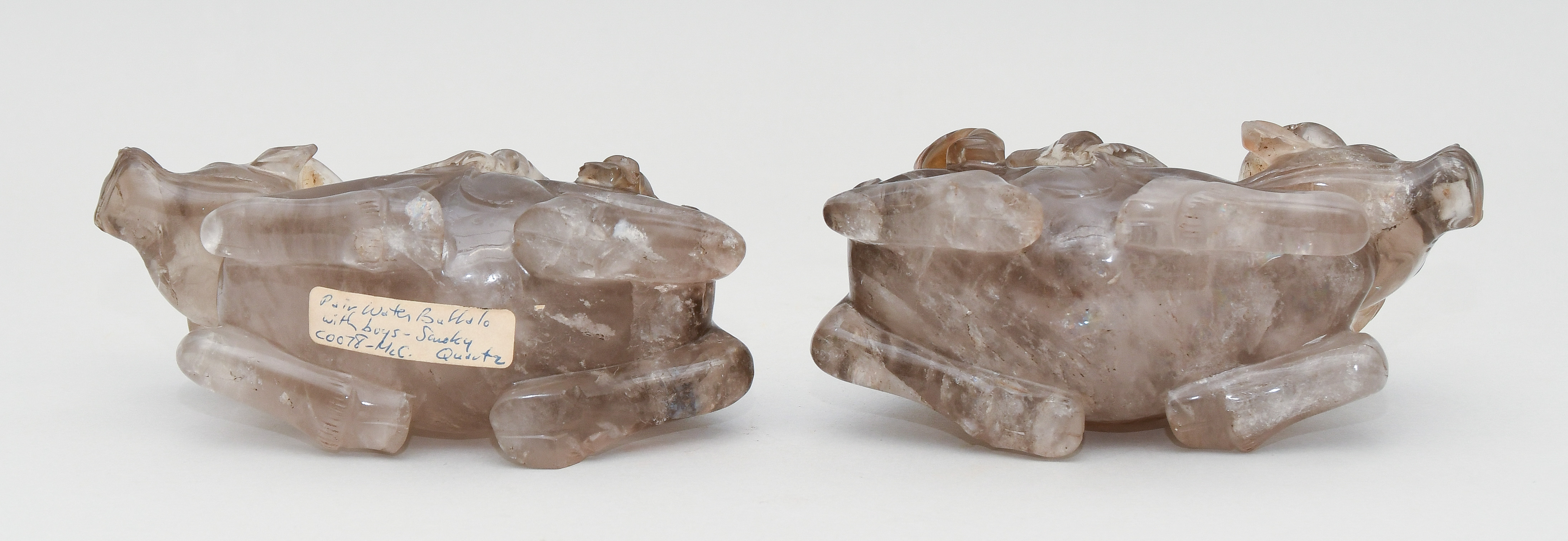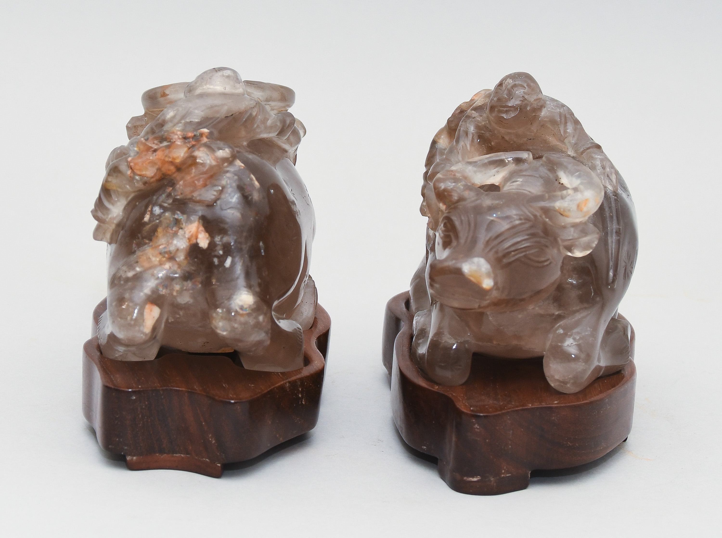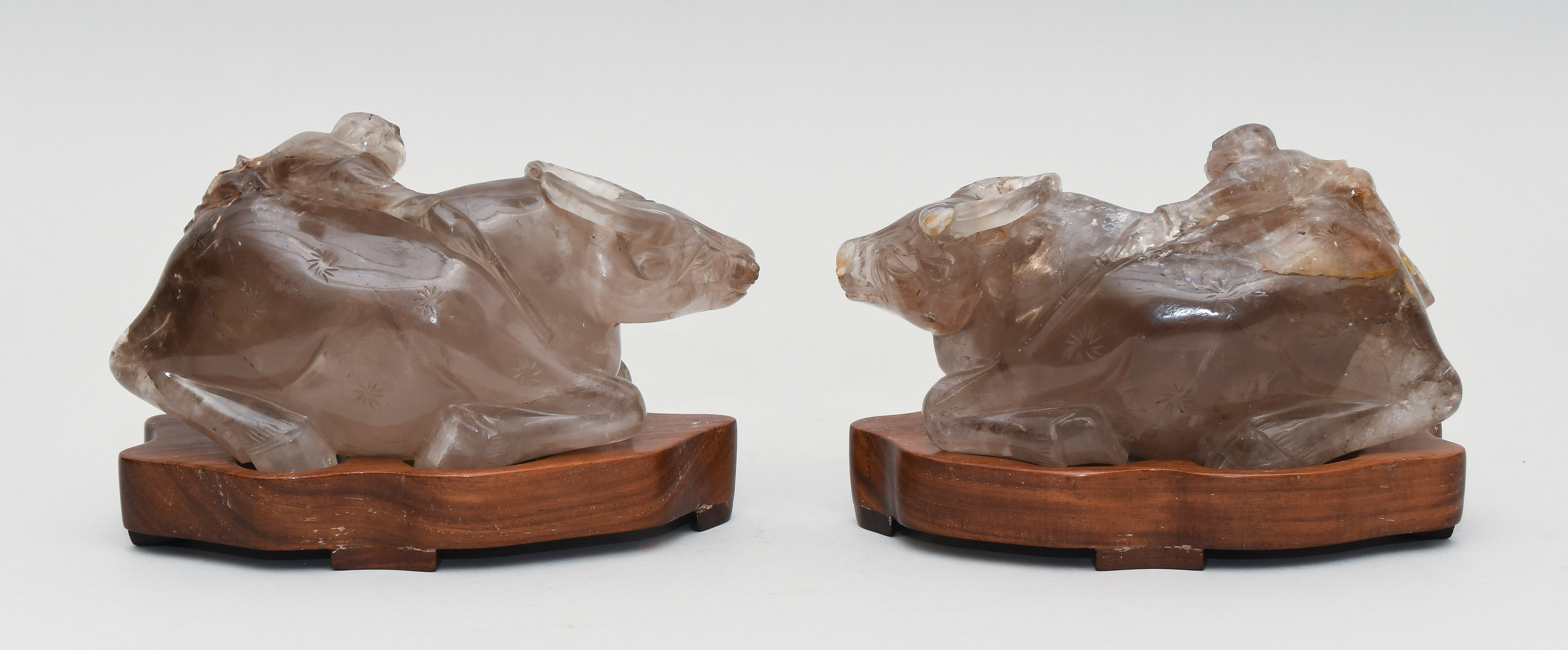 China, Mitte 20.Jh. Rauchquarz. Junge auf Ochse. Minim bestossen. Mit Holzsockel. L 15 cm.