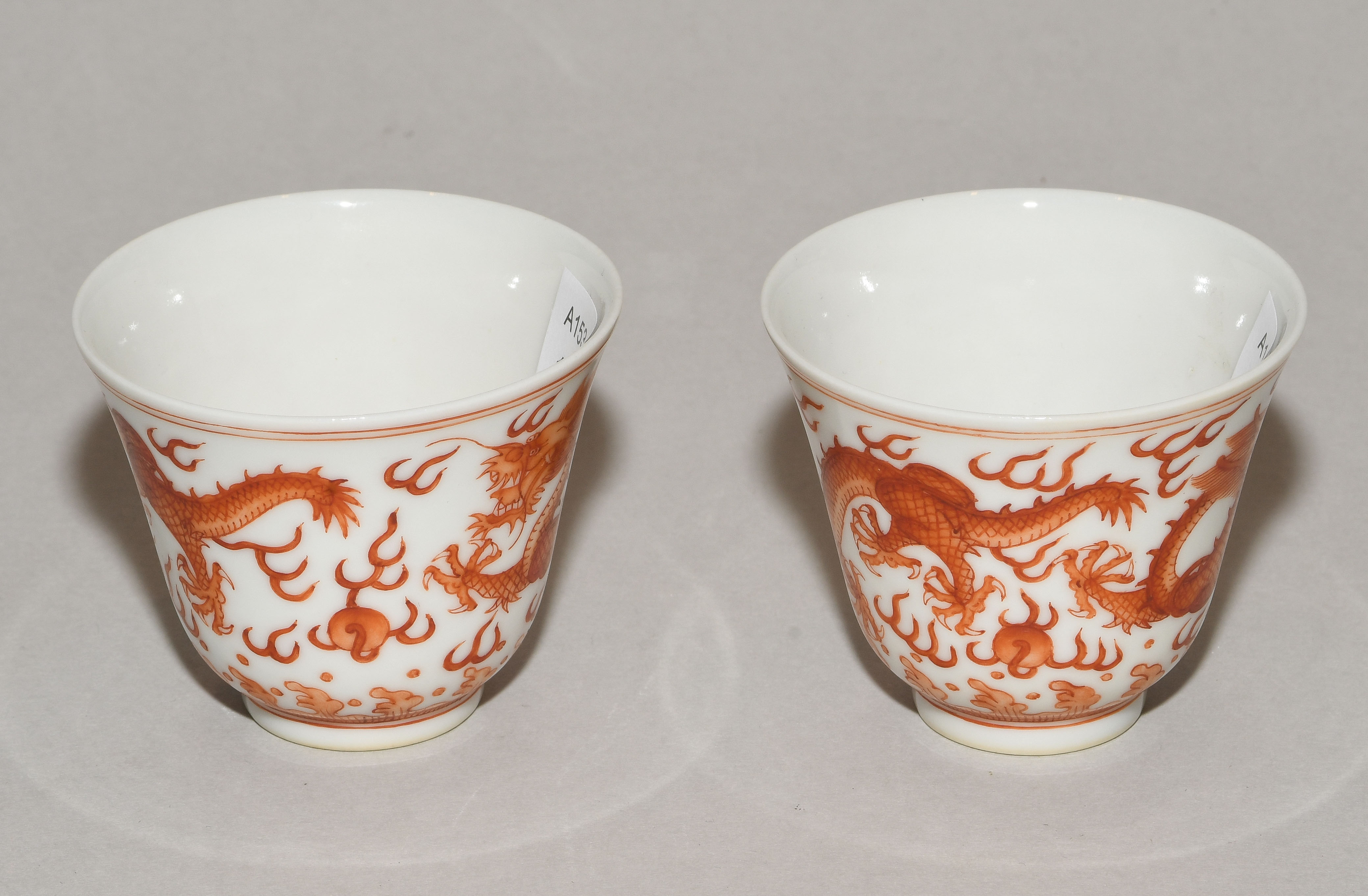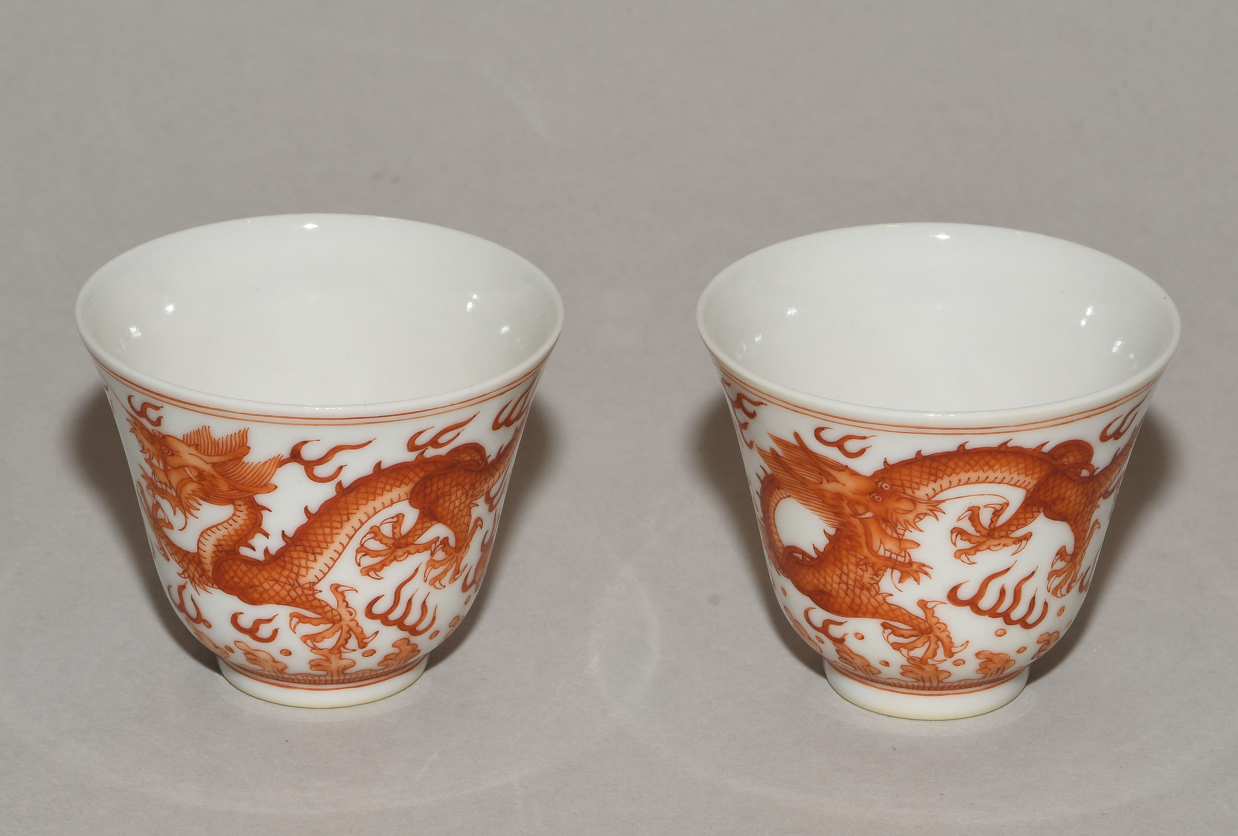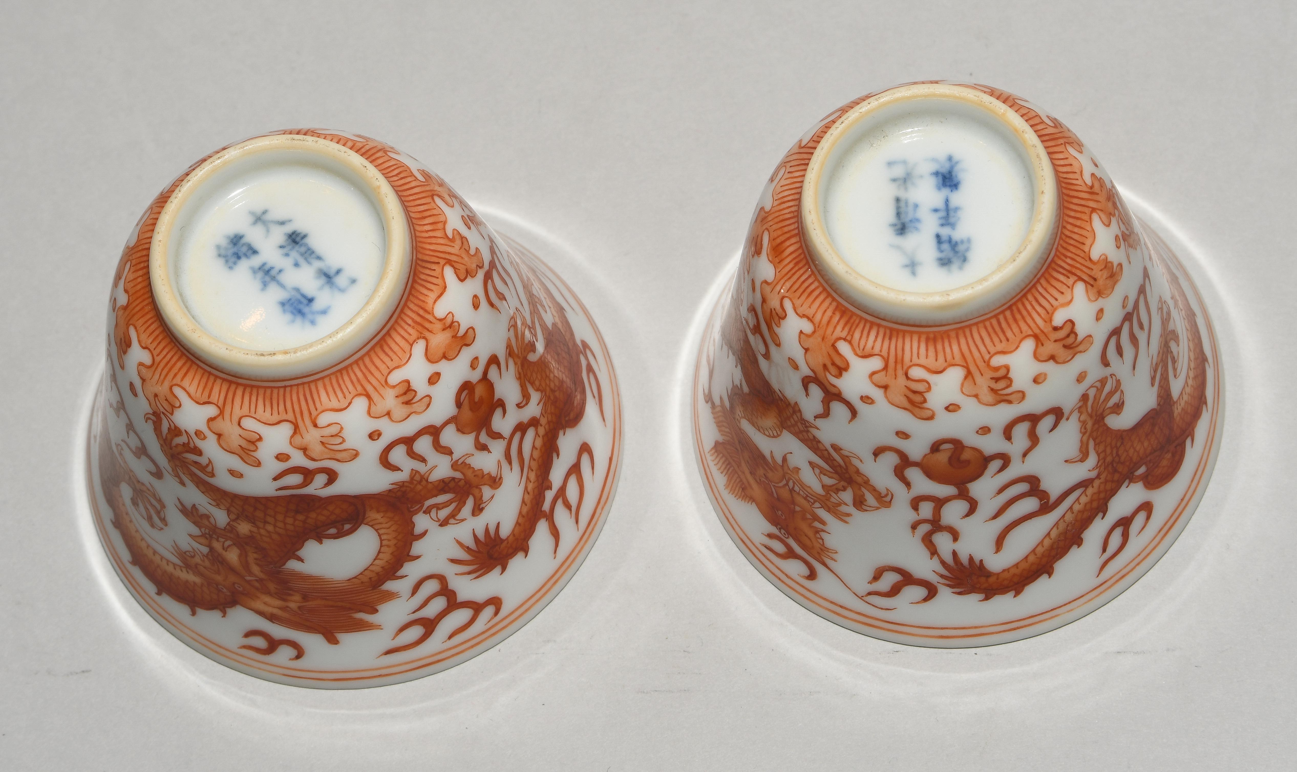 China. Unterglasurblaue Guangxu-Marke. Eisenroter Drachendekor. H 5, D 6 cm.