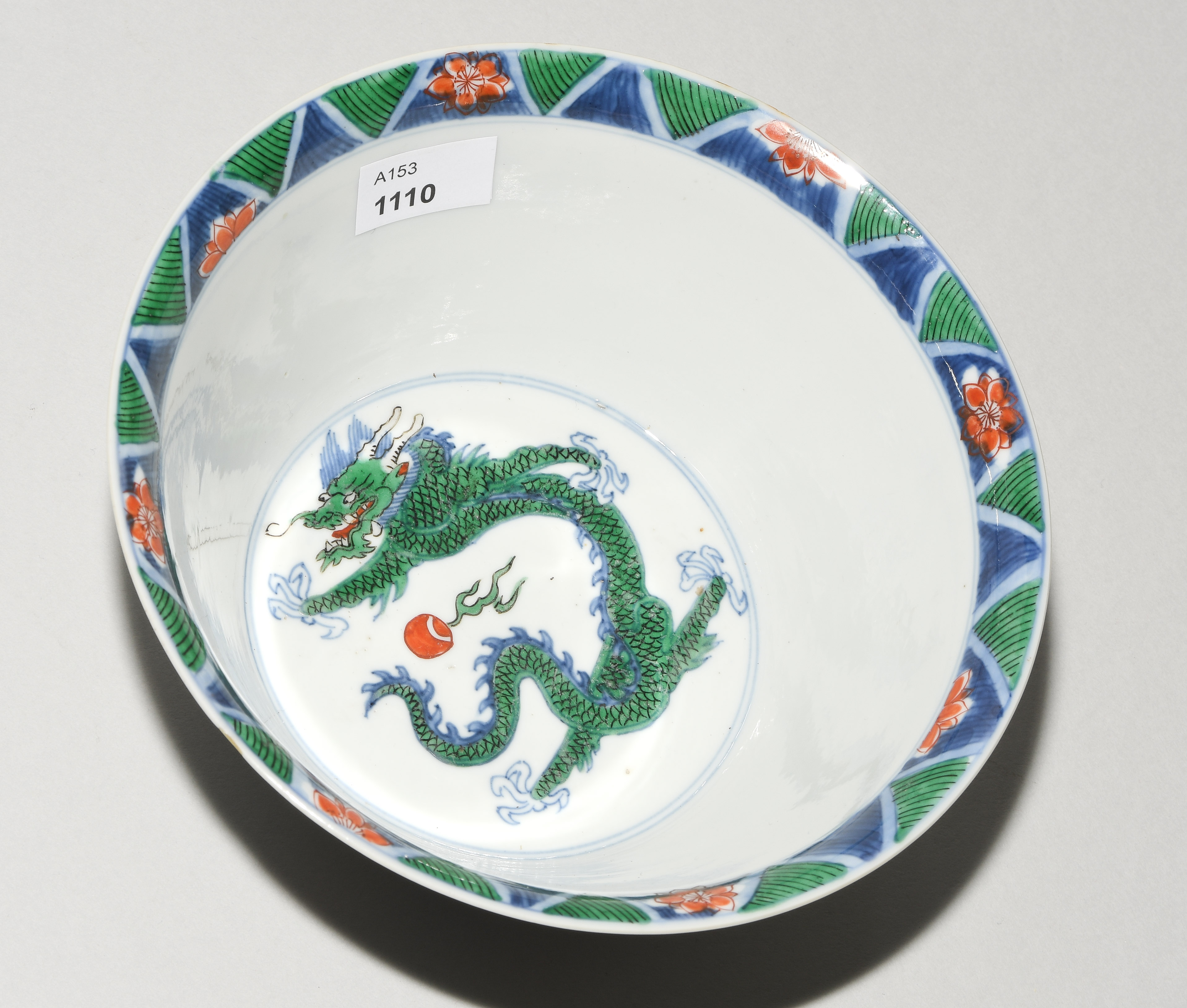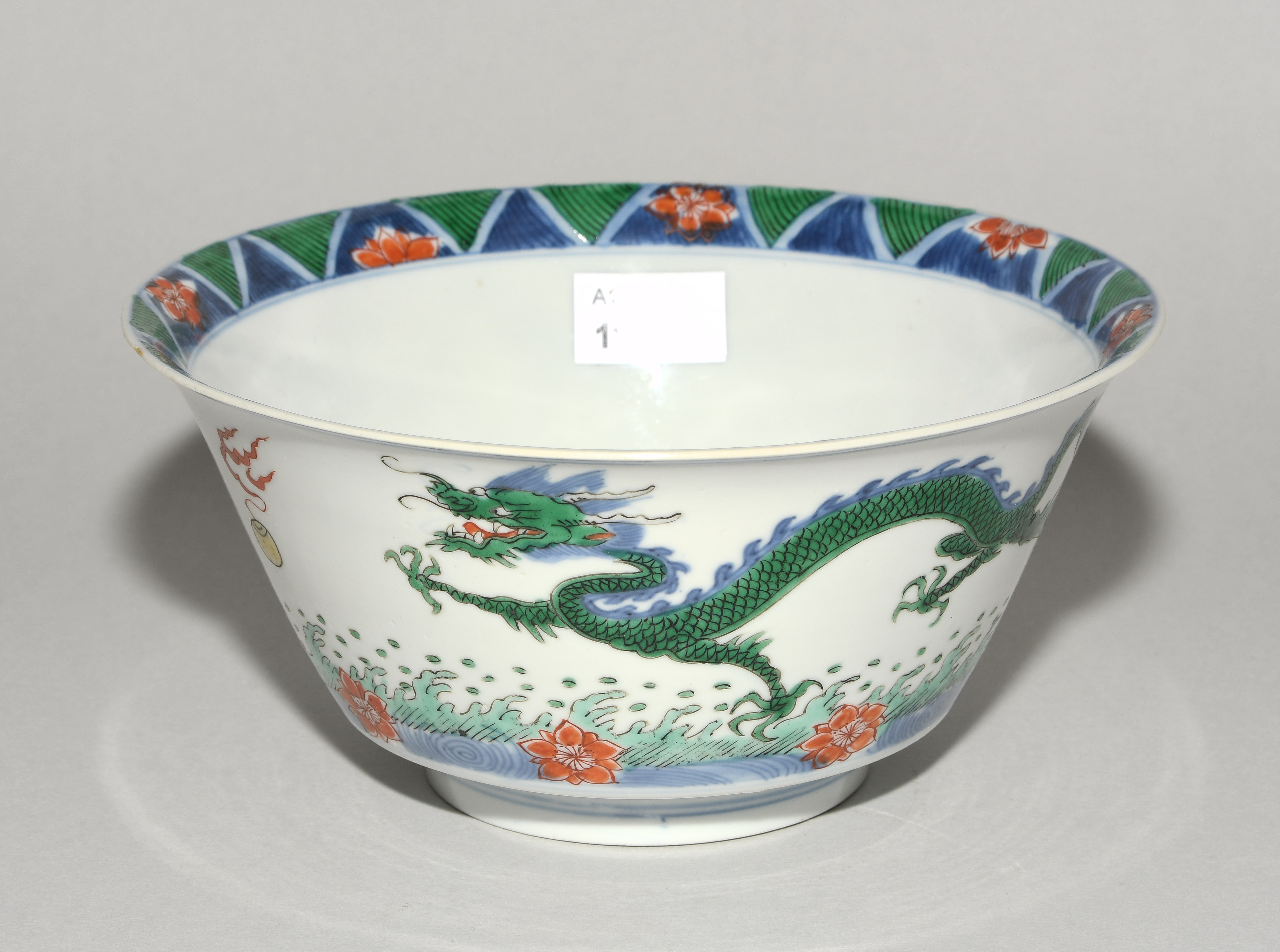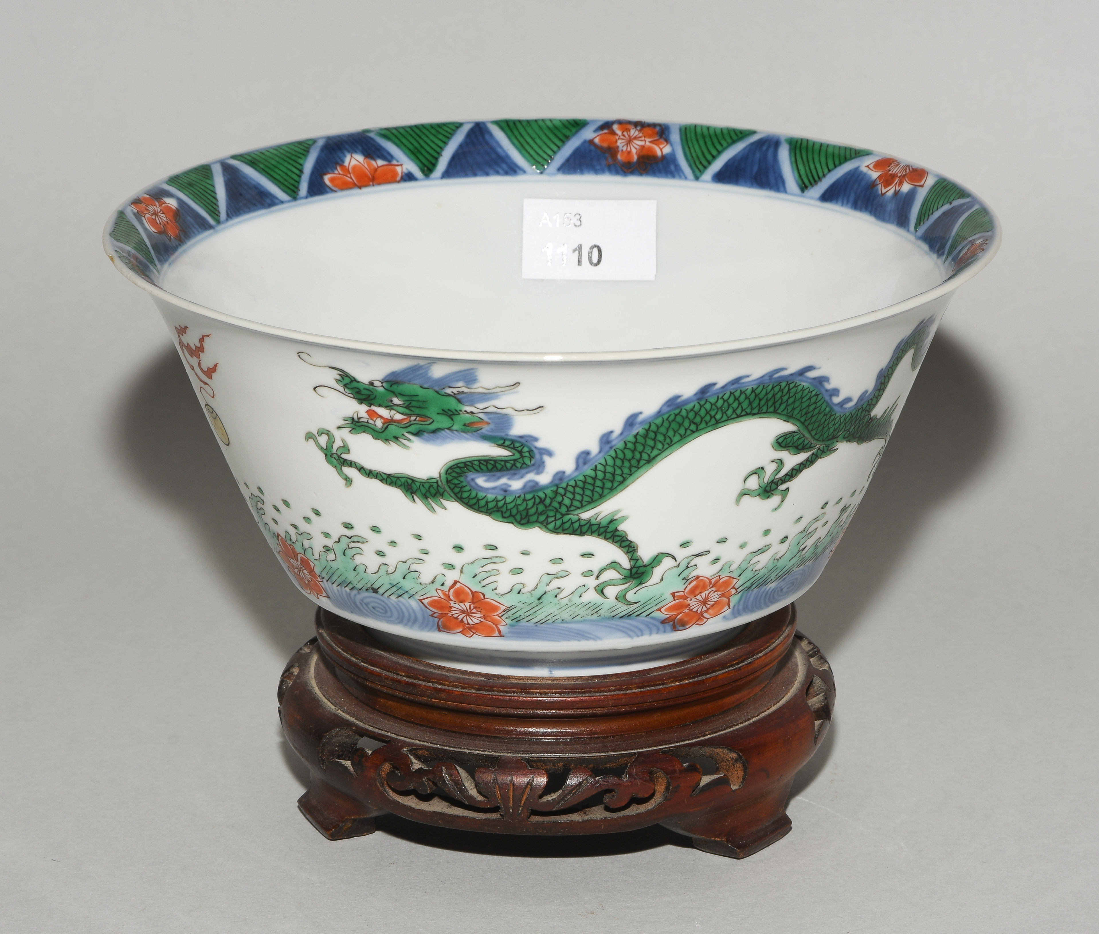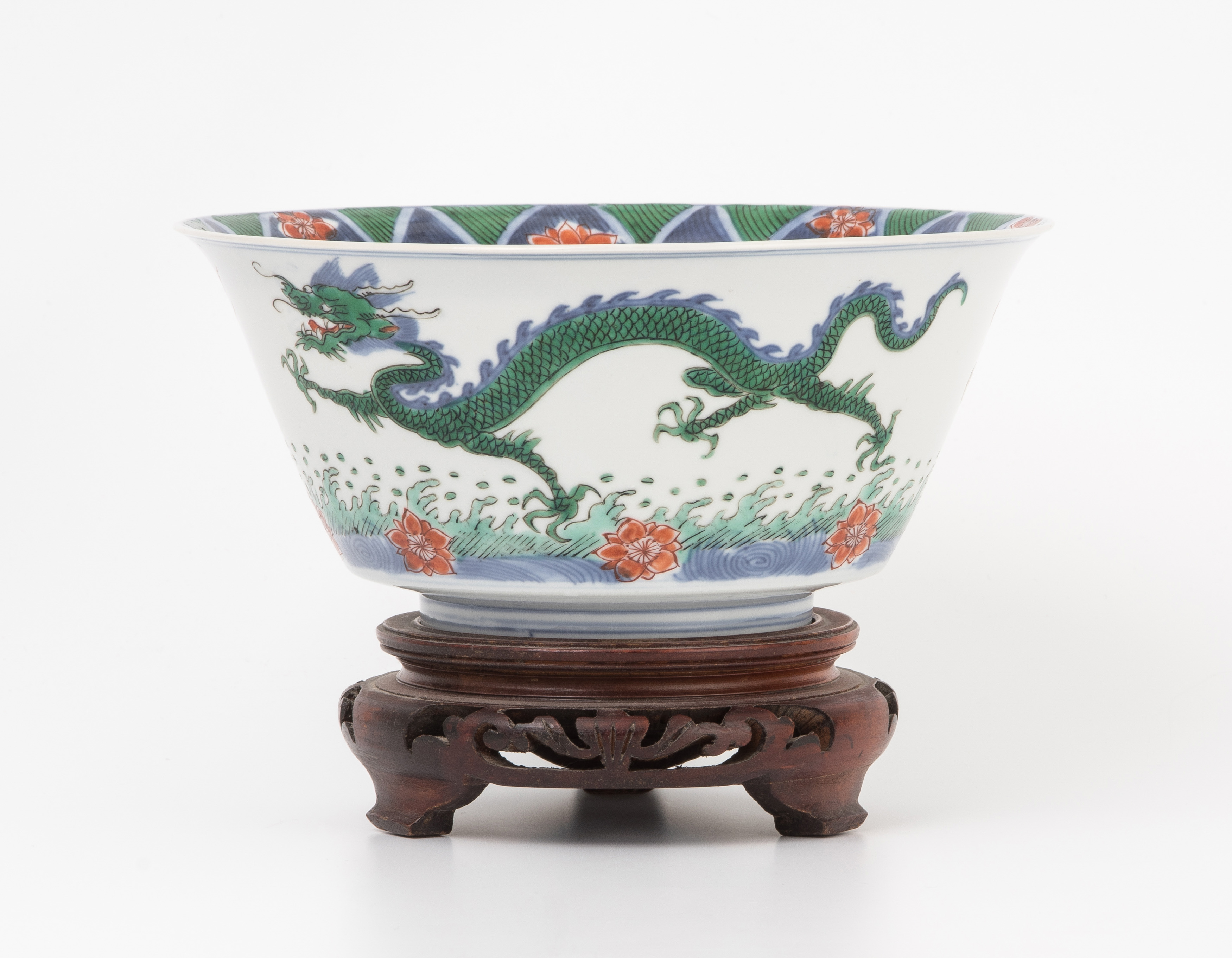 China. Kangxi-Marke. Porzellan. Wandung dekoriert mit zwei Drachen über Wellen und Lotosblüten in Unterglasurblau, Grün, Eisenrot und Gelb. Spiegel mit grünem Drachen. Der innere Rand mit geometrischer Bordüre und Lotosblüten. H 7,5, D 15,5 cm. Mit Holzstand. - Bestossen.
