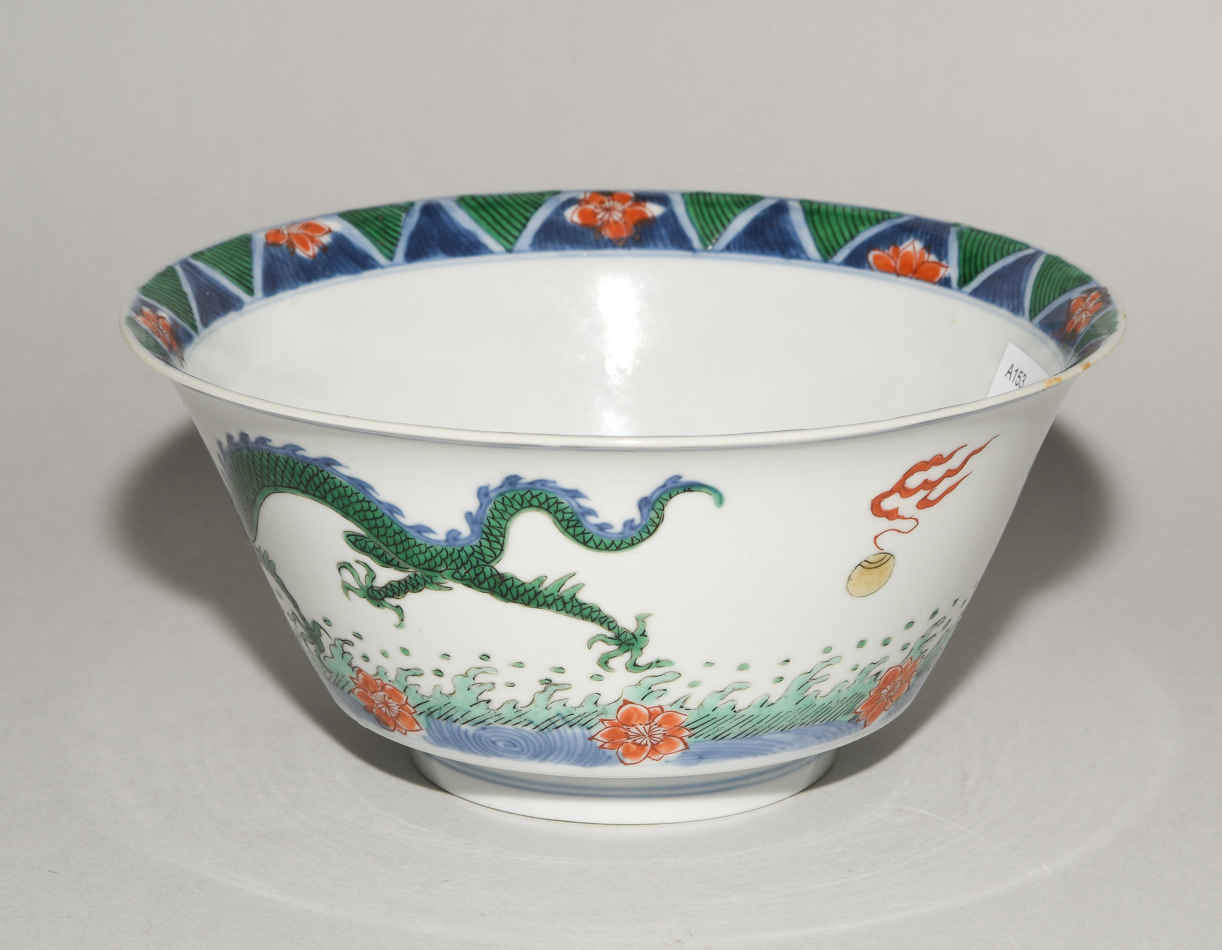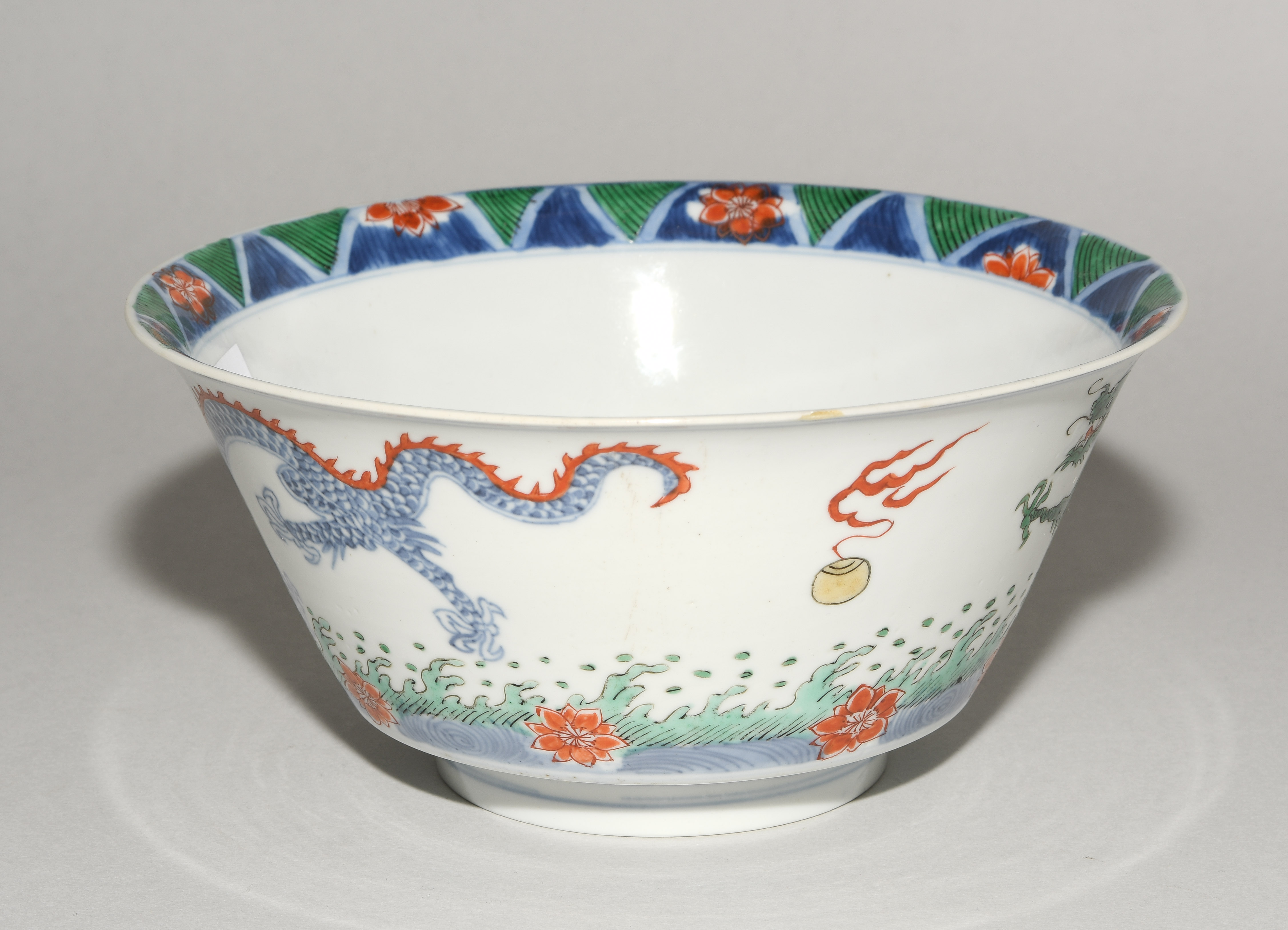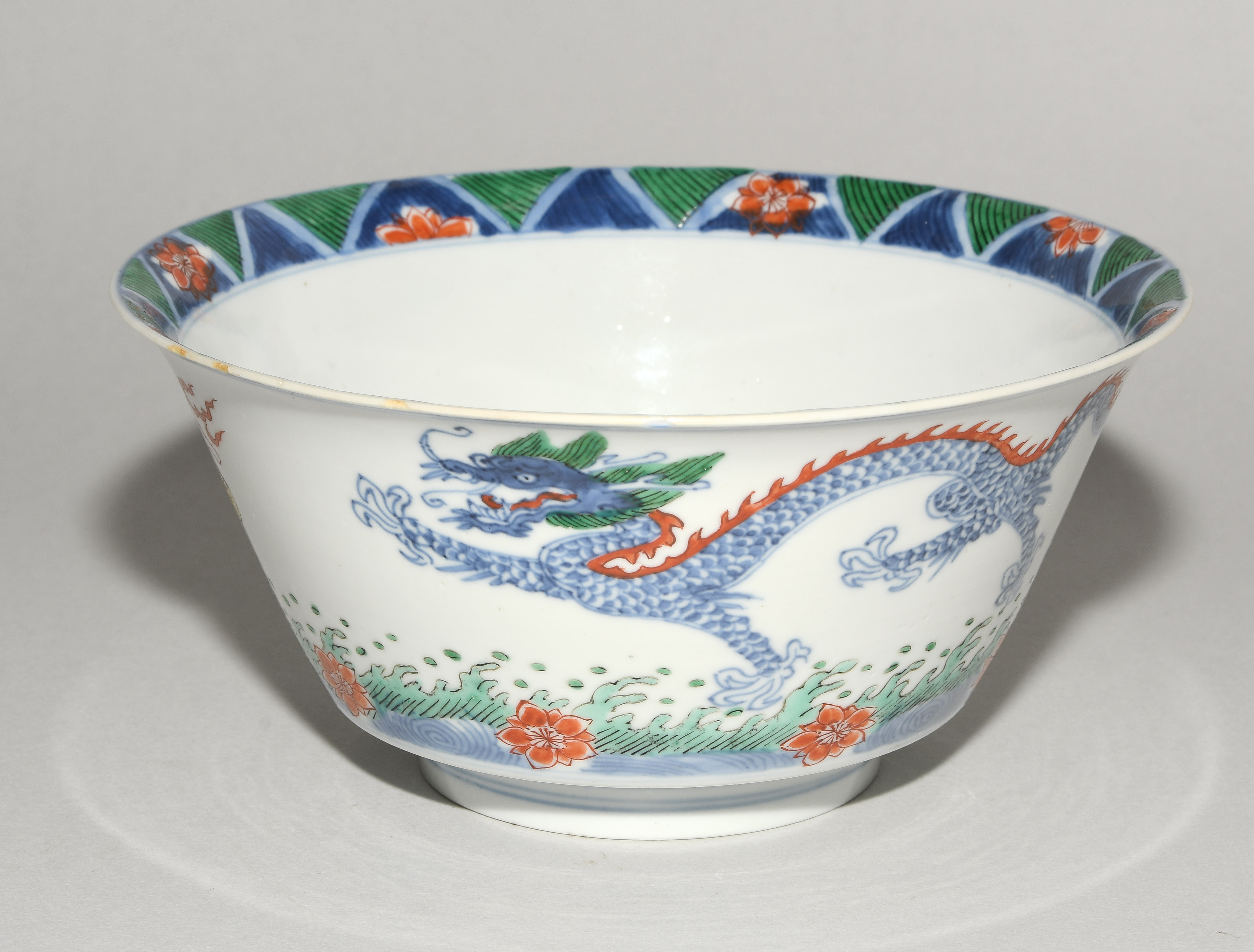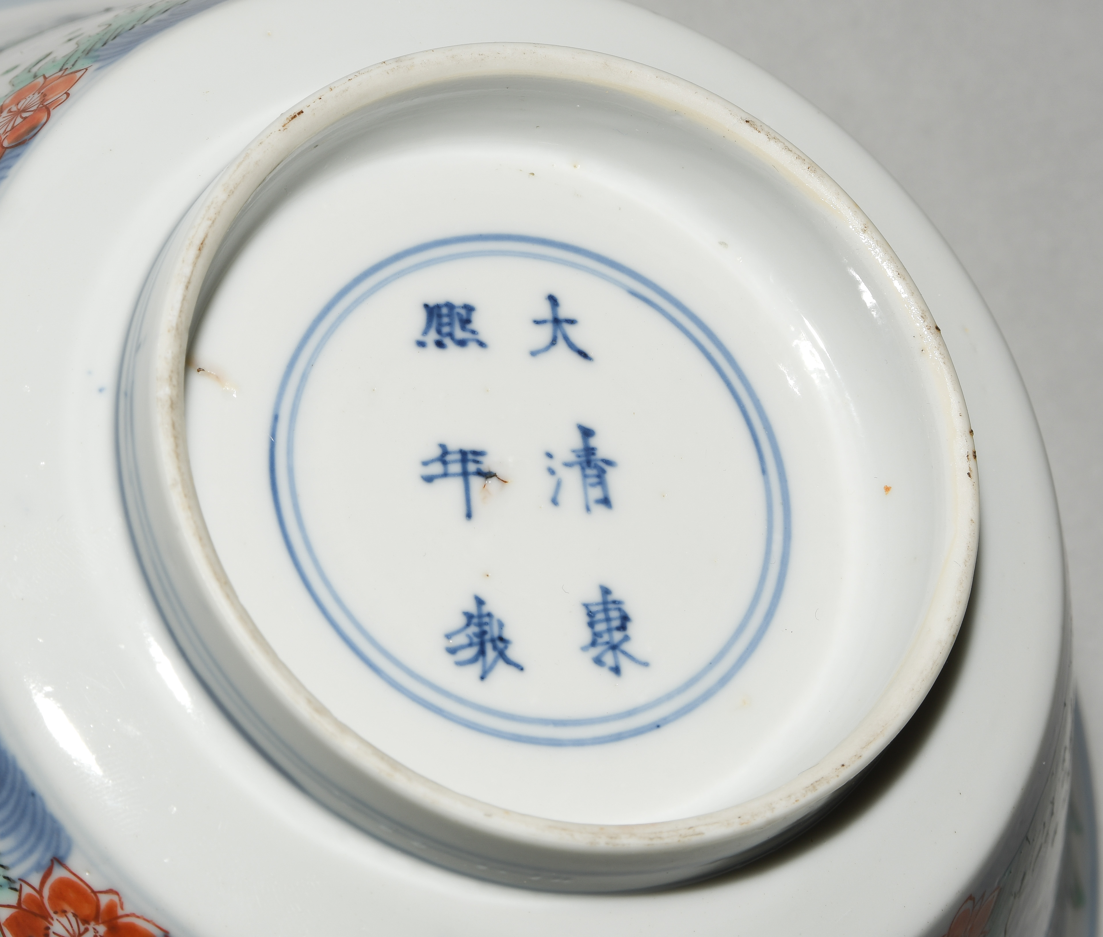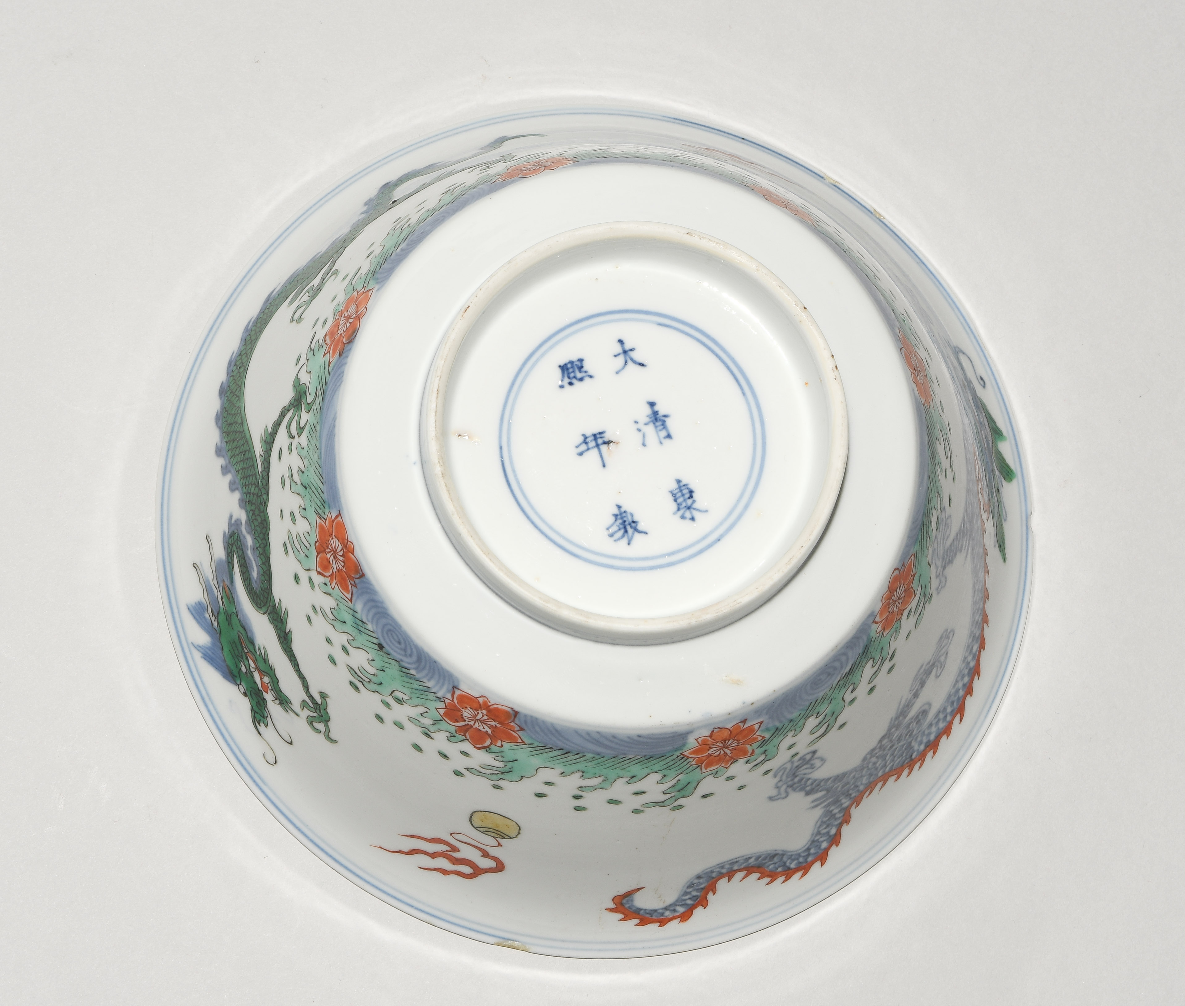 China. Kangxi-Marke. Porzellan. Wandung dekoriert mit zwei Drachen über Wellen und Lotosblüten in Unterglasurblau, Grün, Eisenrot und Gelb. Spiegel mit grünem Drachen. Der innere Rand mit geometrischer Bordüre und Lotosblüten. H 7,5, D 15,5 cm. Mit Holzstand. - Bestossen.
