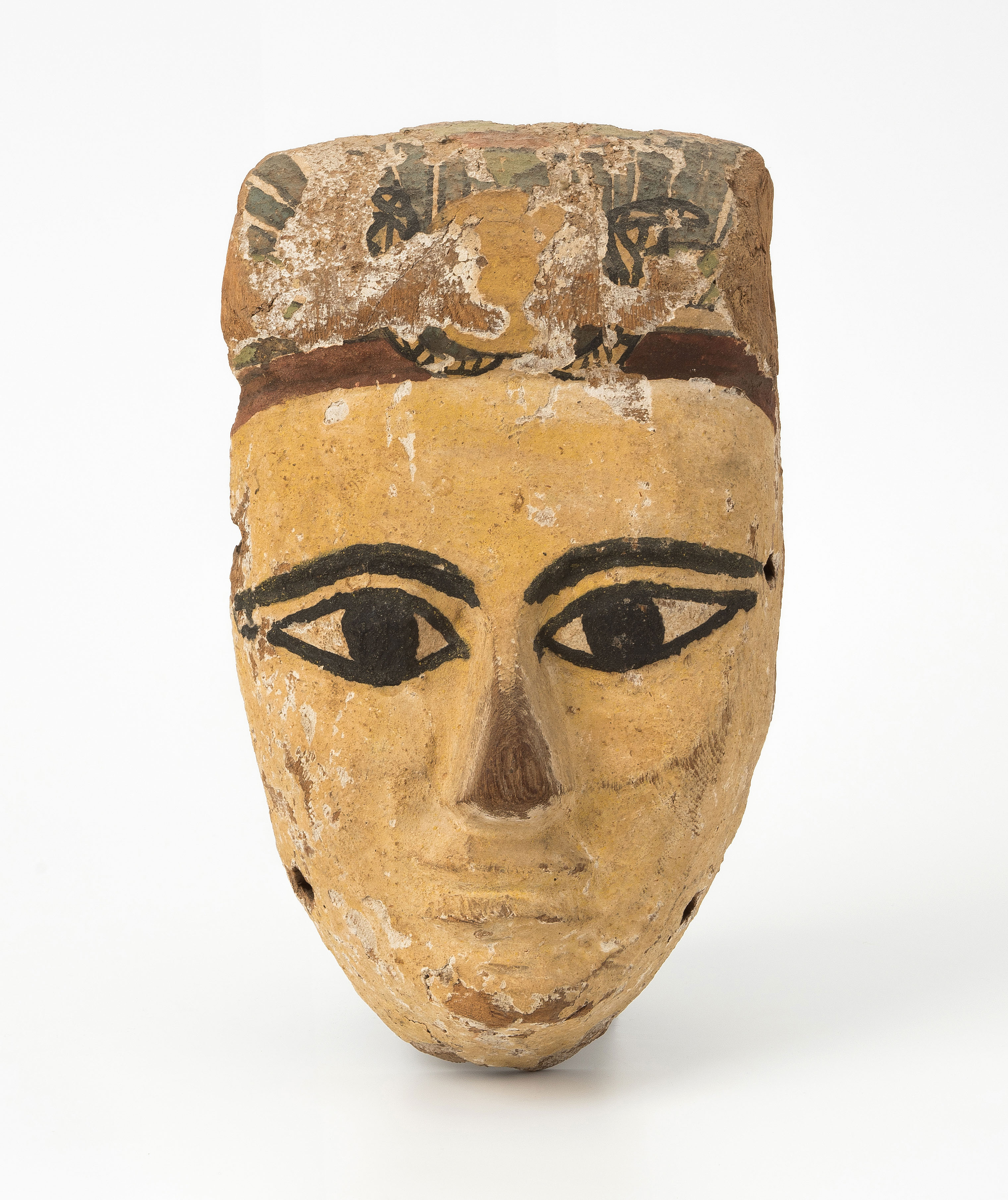 Aegypten, Spätzeit, ca. 750–332 v.C. Holz mit Stucküberzug und Bemalung. Gesicht gelb bemalt mit stark akzentuierten, schwarz umrandeten Mandelaugen, darüber polychrome Perücke. L 26 cm.