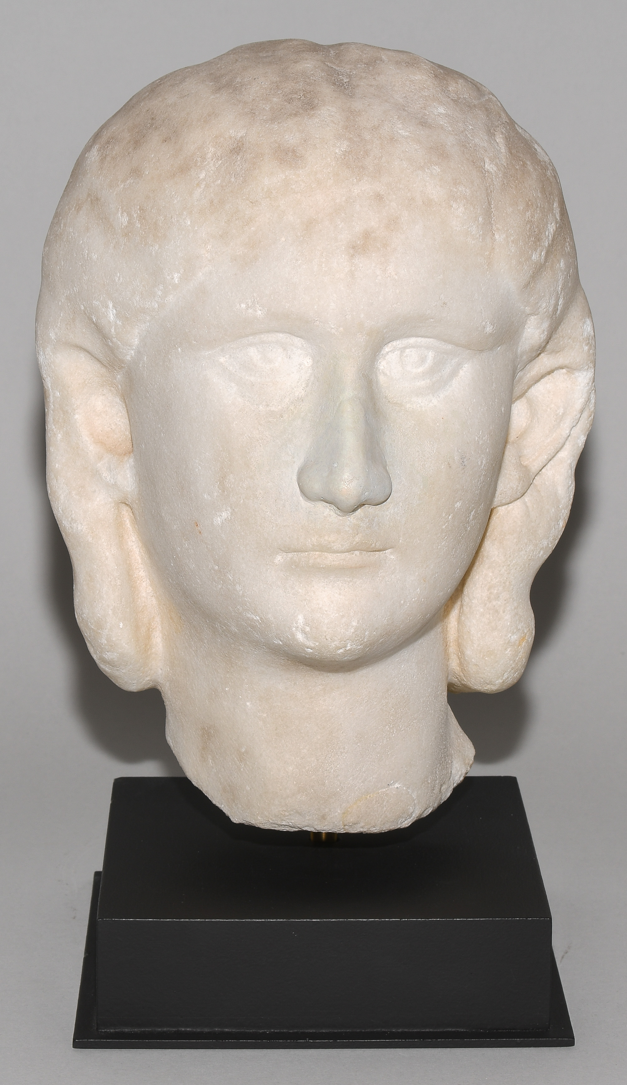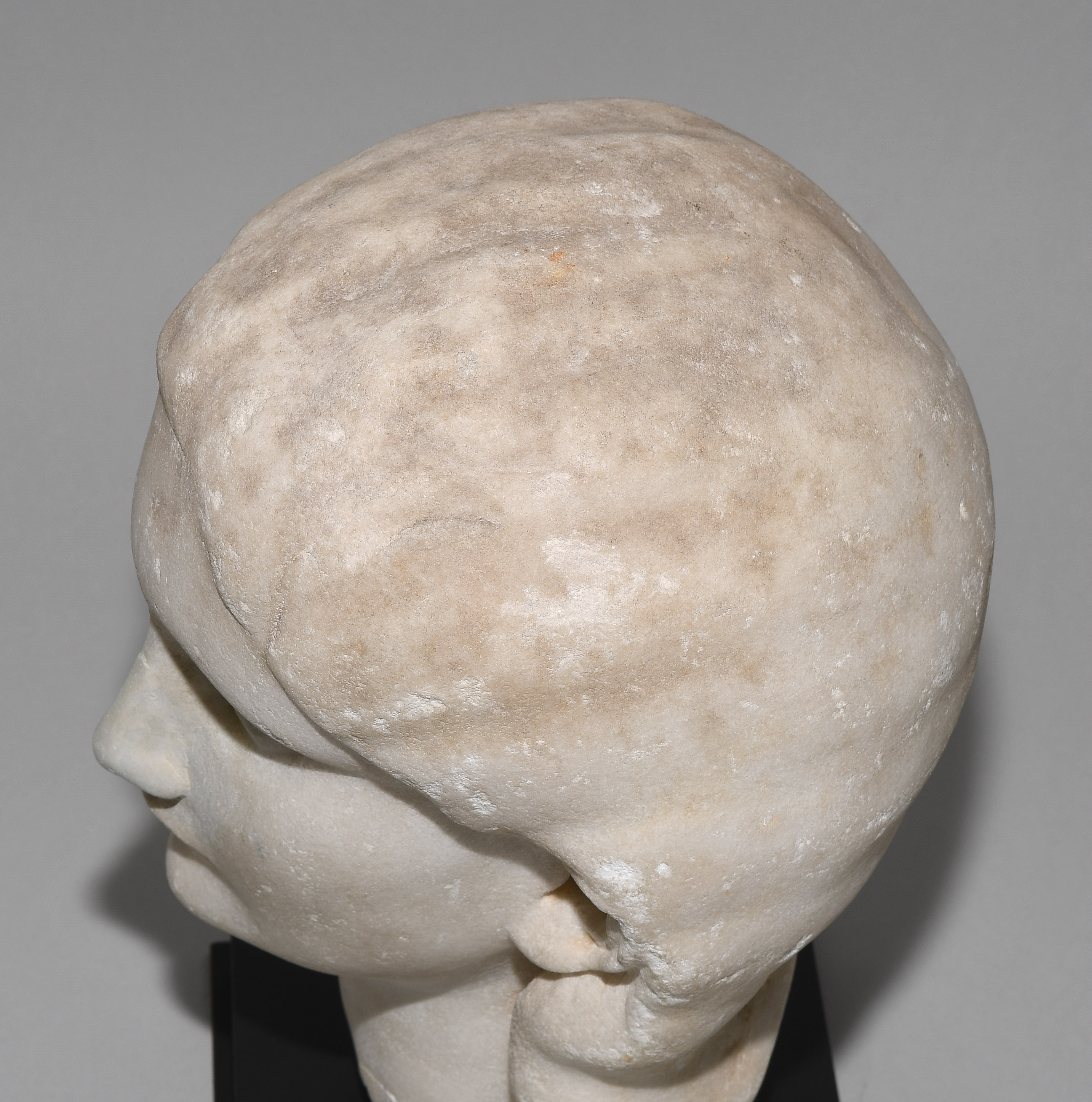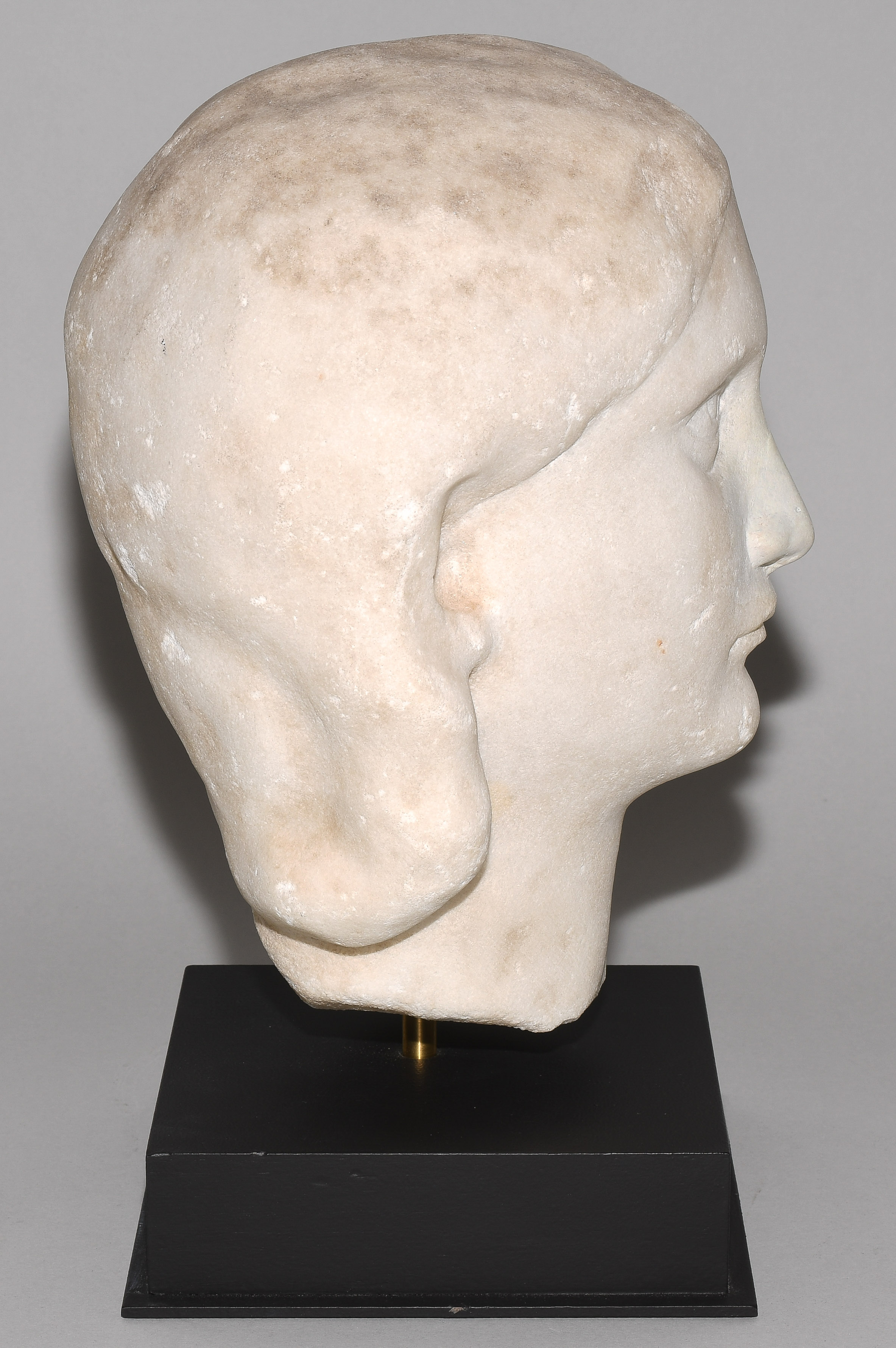 Spätseverische Zeit, 3.Jh. n.C. Marmor. Unvollendeter Portraitkopf der römischen Kaiserin Orbiana, ihr Blick leicht nach oben gerichtet, ihr schmaler Mund geschlossen, ihr Haar mittig gescheitelt und hinter den Ohren tragend. H 27,5 cm. - Auf Sockel montiert.