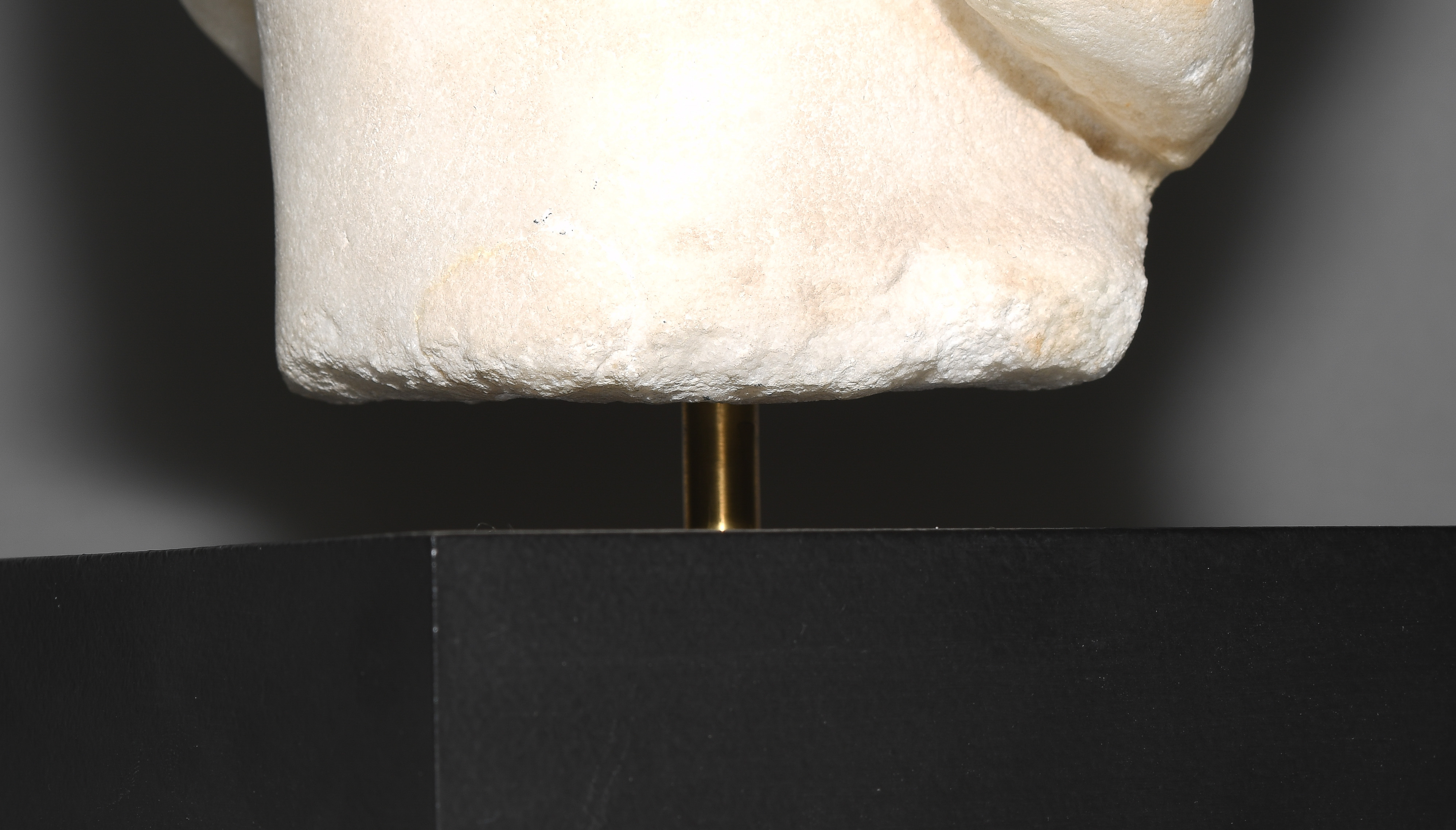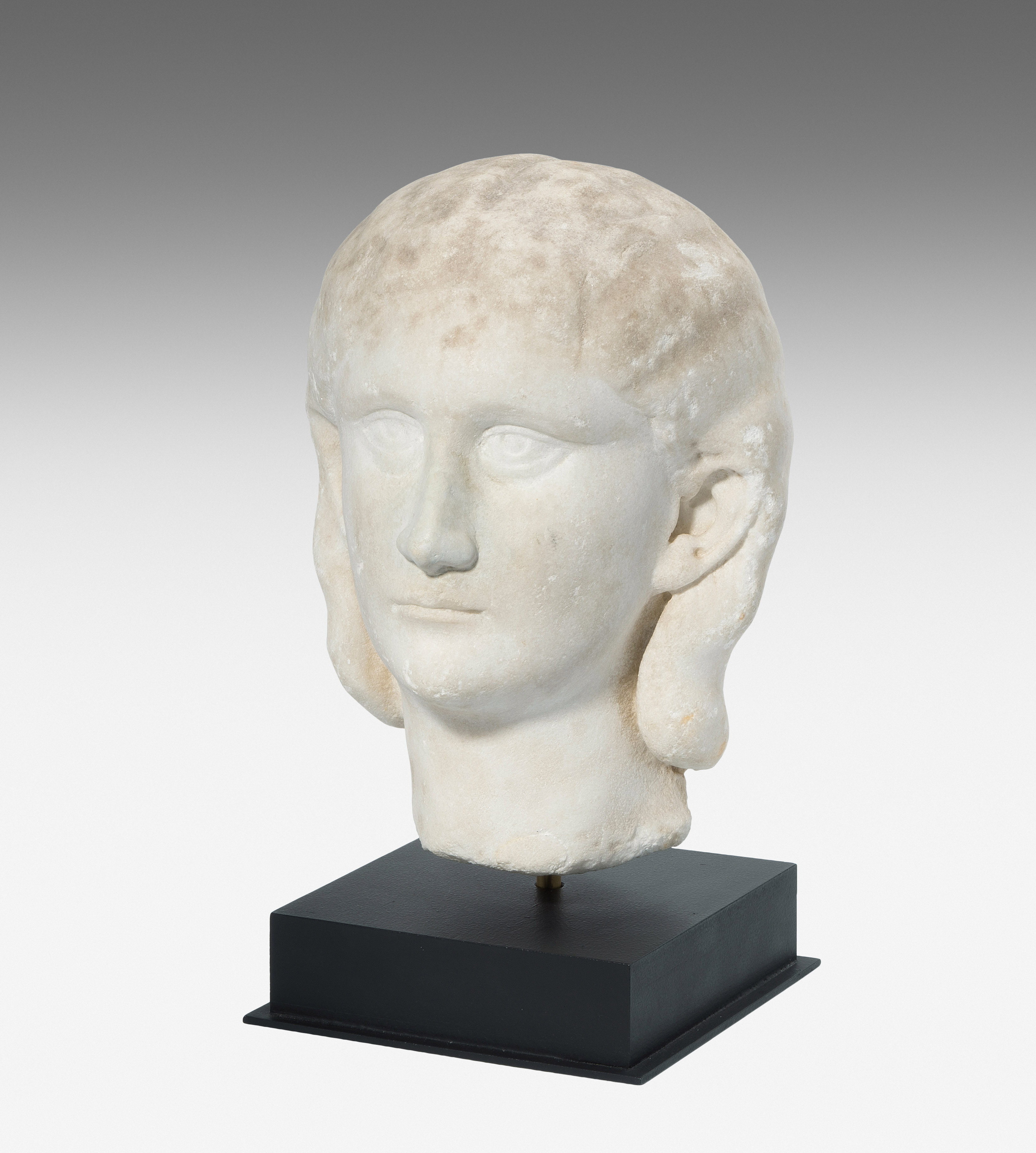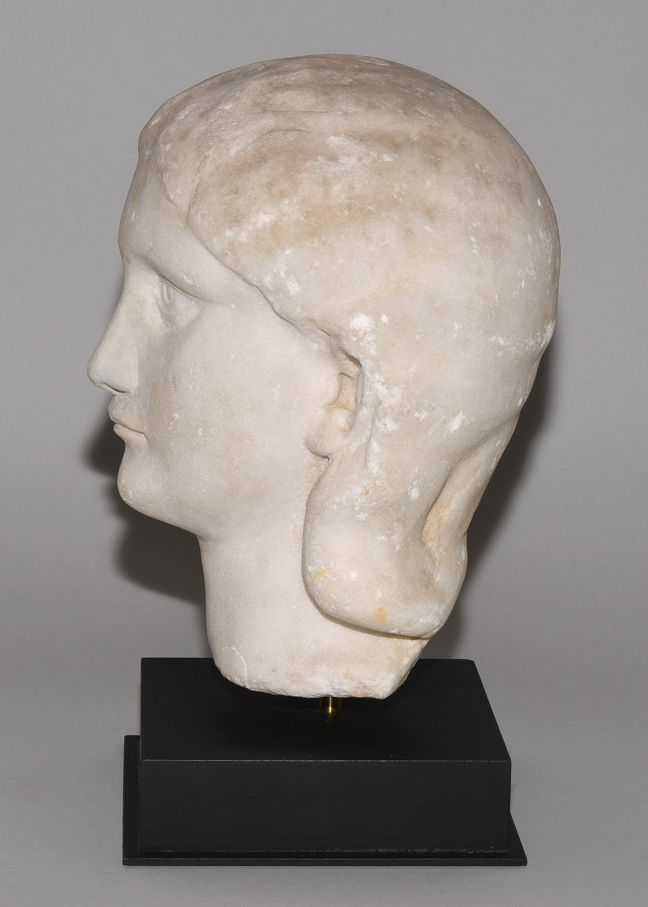 Spätseverische Zeit, 3.Jh. n.C. Marmor. Unvollendeter Portraitkopf der römischen Kaiserin Orbiana, ihr Blick leicht nach oben gerichtet, ihr schmaler Mund geschlossen, ihr Haar mittig gescheitelt und hinter den Ohren tragend. H 27,5 cm. - Auf Sockel montiert.