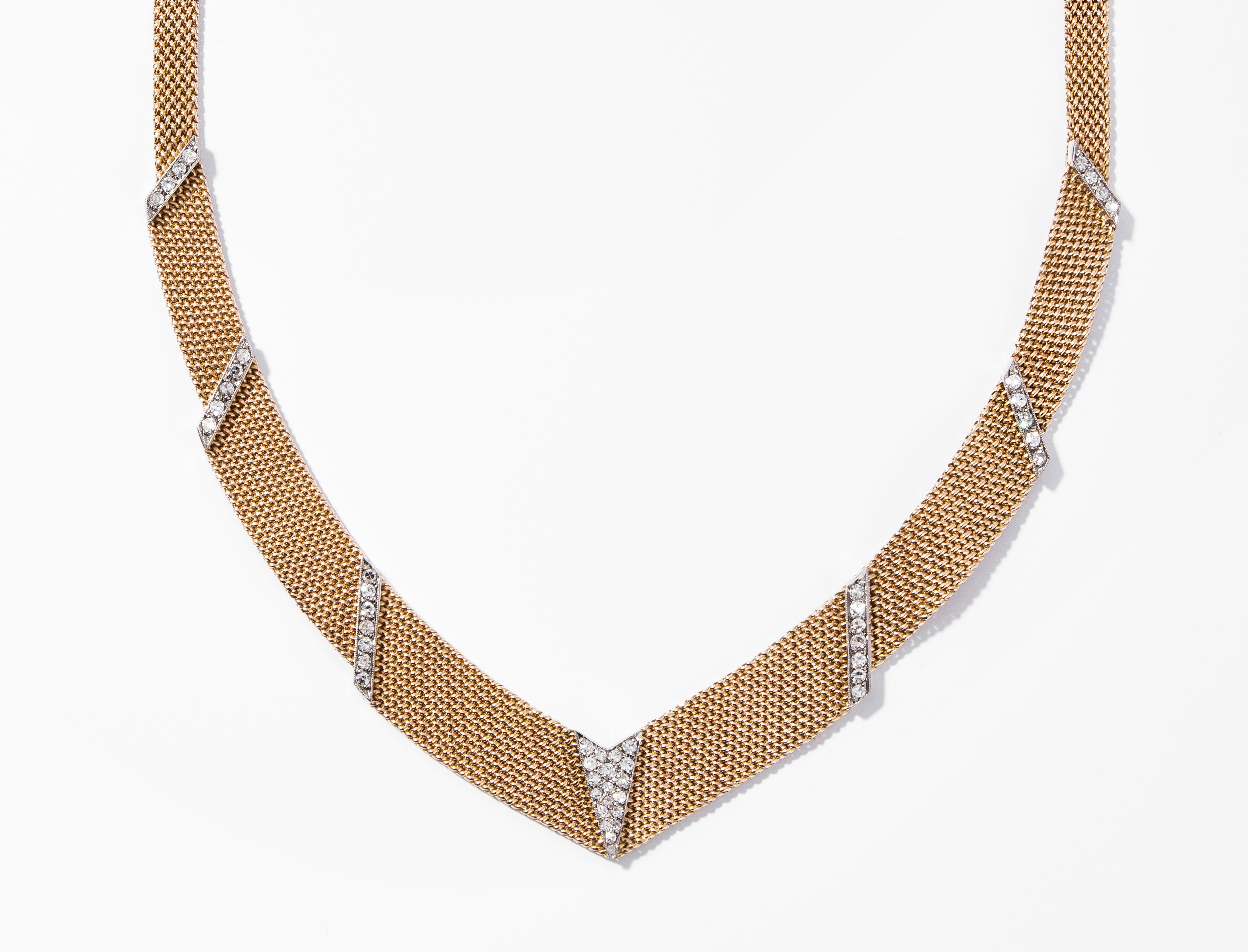 Frankreich, 1950er Jahre. 750 Gelbgold/Platin. Maschenmuster spitz zulaufend. 51 Achtkant-Diamanten ca. 0.70 ct. L ca. 44 cm, 49,7 g.