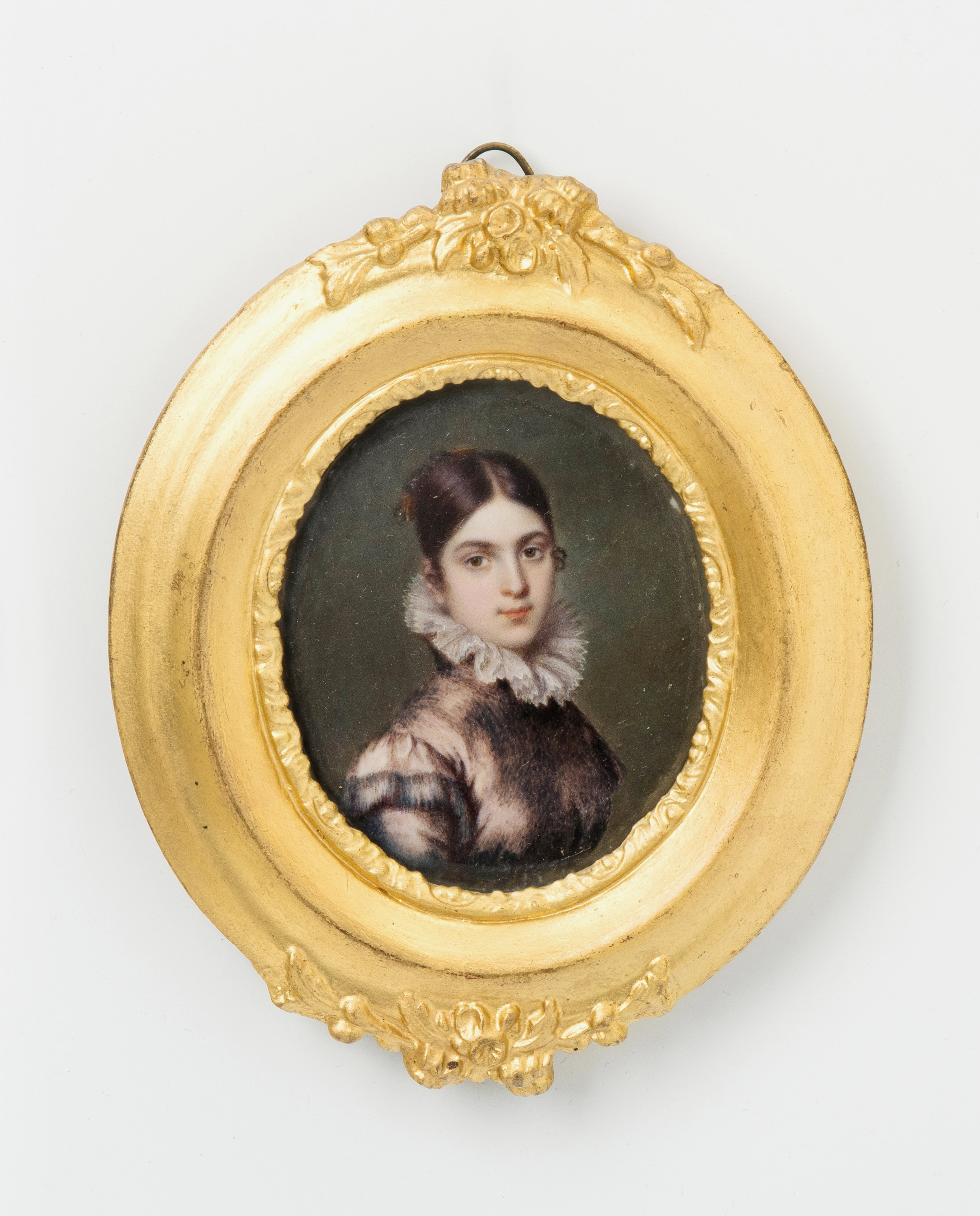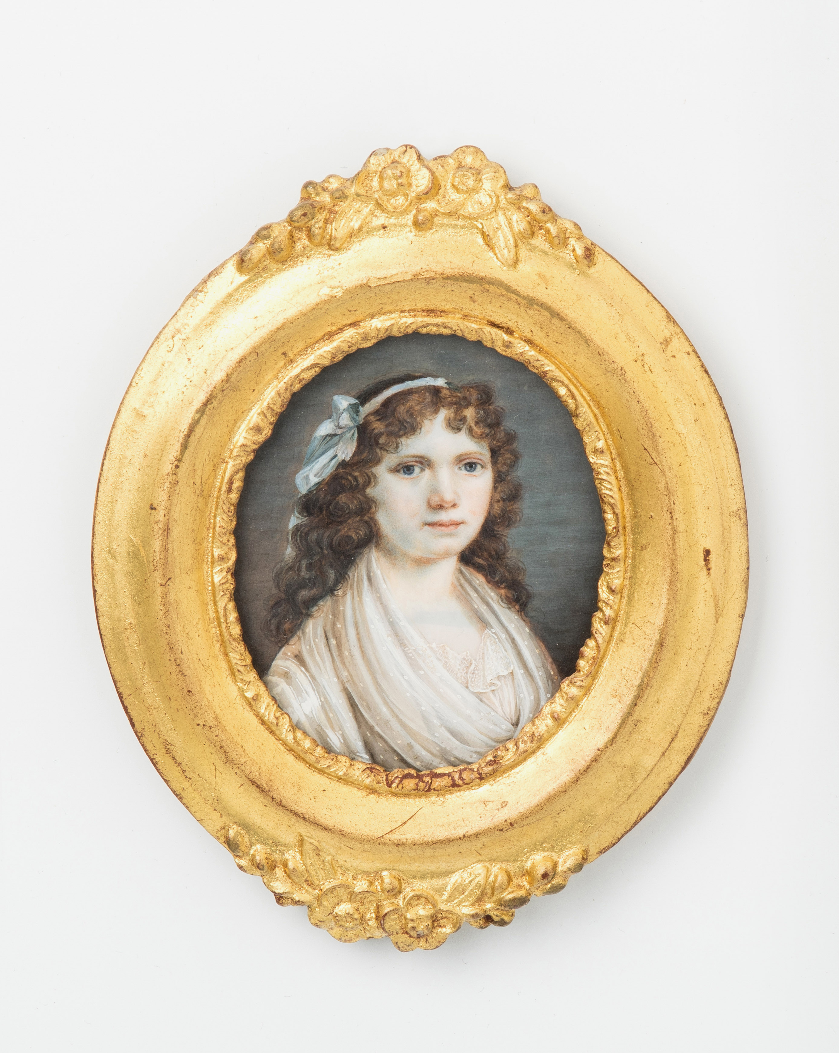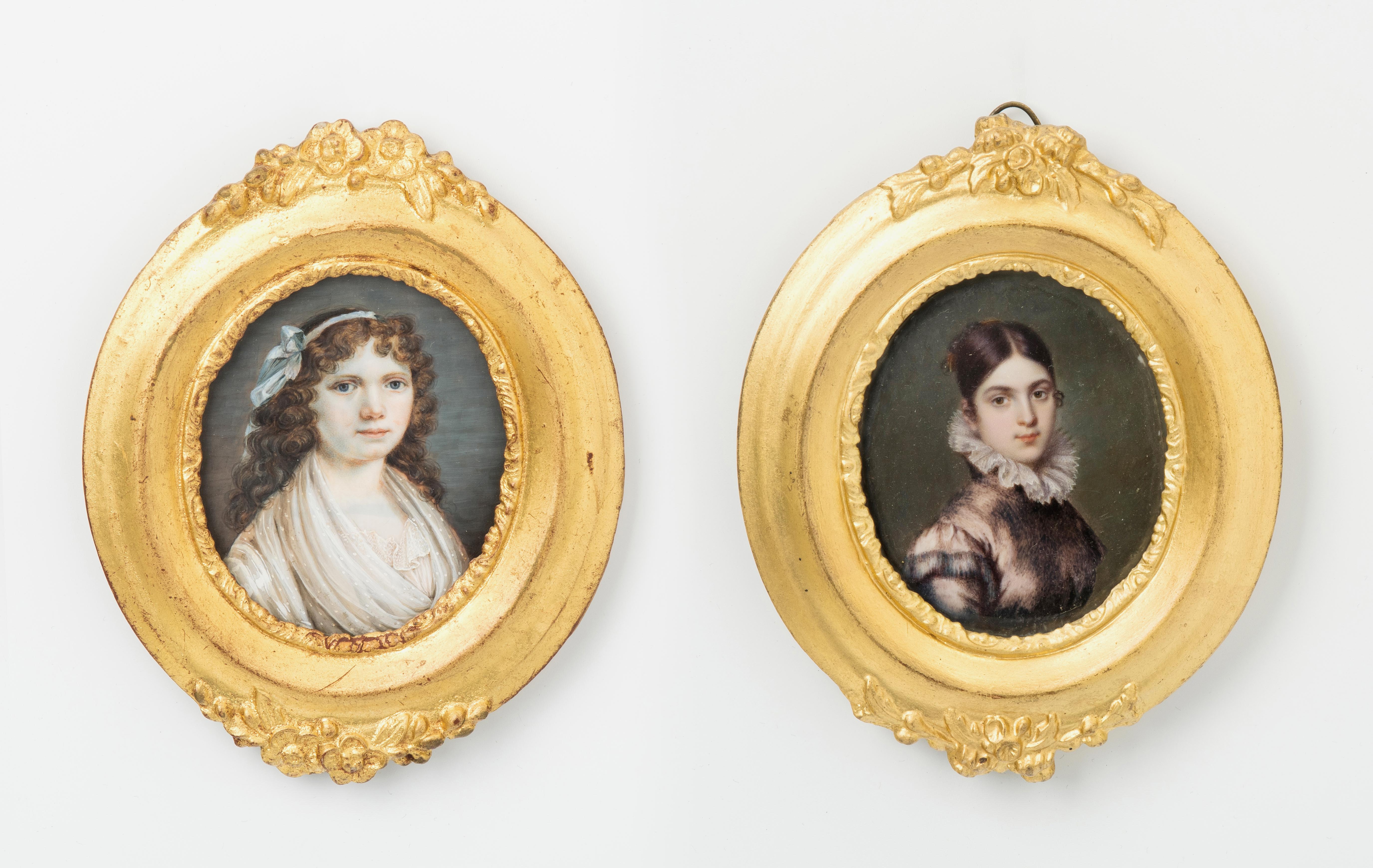 Schweiz, Anfang 19.Jh. Gouachemalerei auf Elfenbein, oval. Elisabeth Pfenninger (Zürich 1792–1847 Paris) zugeschrieben. Darstellungen junger Damem, die eine mit langer Lockenfrisur und Masche im Haar, in weissem Kleid. Die andere in altrosafarbener Robe mit weissem Rüschenkragen. Gerahmt. 5,8x7,2 cm.