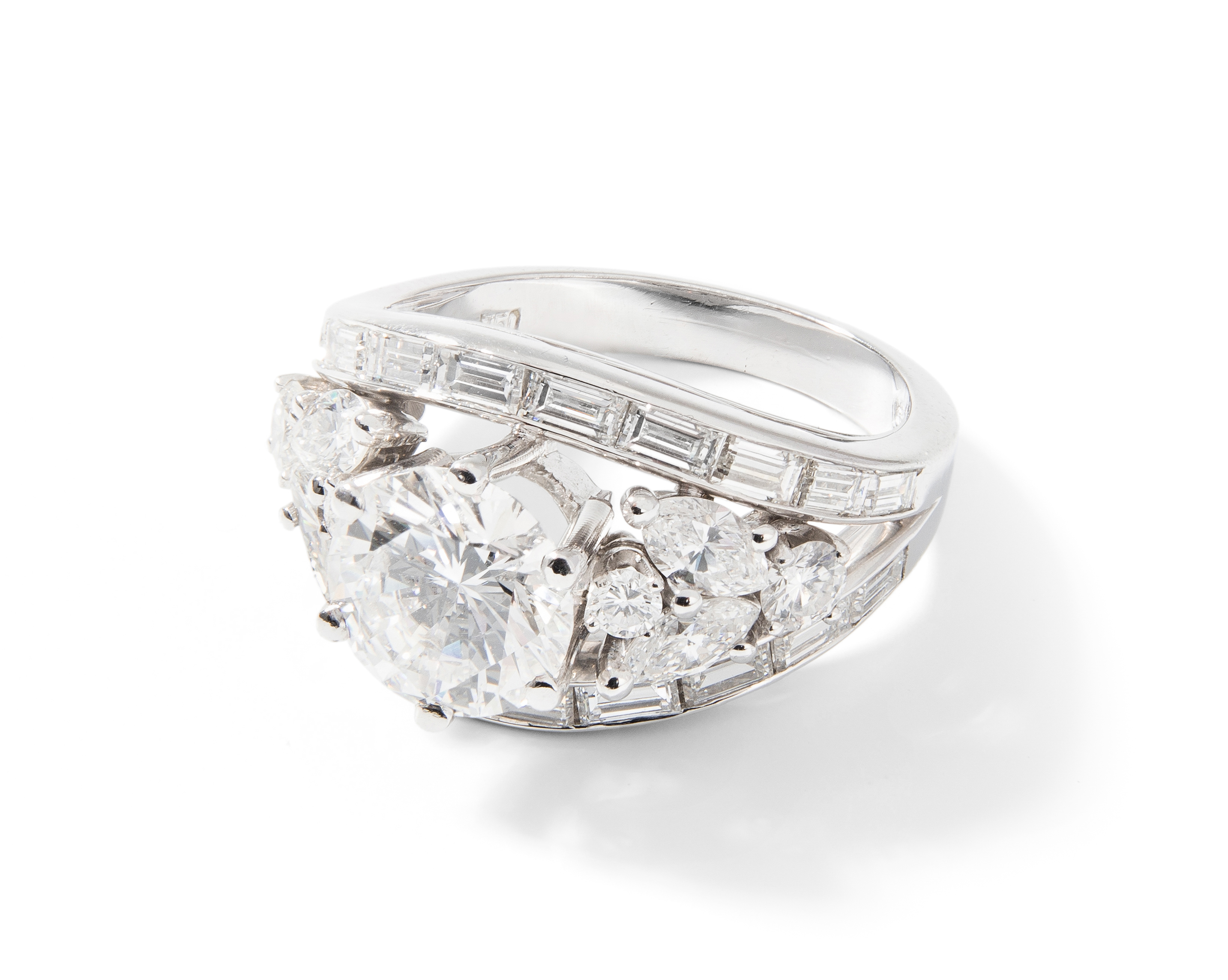 Gübelin. 750 Weissgold. 1 Brillant ca. 2.10 ct F/G-vvs. 4 Diamant-Navetten ca. 0.60 ct, 20 Diamant-Baguetten ca. 1.80 ct und 4 Brillanten ca. 0.35 ct. Diamantqualität F/G-vvs. Gr. 51, 9,4 g. Kopie Versicherungsschätzung Bucherer, Originalbox.