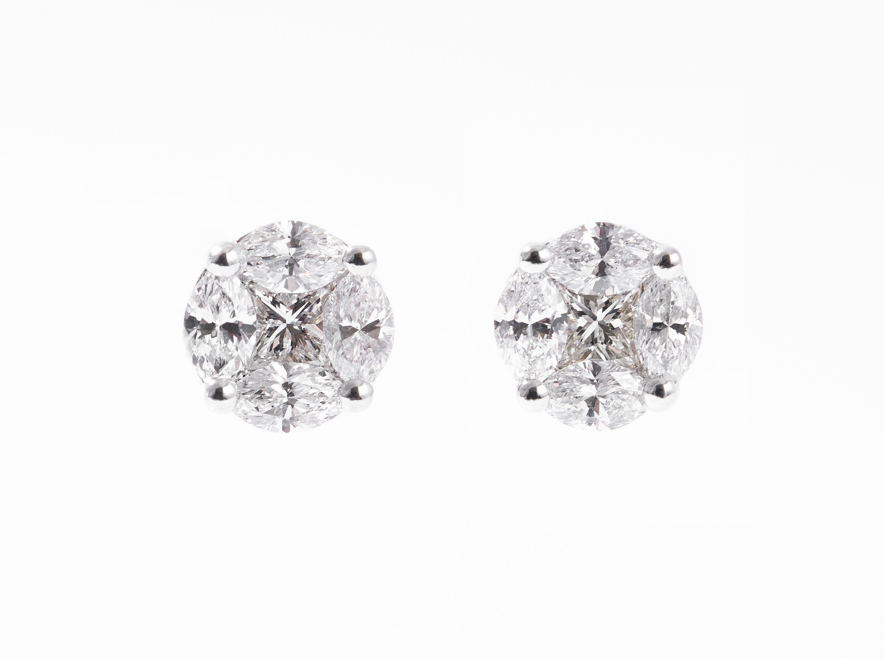 750 Weissgold. Je 1 Diamant-Princess und 4 Diamant-Navetten zus. 1.50 ct H-si. 2,9 g. Neuwertig.